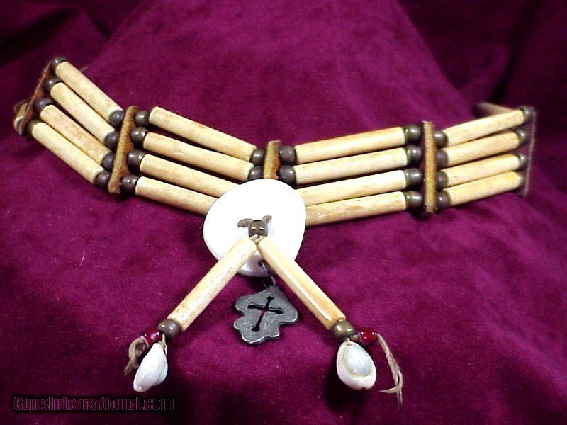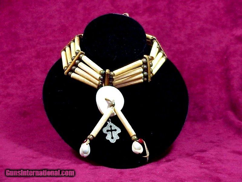 Description: CHOKER NECKLACE IS 12-1/2" WITH BUCKSKIN TIES 6 + 6-1/2 INCHES. NICE OLD PATINA. SOLD |