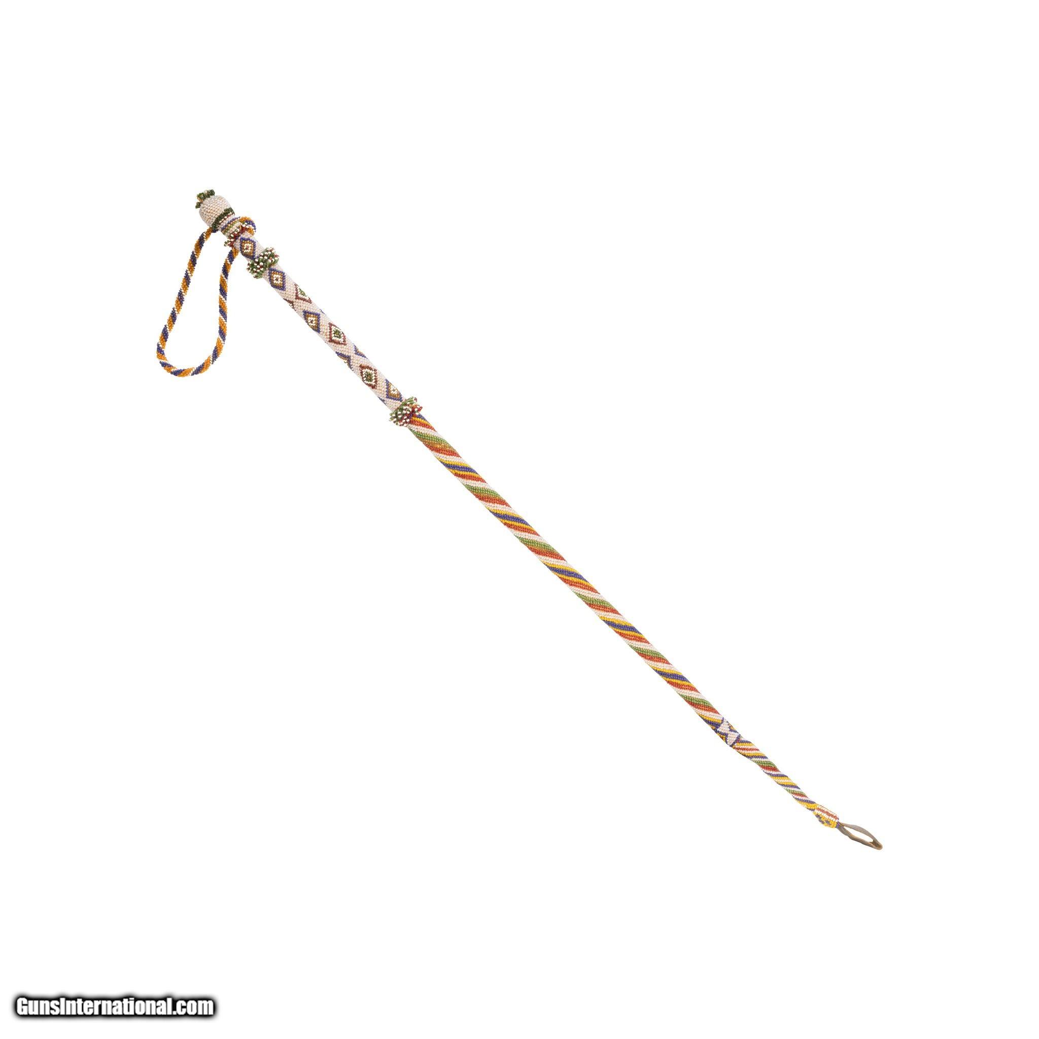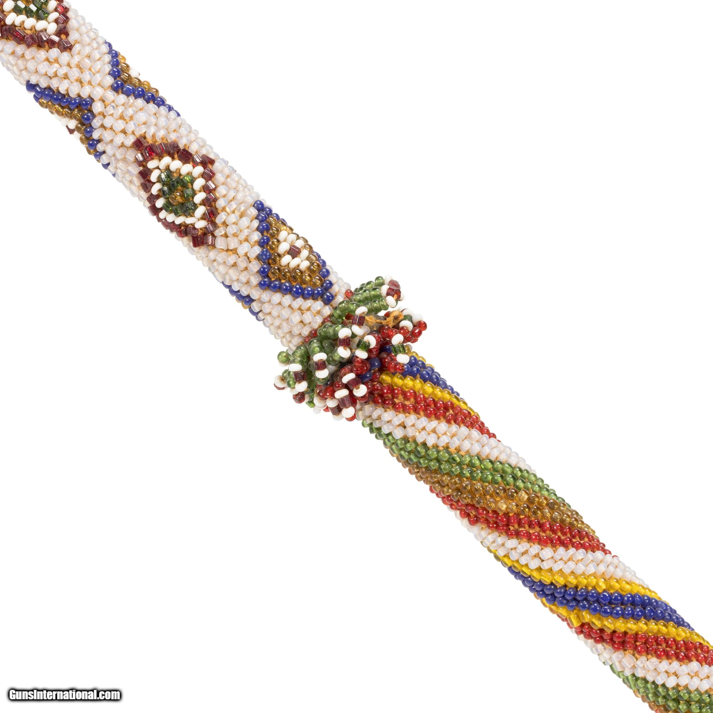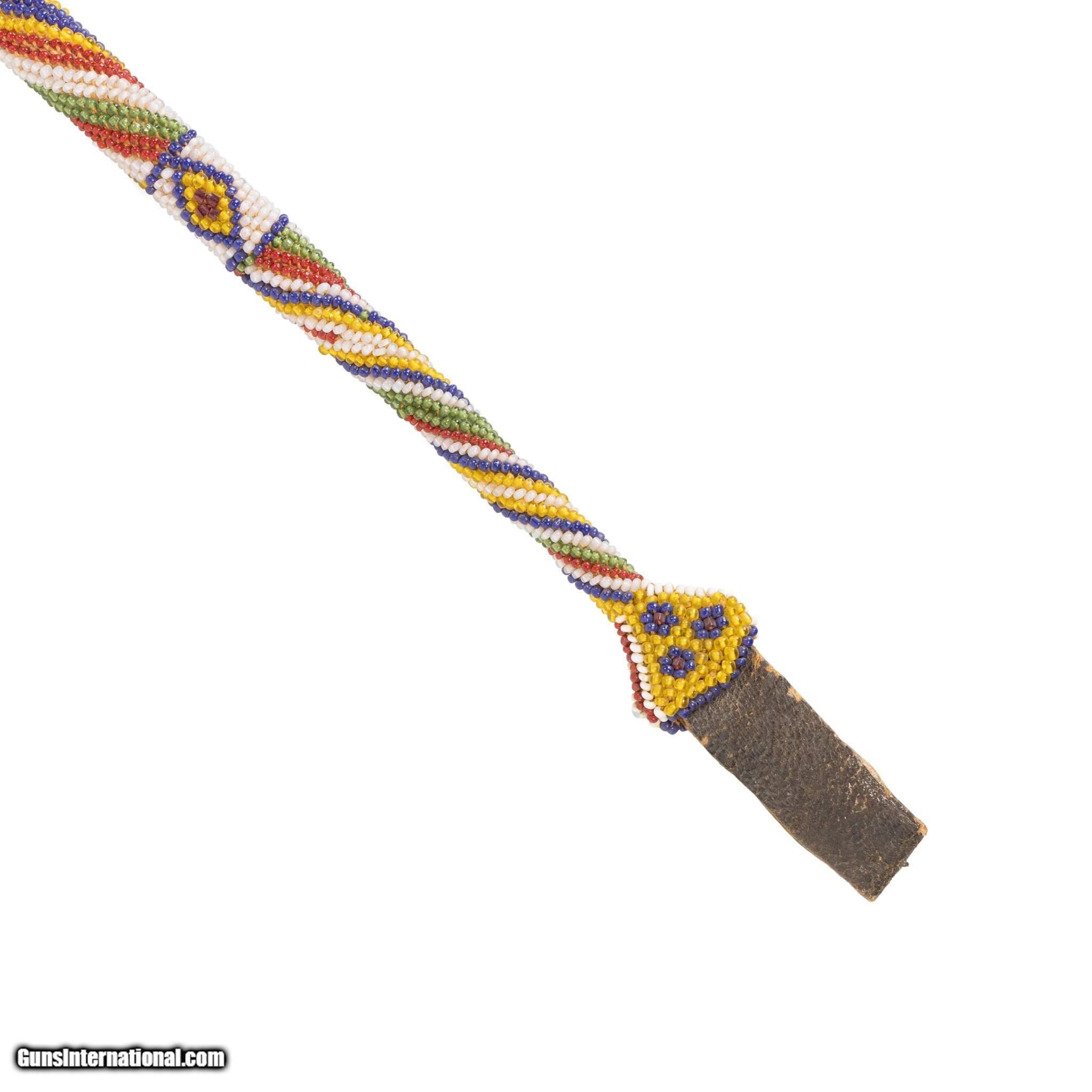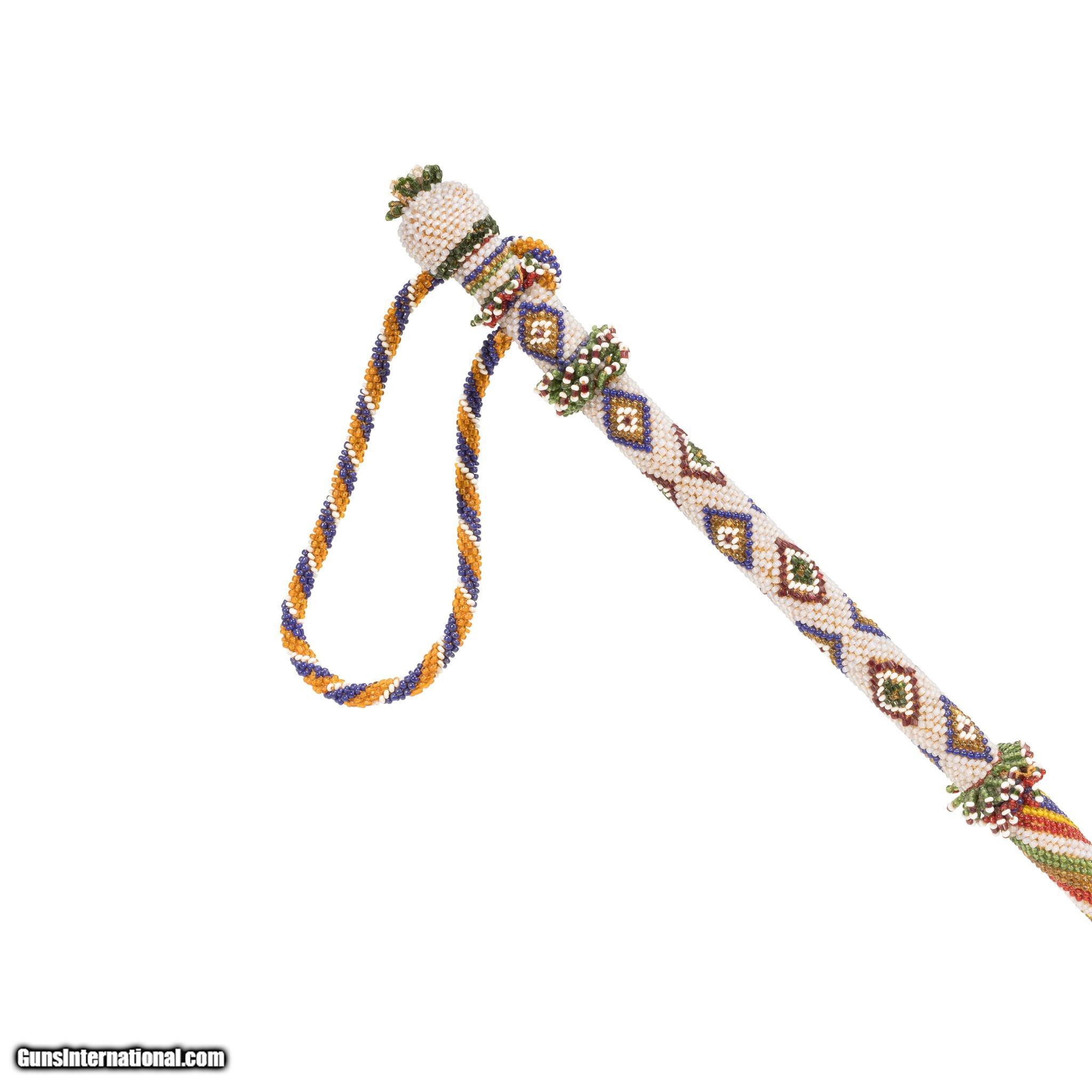 Description: Native American Kiowa Indian fully beaded horse quirt. This piece is gourd stitched in a classic design. Piece features lovely beadwork of multi-tiered diamonds, "feathers", and candy stripe. It is beaded over tapered carved limb with harness leather flapper and fully beaded wristband. A rare piece to find, perfect for collectors of Native American artifacts and handiwork. Would look excellent on display. Measures at 25" plus wristband. SOLD |