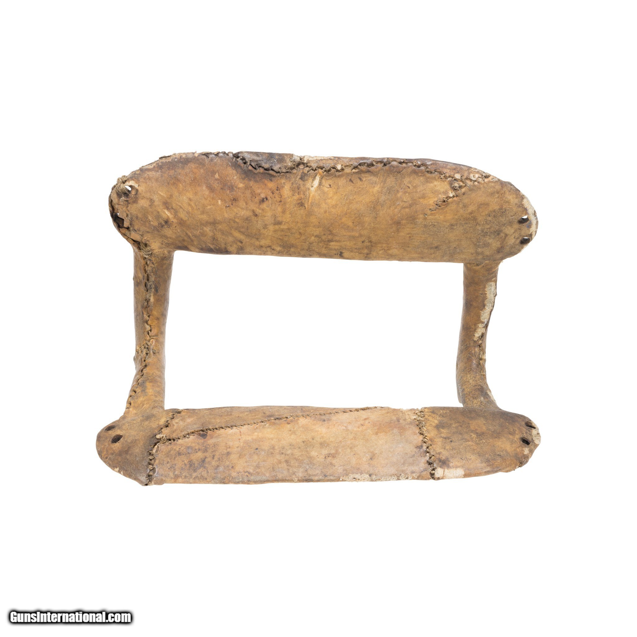 Description: Native American Nez Perce Indian rawhide, wood and steamed antler saddle. Very interesting piece with hand sewn rawhide and gaps where material underneath can be seen. Some mouse damage on one side, but still an incredible piece for a collection. Size: 12"W x 15"L x 10"h Inventory: AF1415_KB SOLD |