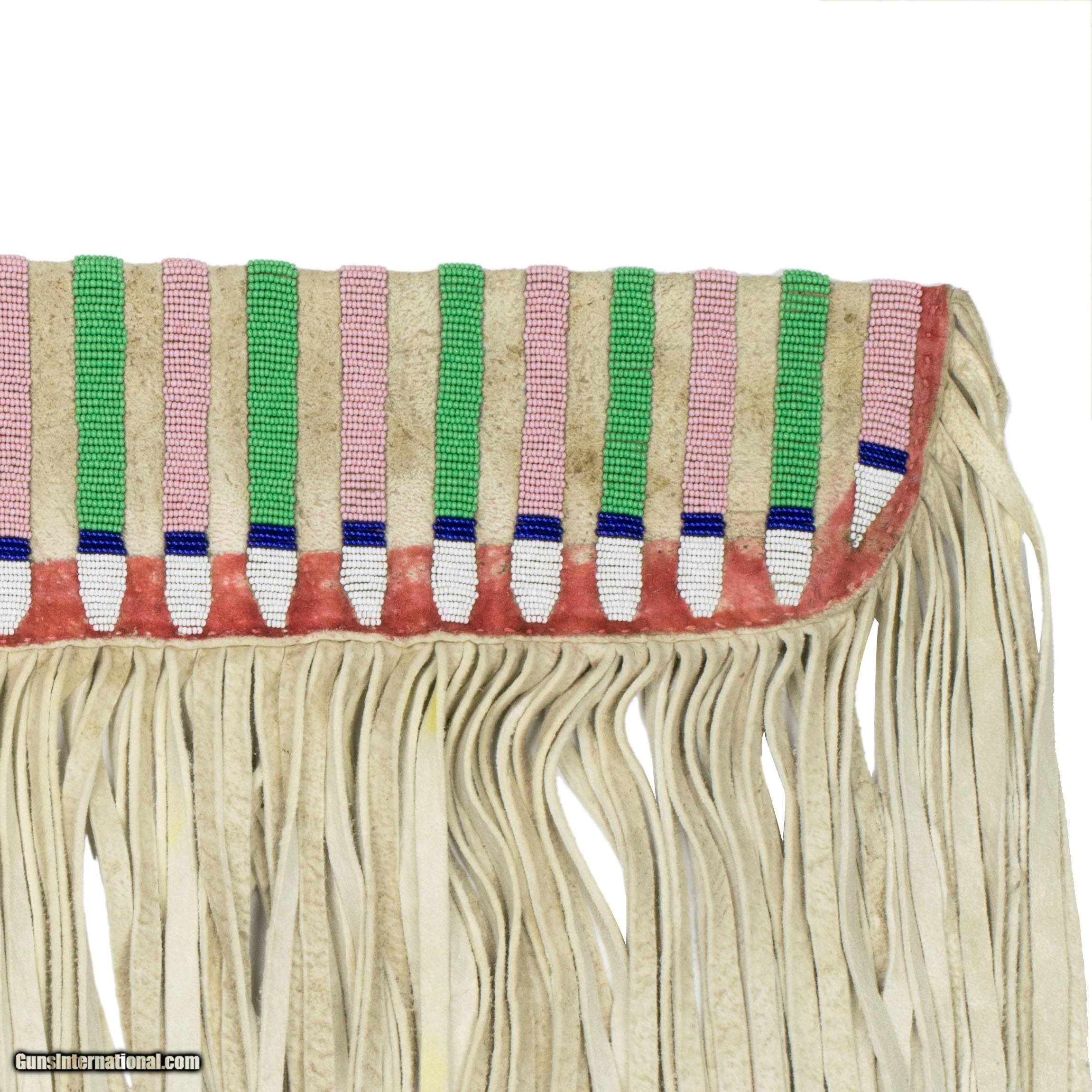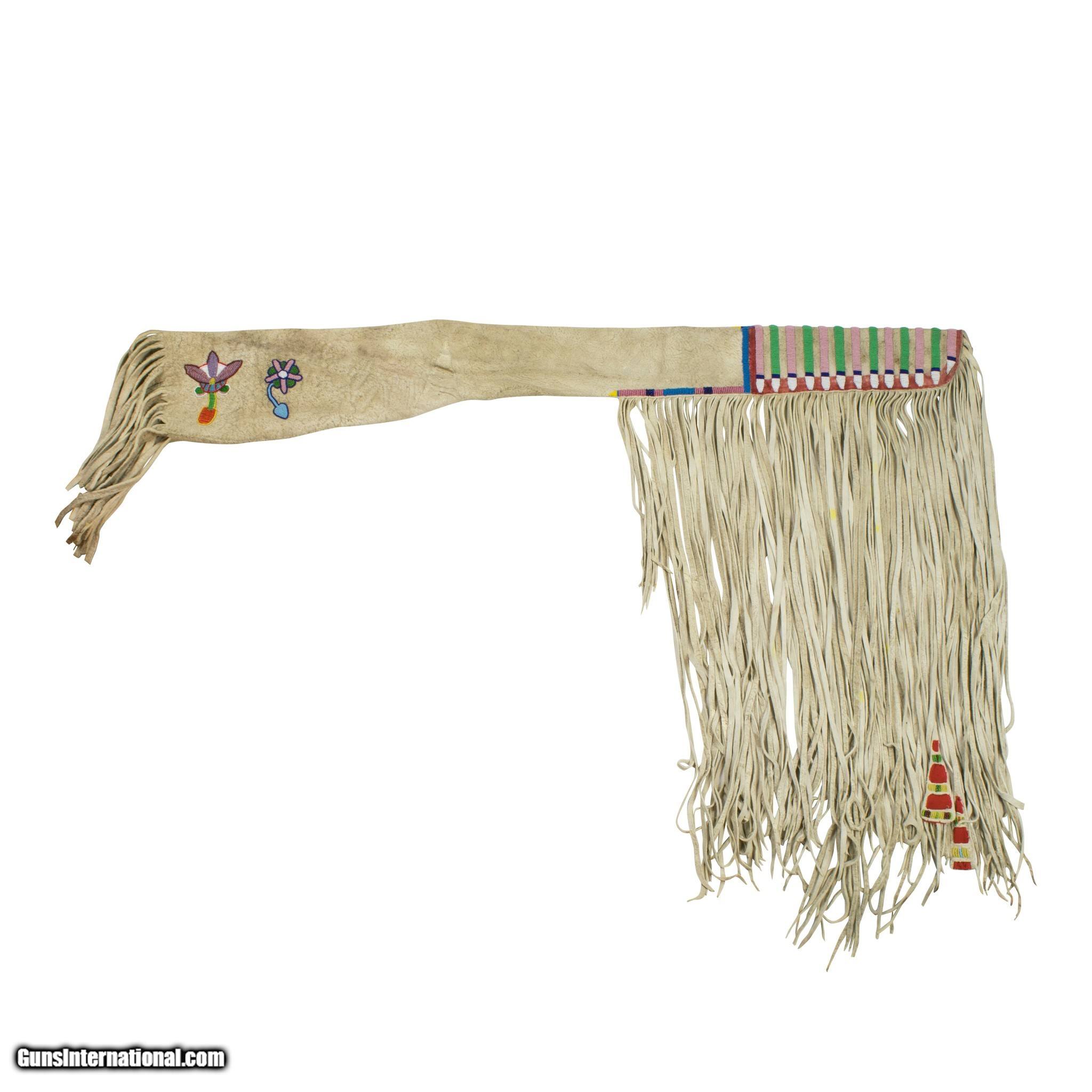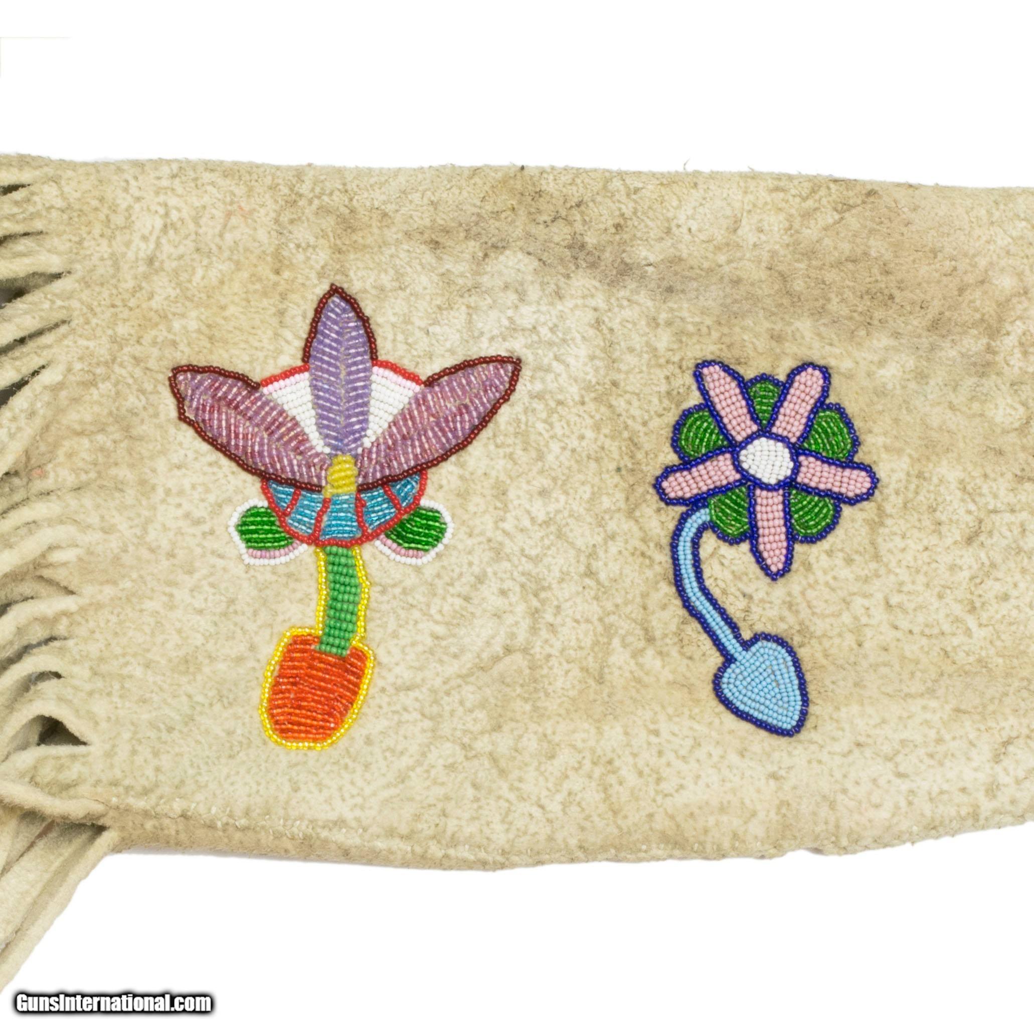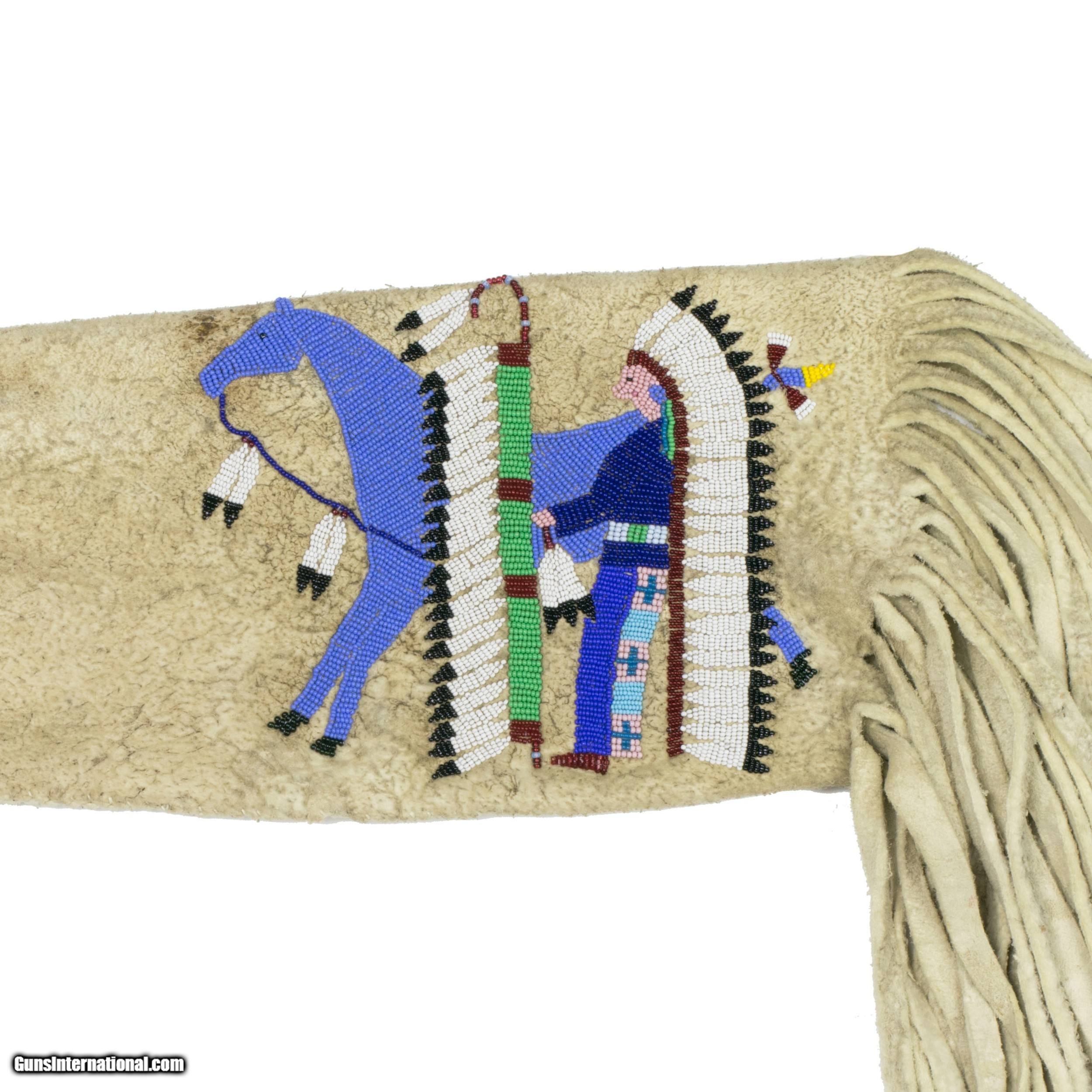 Description: Native American Indian rifle scabbard made with brain tanned elk hide. This piece features exceptional beading all over piece, including striped designs on the end, a warrior with a double trailer headdress and coupstick war pony on one side, and beautiful florals on the other. This piece has a long fringe on end and and shorter fringe at the opening. Amazing piece of Western American and Native American history. Can be used again, or great for collections or display. Size: 48"L x 8", long fringe is 30" Inventory: A1031 SOLD |