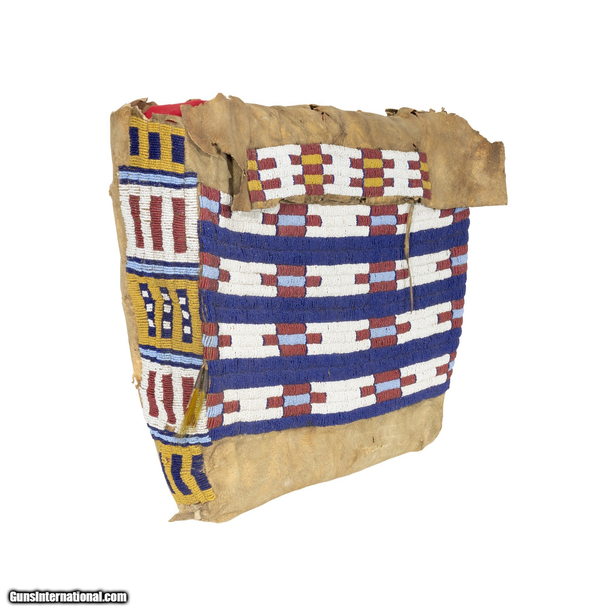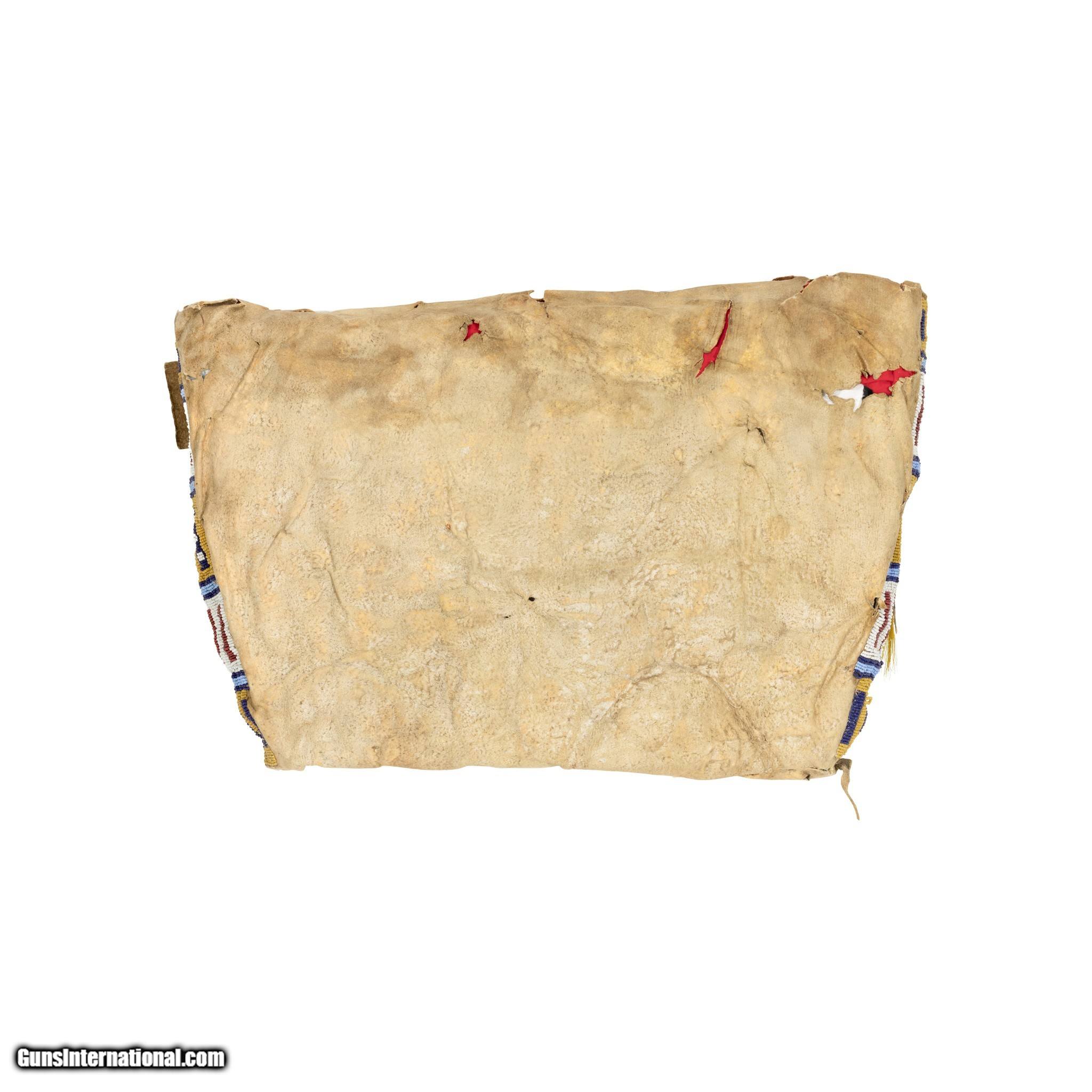 Description: Large early Native American Northern Plains Indian teepee bag on brain tanned hide with nearly full coverage beaded design. The hide is stiff and showing wear, however beading is intact and makes a great display piece. Featuring colors of dark blue, light blue, white, red, and yellow with geometric designs. Would make a great addition to a handmade indigenous collection or would display nicely in a Southwestern or rustic home, cabin, or lodge. 19th century. Size: 21" x 14" Family Owned & Operated Cisco’s Gallery deals in the rare, exceptional, and one-of-a-kind pieces that define the history of America and the Old West. Our pieces range from American Indian to Cowboy Western and include original items of everyday life, commerce, art, and warfare that tamed America’s frontier. Our 14,000 square foot gallery opened in 1996 in beautiful Coeur d’Alene, Idaho. Personal Service Cisco’s operates on old fashioned values – honesty and integrity, and all of our items are backed by our money back guarantee. We appreciate the opportunity to earn your business. Whether you desire assistance with a jewelry purchase, choosing a gift, identification, or even selling – we hope to be your trusted source. SOLD |