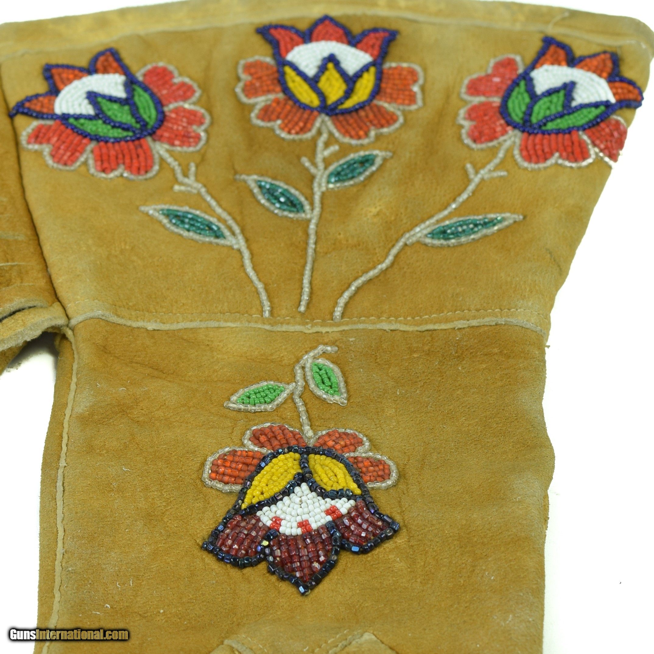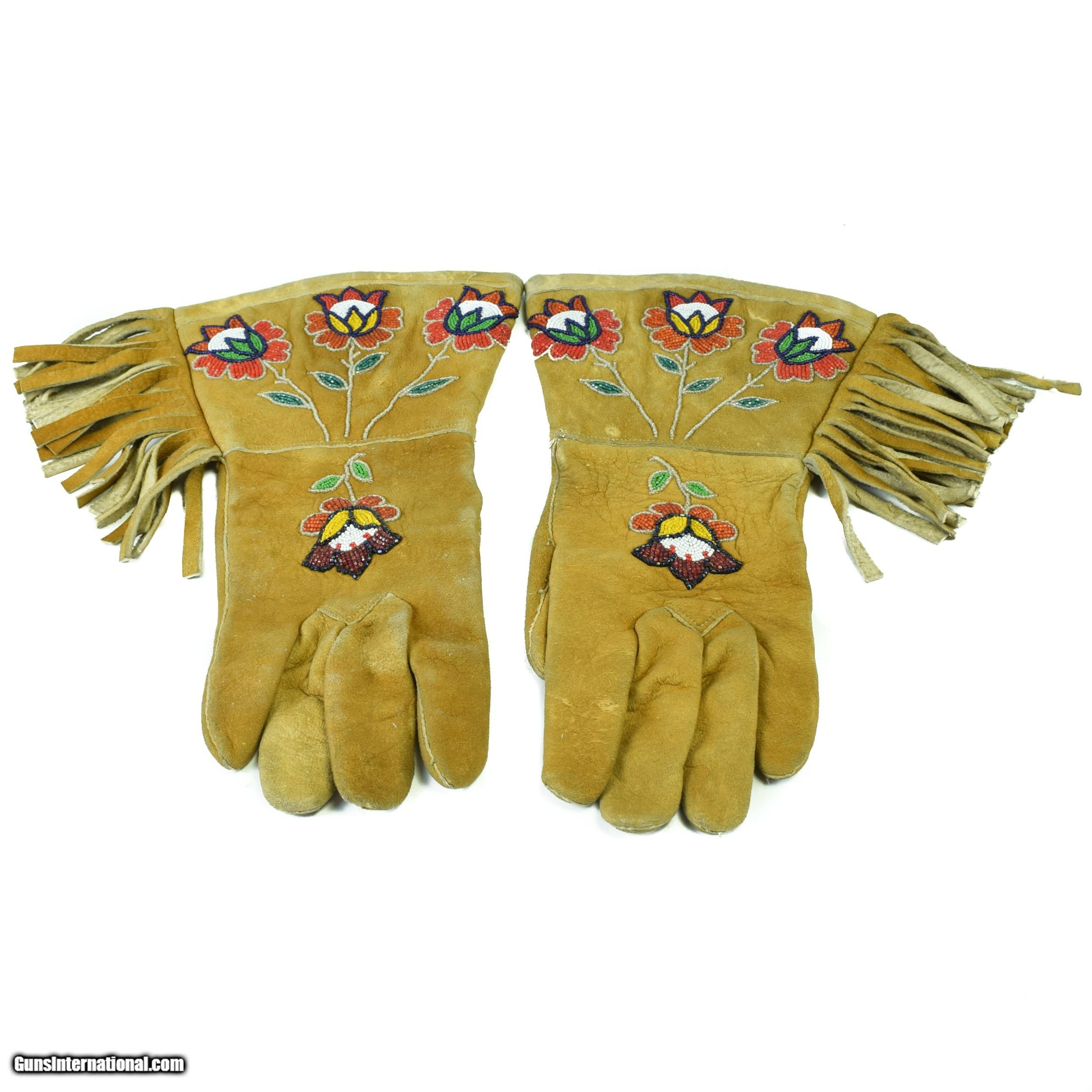 Description: Smoke-tanned elk gauntlets, handmade by Native American Plateau Indians. Features a floral design portraying red and yellow flowers on green leafy stems. Made during the1920s. Man's size. The United States Cavalry riders wore gauntlet gloves as part of their uniform, introducing the clothing style to plains tribes who turned the gloves into spectacular works of art with painstaking beadwork. As skilled horsemen, Sioux and other plains tribes took great pride in their horses and often wore symbols that celebrated their warrior and rider status, such as these gauntlets. Western cowboys and rodeo performers adopted the beaded gauntlets made by Native People into their fancy wear. Family Owned & Operated Cisco’s Gallery deals in the rare, exceptional, and one-of-a-kind pieces that define the history of America and the Old West. Our pieces range from American Indian to Cowboy Western and include original items of everyday life, commerce, art, and warfare that tamed America’s frontier. We have been selling on eBay since 2008 with over 2,000 positive reviews. Our 14,000 square foot gallery is located in beautiful Coeur d’Alene, Idaho. Personal Service Cisco’s operates on old fashioned values – honesty and integrity, and all of our items are backed by our money back guarantee. We appreciate the opportunity to earn your business. Whether you desire assistance with a jewelry purchase, choosing a gift, identification, or even selling – we hope to be your trusted source. SOLD |