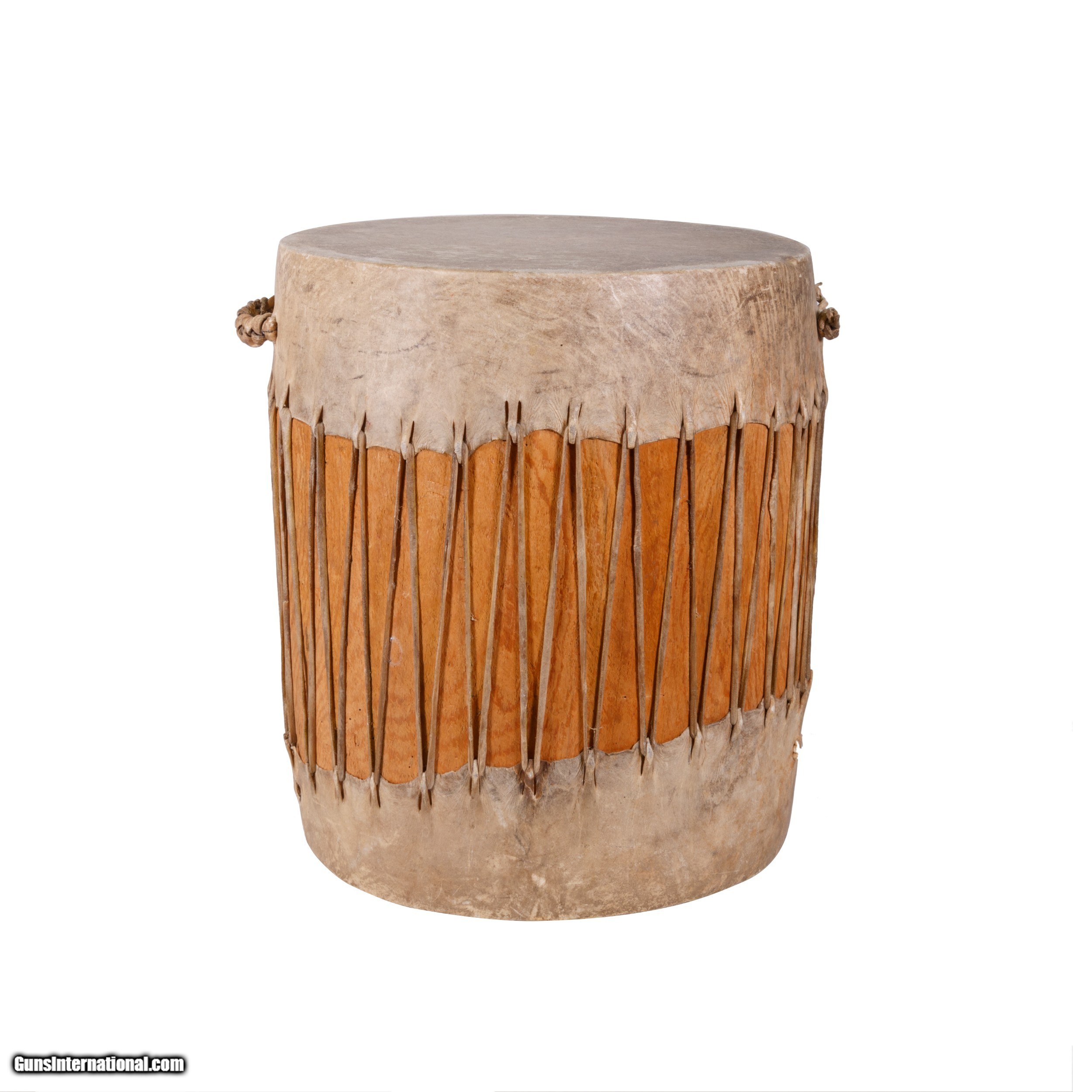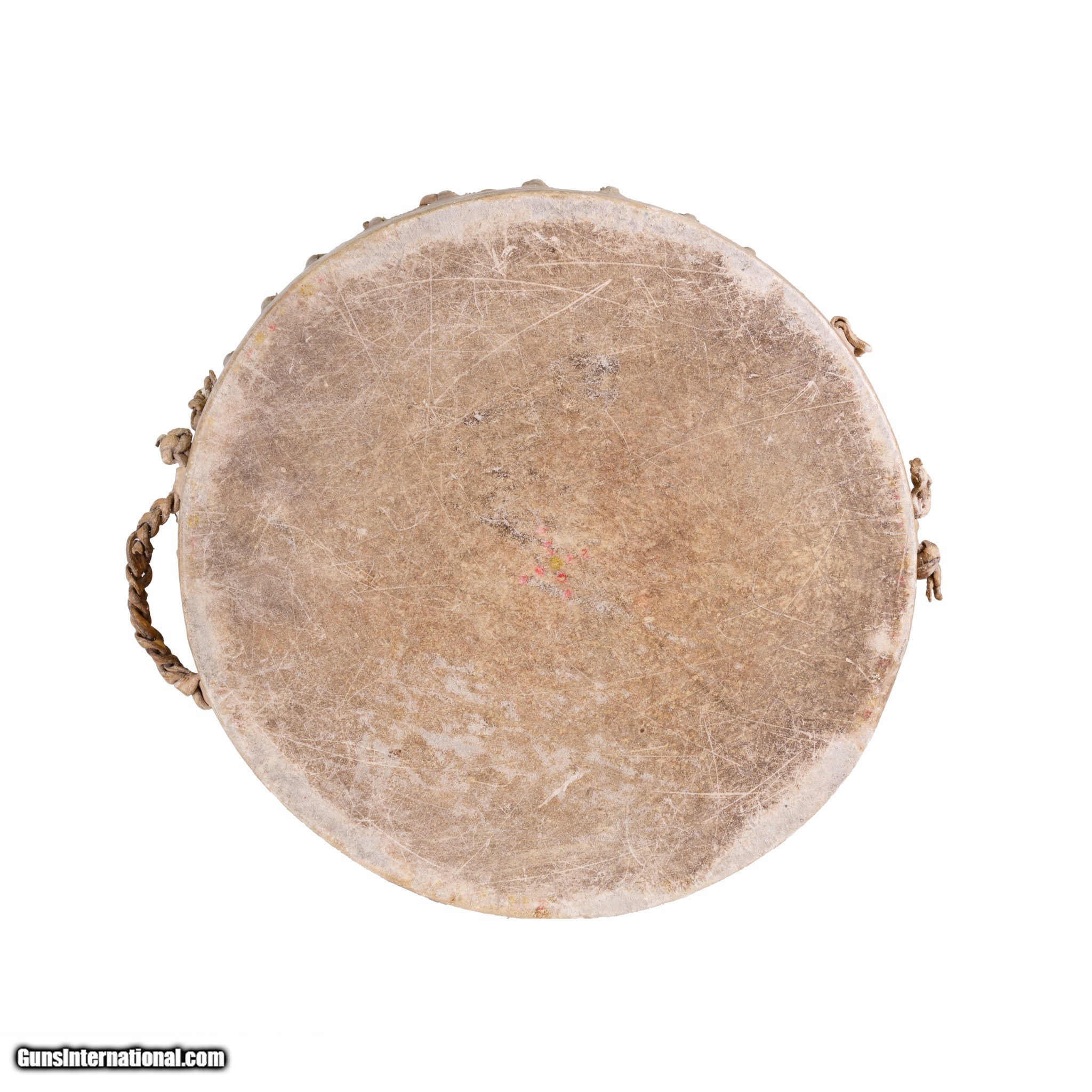 Description: Native American Pueblo Indian drum. Drum has seen some use, has a great aged look to it. Piece was acquired by Charles Graves, an Indian agent in New Mexico in the 1930's. One handle is missing. Great for display and collectors of Native American artifacts. Measures 13 x 17" SOLD |