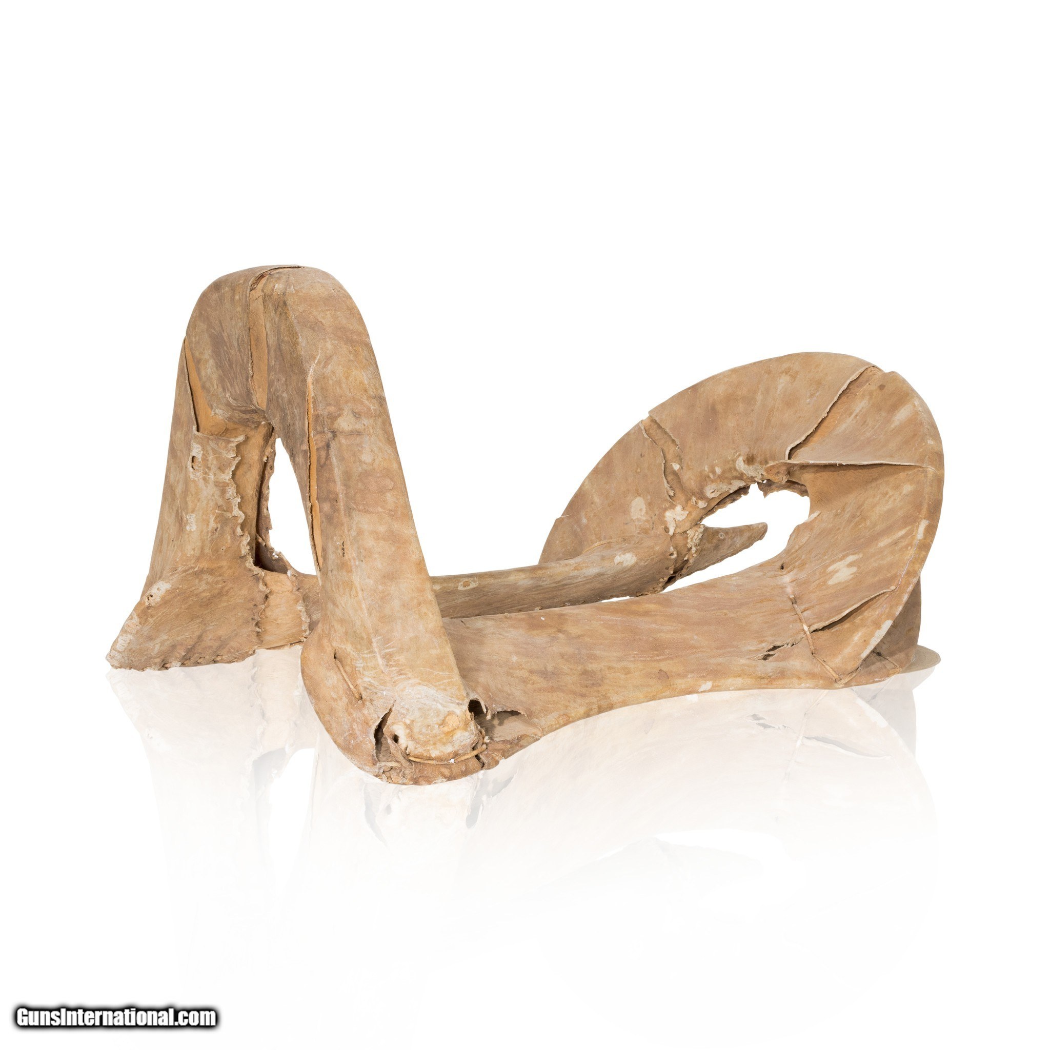 Description: Native American Indian rawhide saddle. Rawhide is stretched over a rounded wood frame. We are not sure of tribal affiliation, but is done in a plains style. Piece is complete but does have some splits in hide from age and shrinking. Excellent for display in a handmade Native American collection. Size: 18" x 12' x 10"H SOLD |