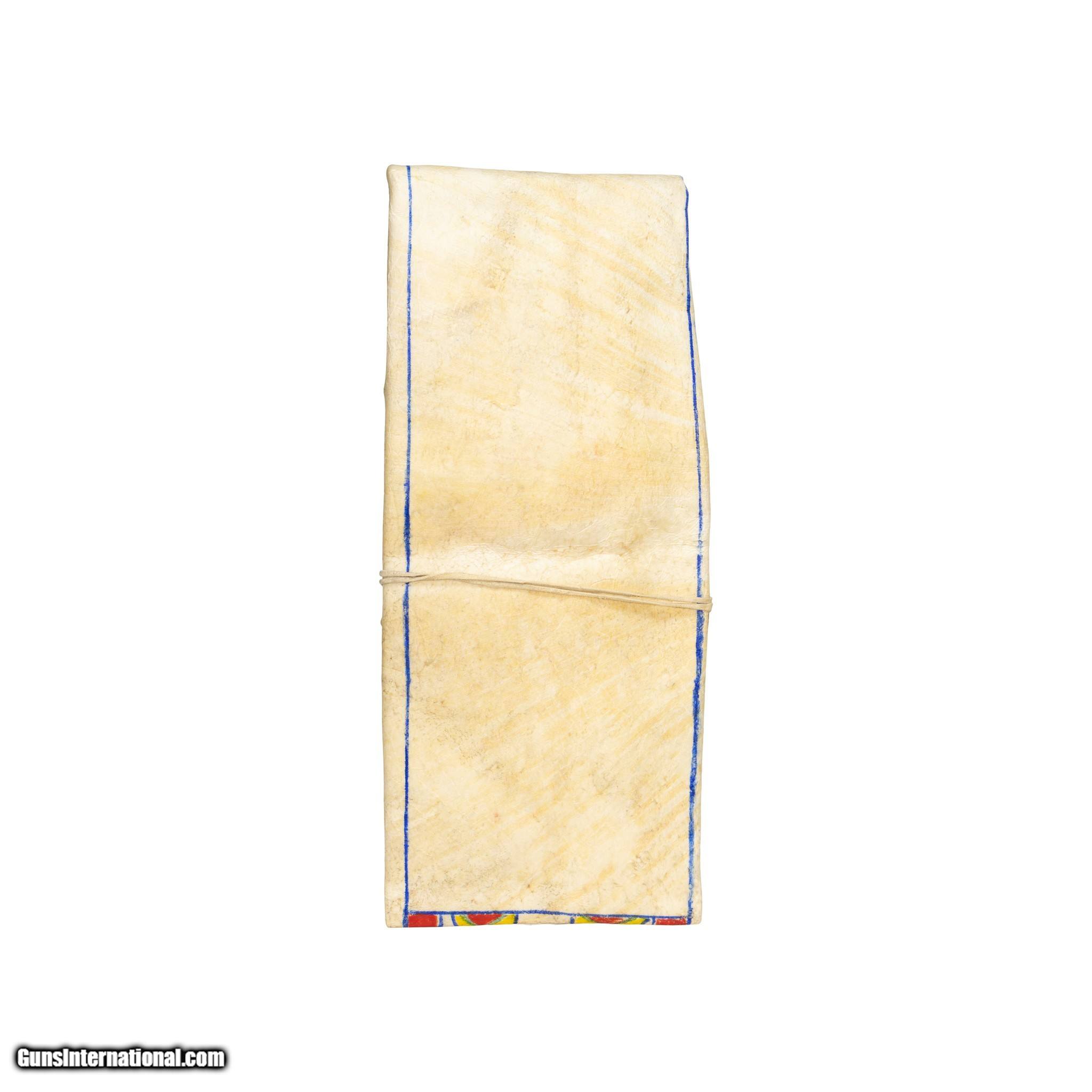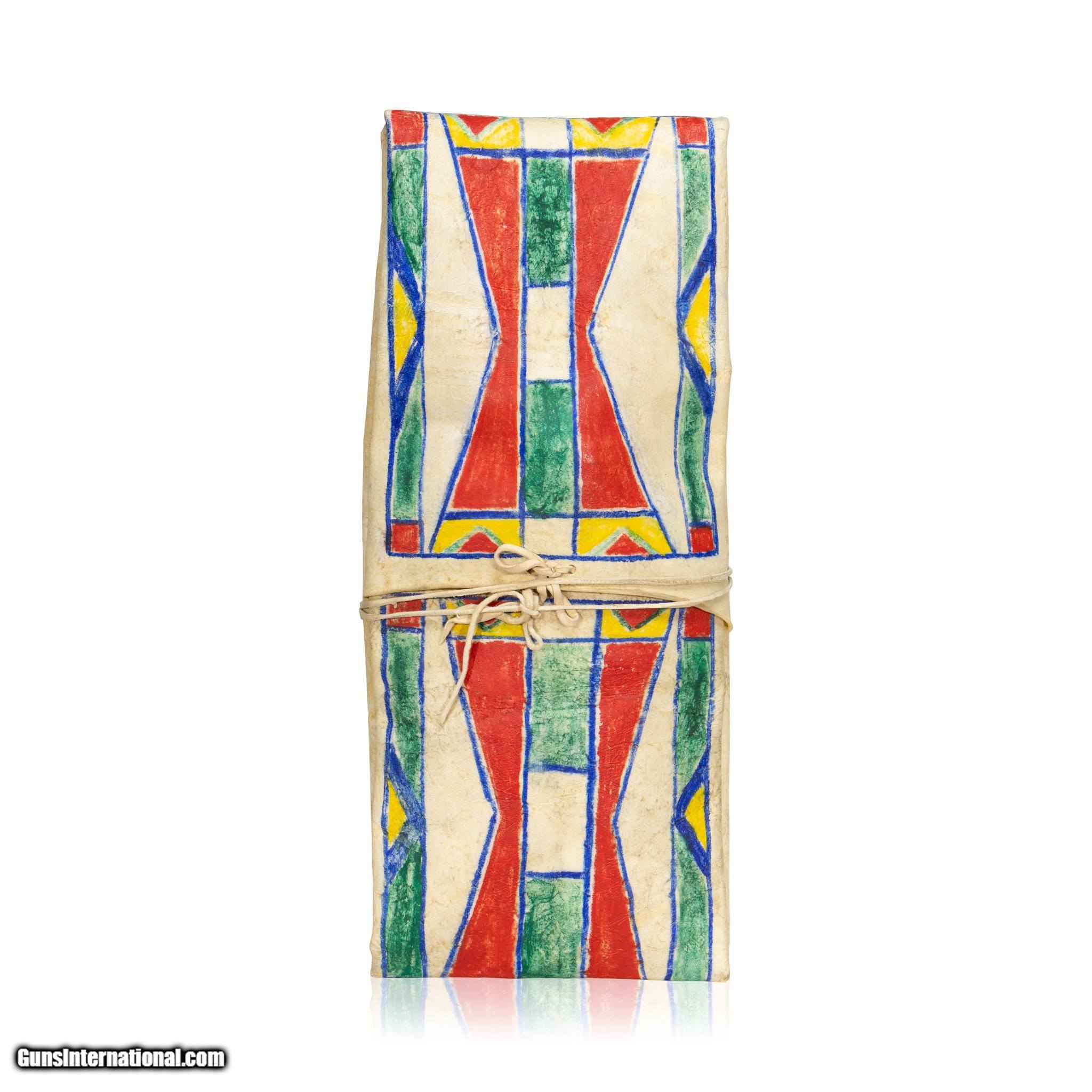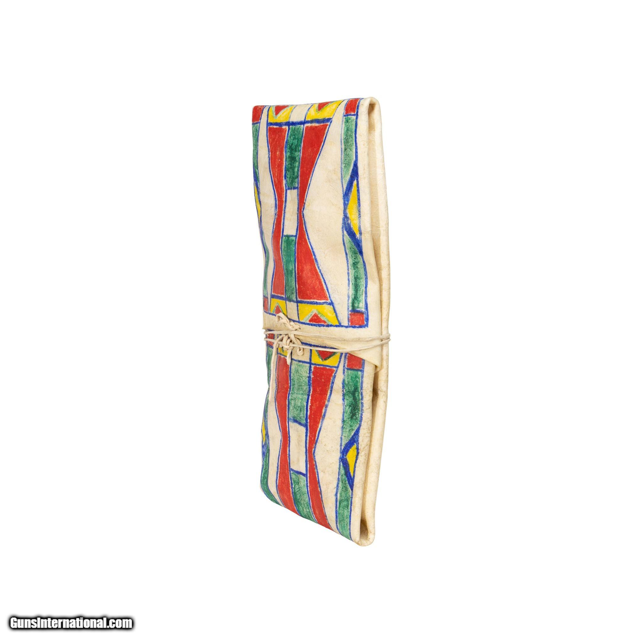 Description: Nice, thick buffalo bison parfleche envelope with polychrome painting from the Native American Indian Umatilla tribe. This piece shows a thick buffalo bison parfleche rawhide which has been beautifully covered on the front with traditional geometric patterns. Colors of red, green, yellow with blue outlining and pattern. Folded as a traditional parfleche envelope and has an Indian tanned hide tie around the center. The blue outline extends to the back in a rectangular border. Good condition and well preserved with bright colors. Smaller side 23 1/4"L x 10 1/2"W x 4"thick Family Owned & Operated Cisco’s Gallery deals in the rare, exceptional, and one-of-a-kind pieces that define the history of America and the Old West. Our pieces range from American Indian to Cowboy Western and include original items of everyday life, commerce, art, and warfare that tamed America’s frontier. Our 14,000 square foot gallery opened in 1996 in beautiful Coeur d’Alene, Idaho. Personal Service Cisco’s operates on old fashioned values – honesty and integrity, and all of our items are backed by our money back guarantee. We appreciate the opportunity to earn your business. Whether you desire assistance with a jewelry purchase, choosing a gift, identification, or even selling – we hope to be your trusted source. SOLD |