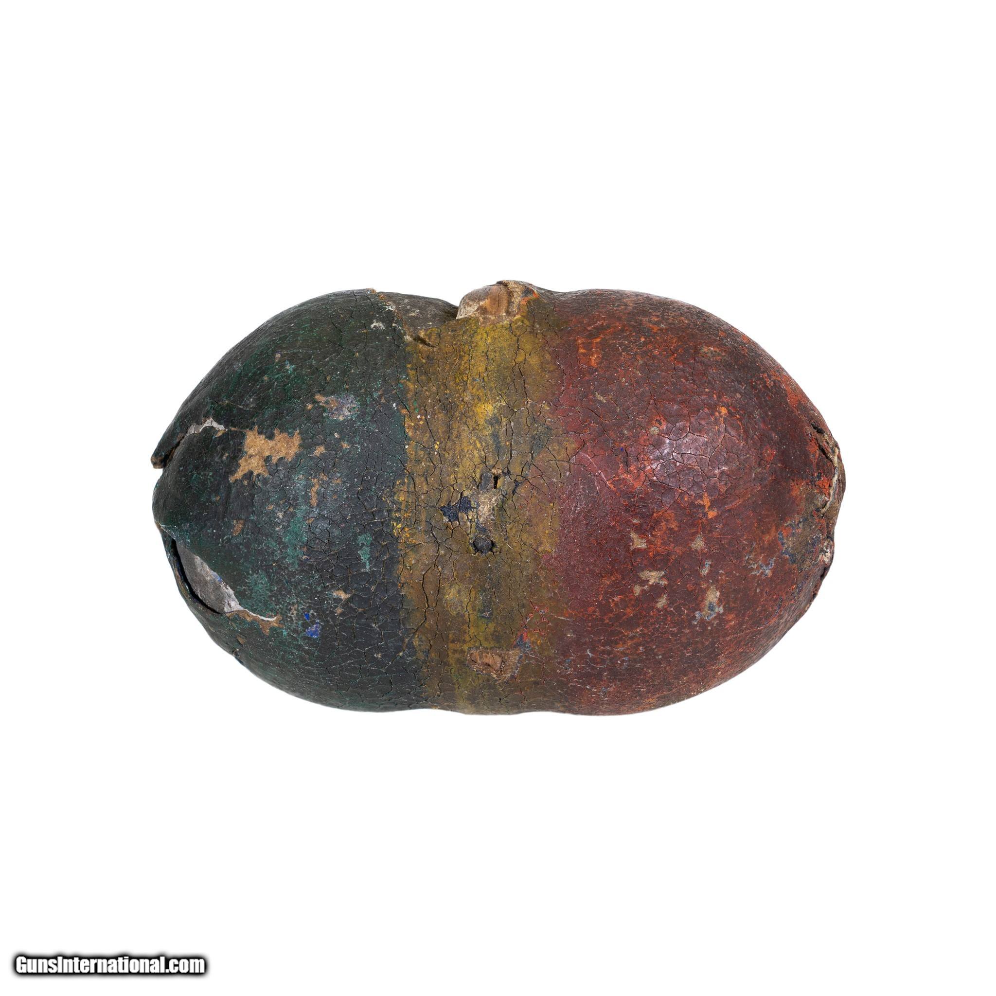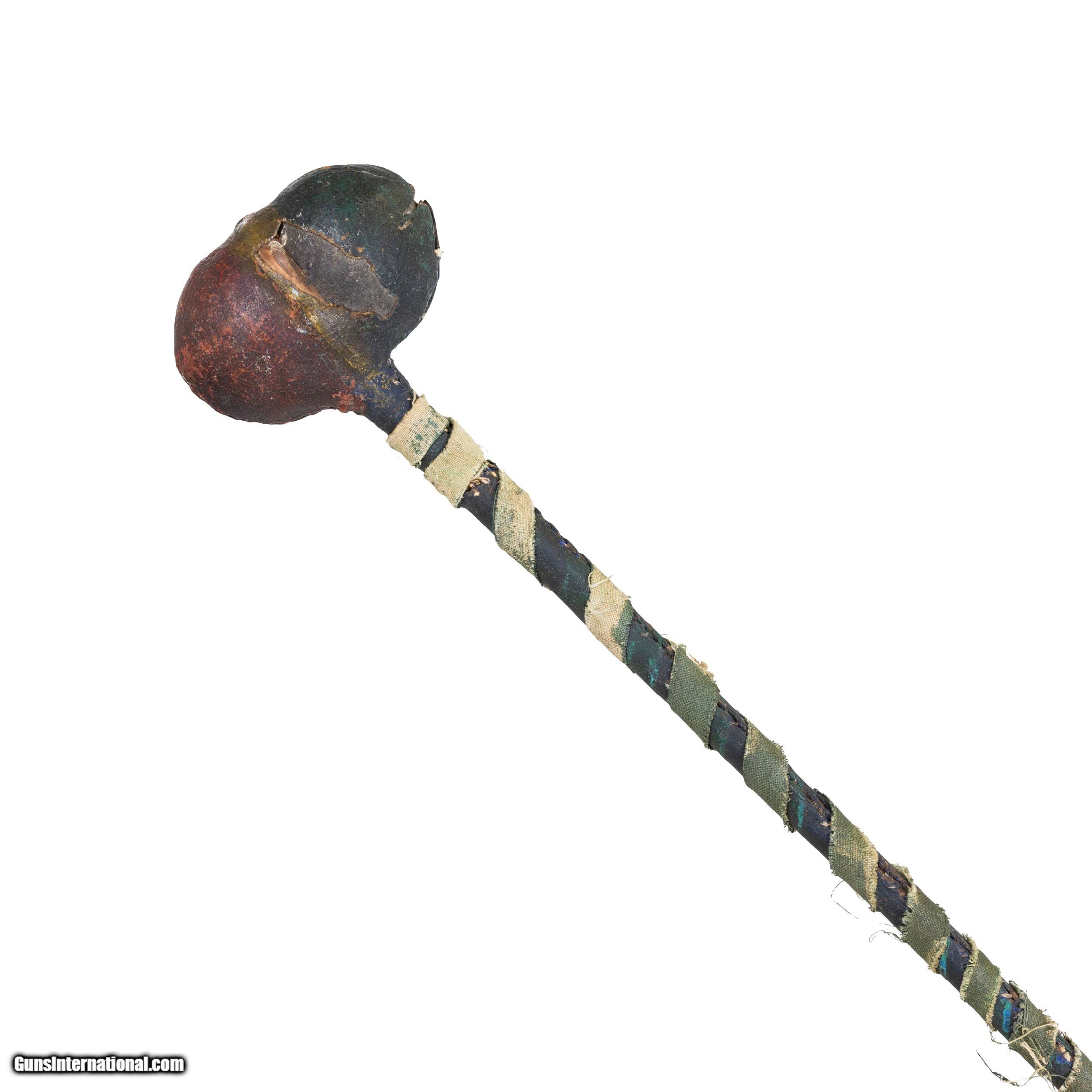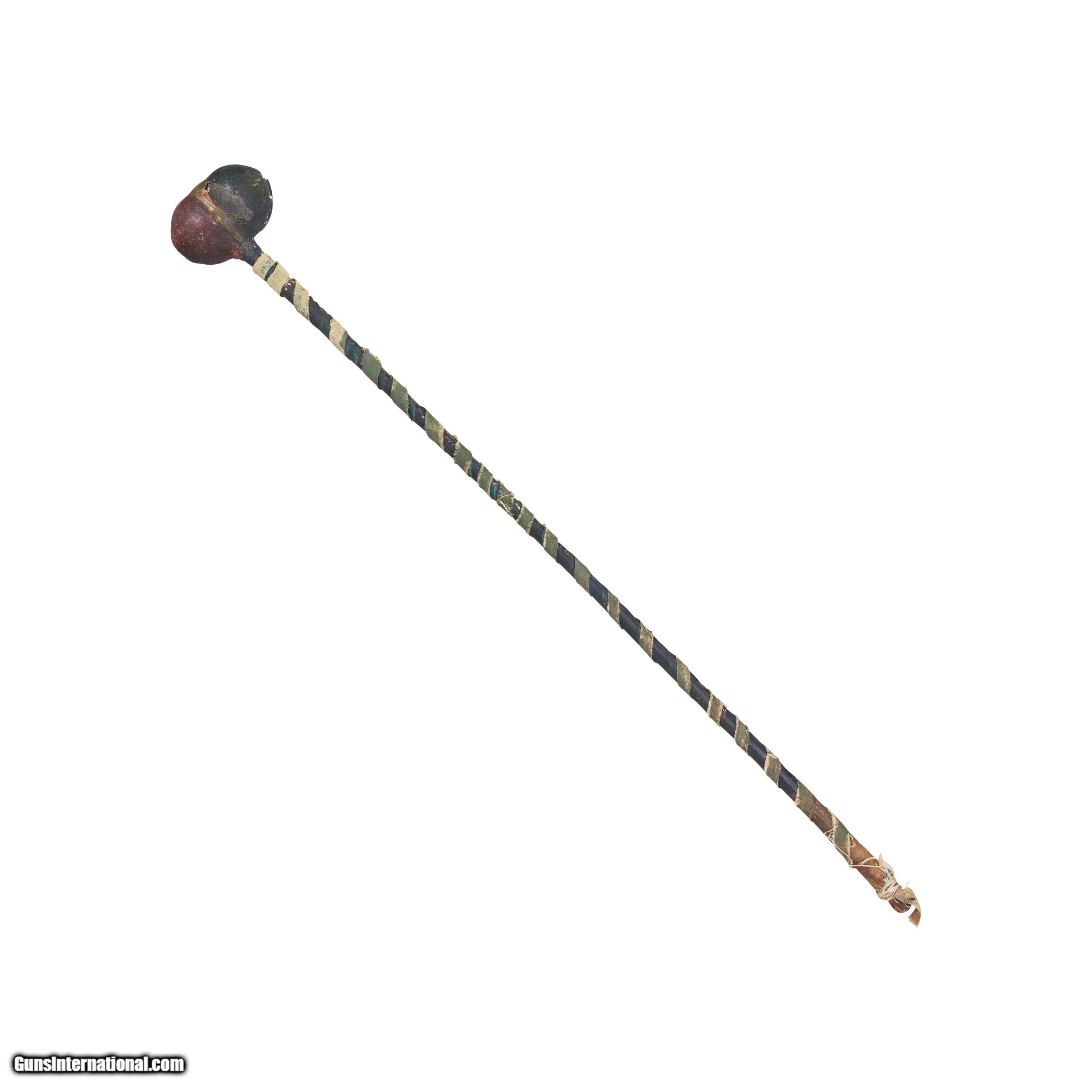 Description: Unusual War club with hide wrapped stone. Green tent canvas wrapped over rawhide and stick shaft. Ex Michigan collection. 3" Head 237" Overall. SOLD |