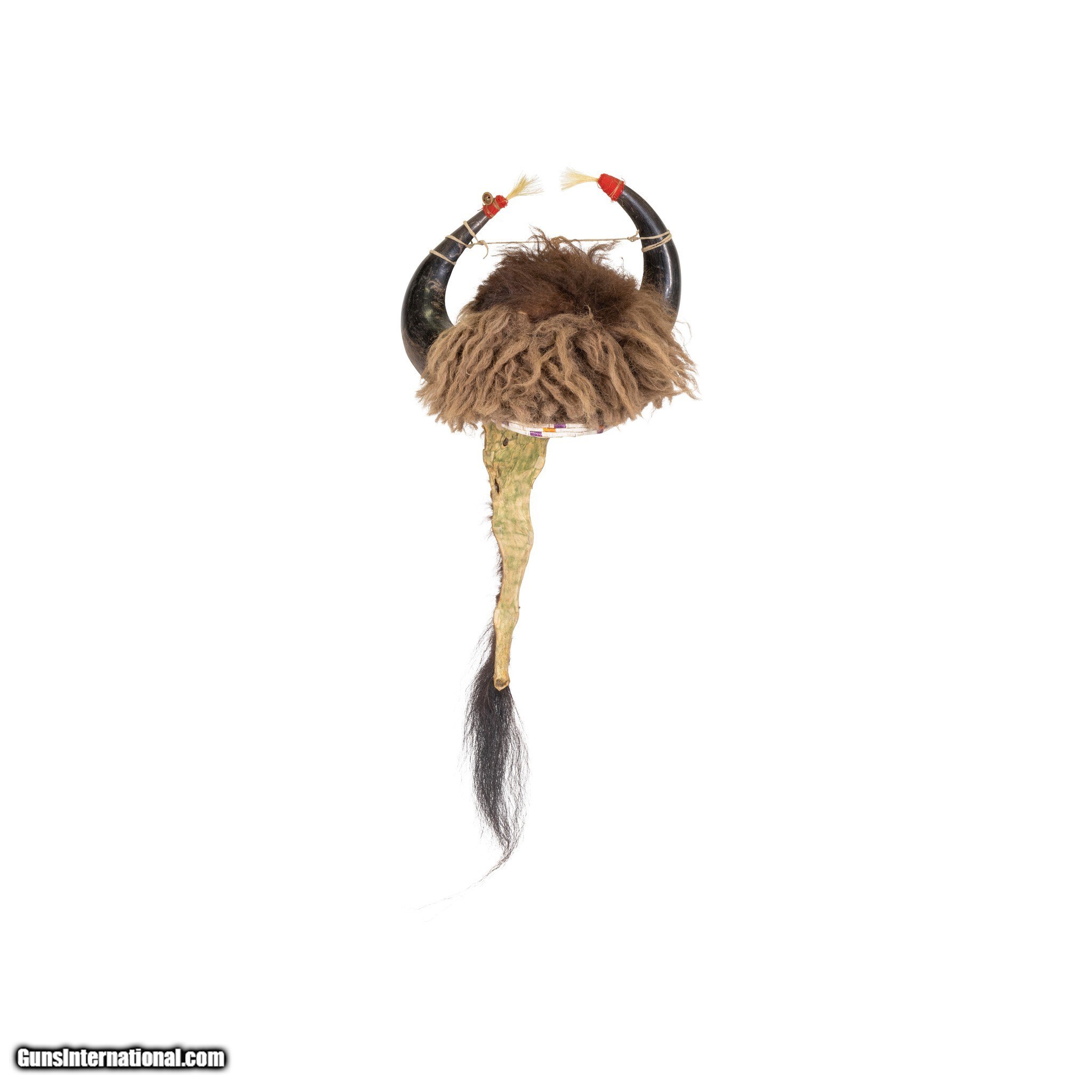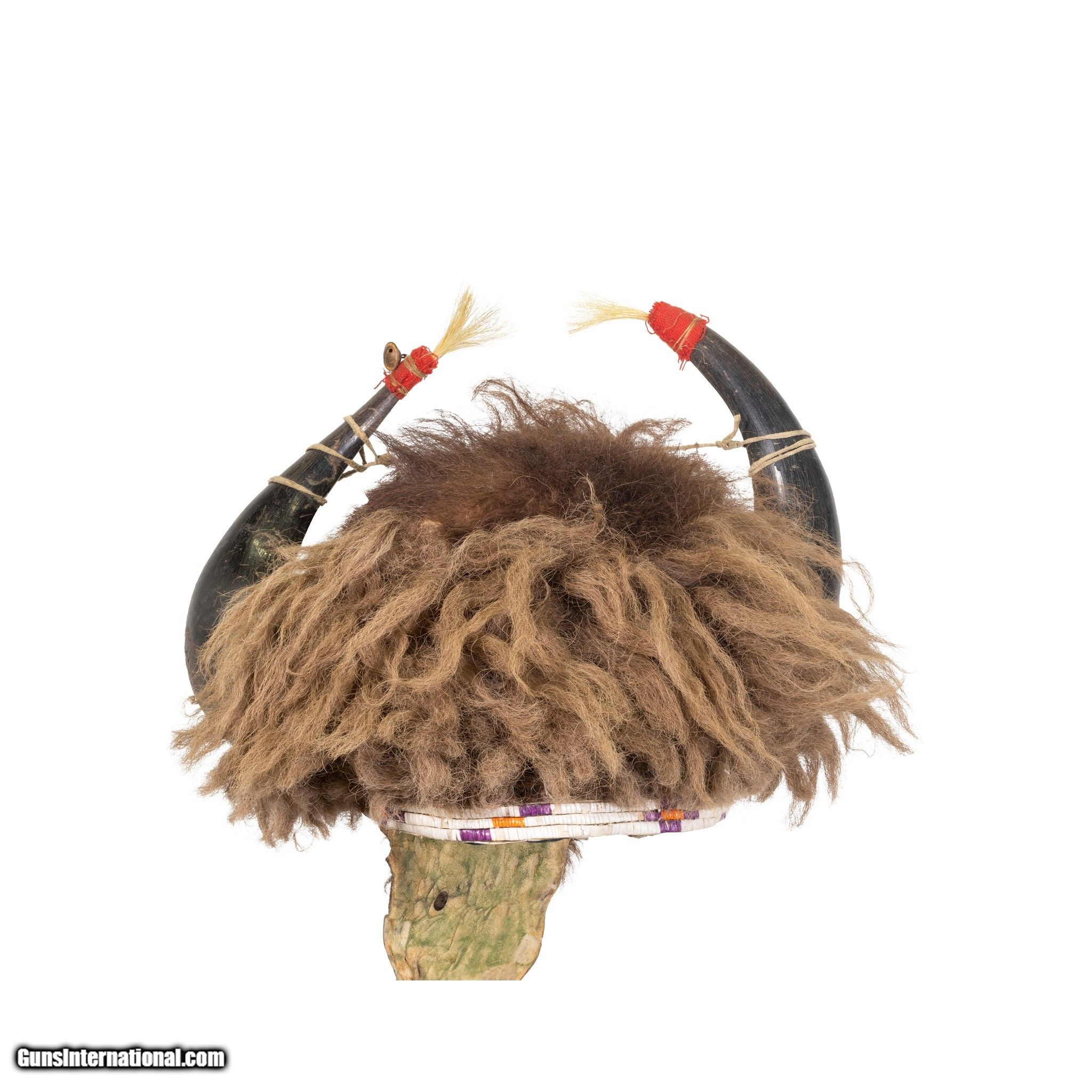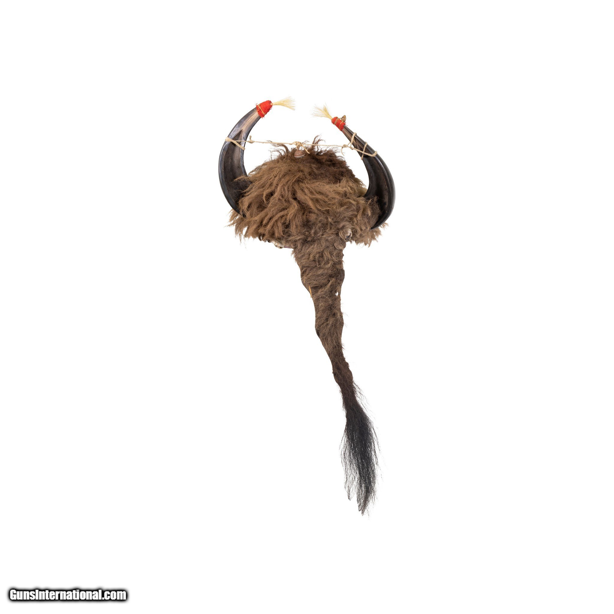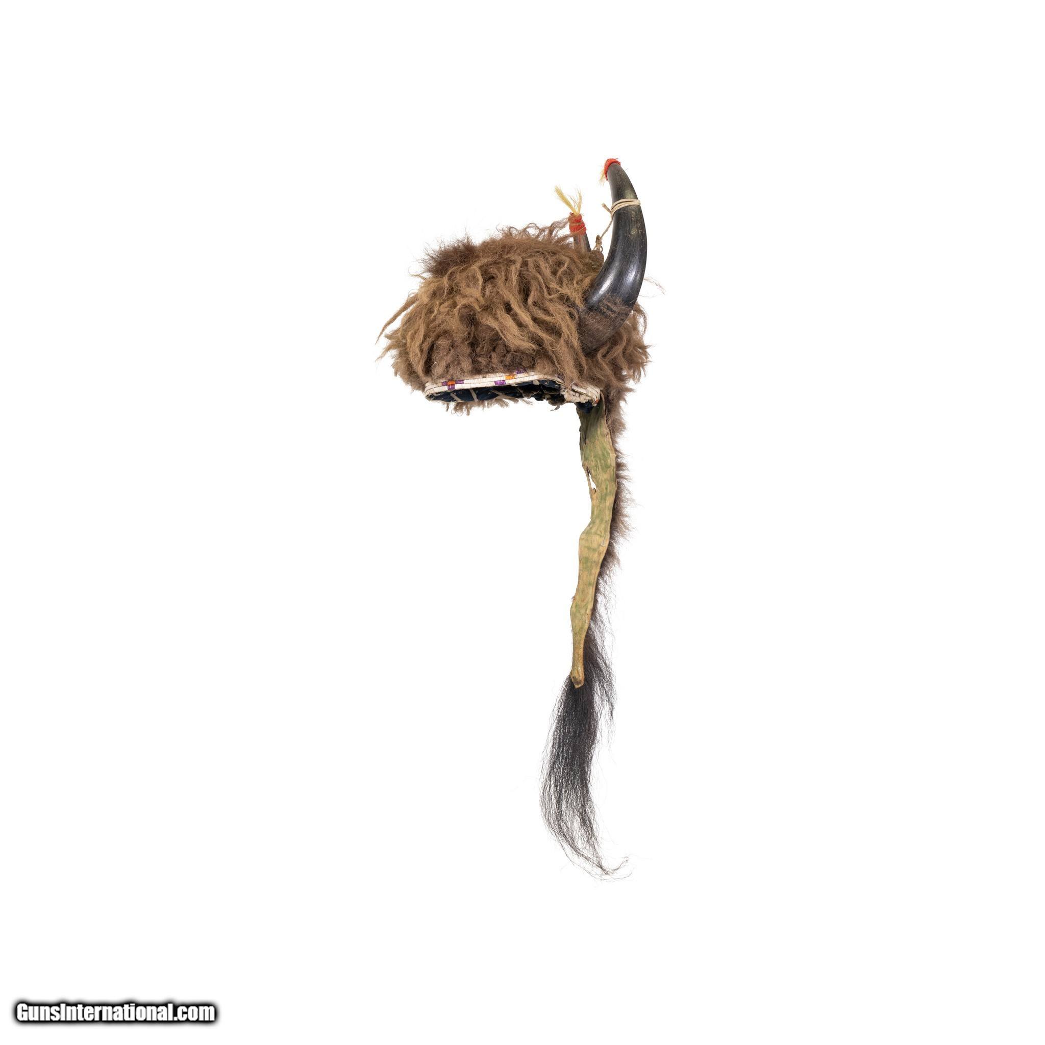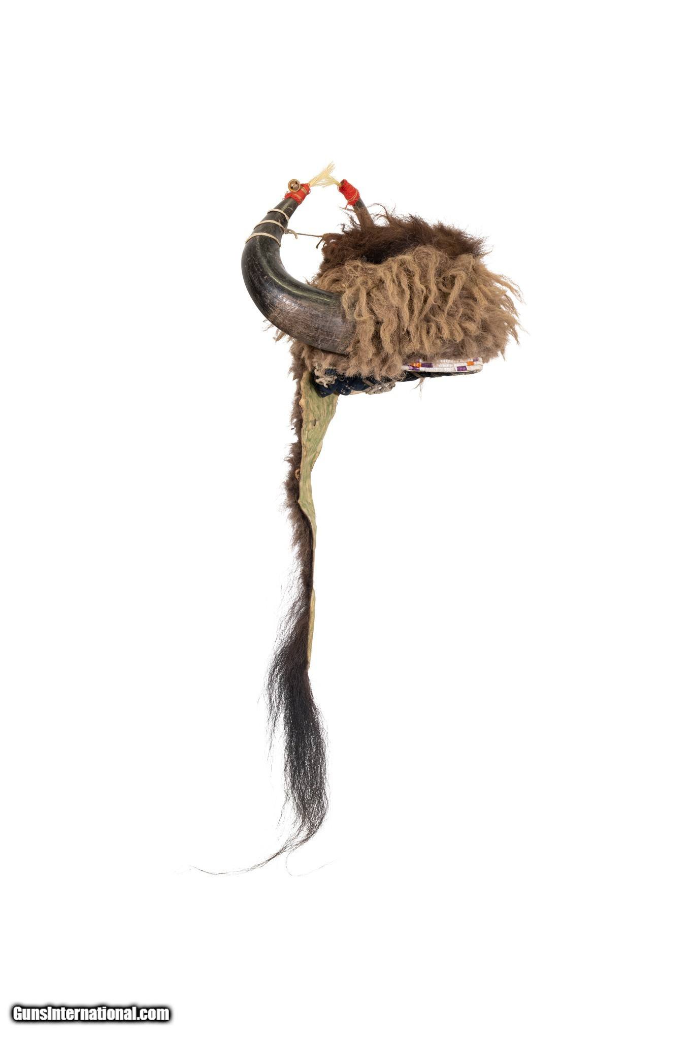 Description: Northern Plains, probably Sioux, split horn headdress with quilled brow band with horn tips, flour sack lining attached by brain tanned thongs. Green ochre on buffalo tail drop. Red stroud and yellow dyed horse hair tips. A used and decorative piece. SOLD |