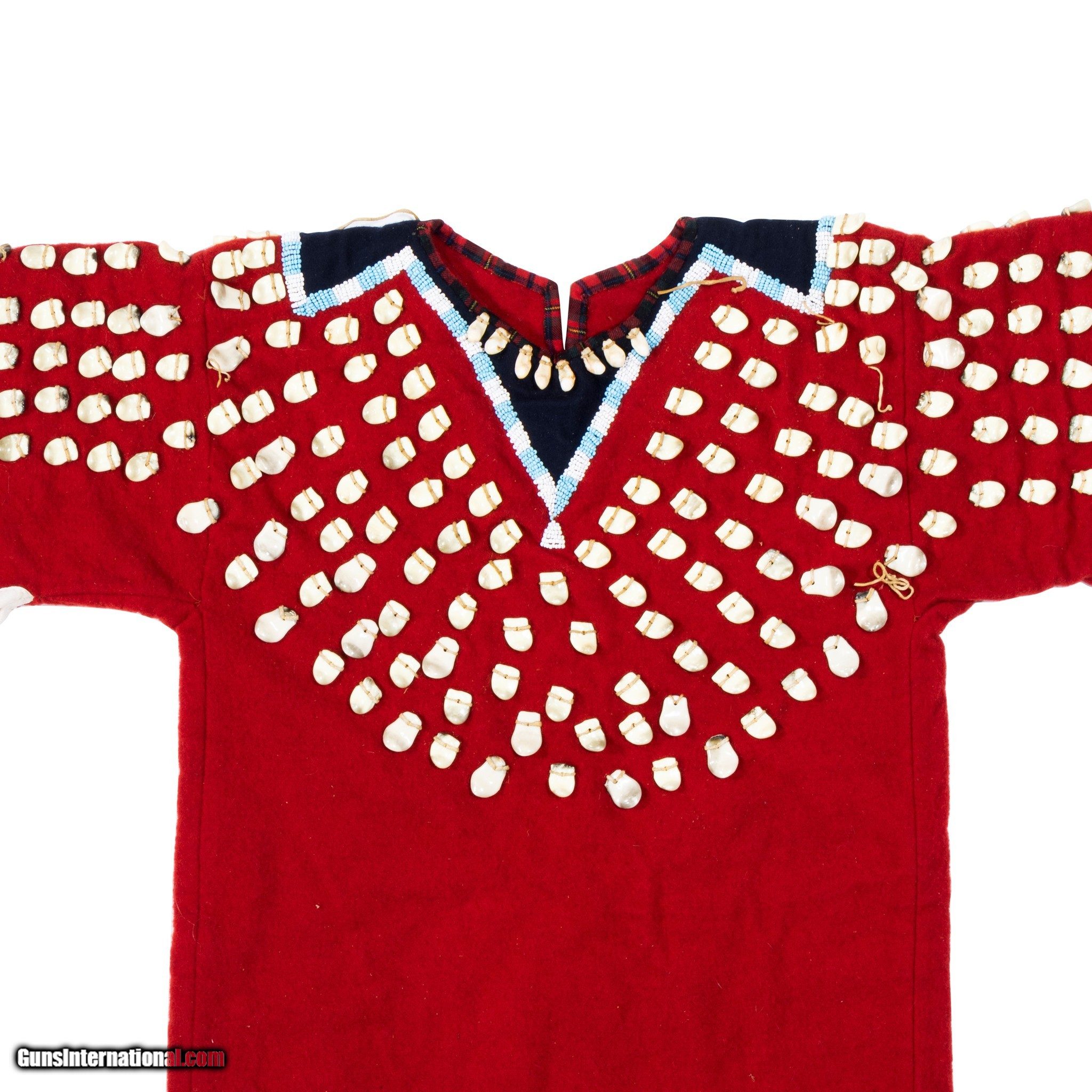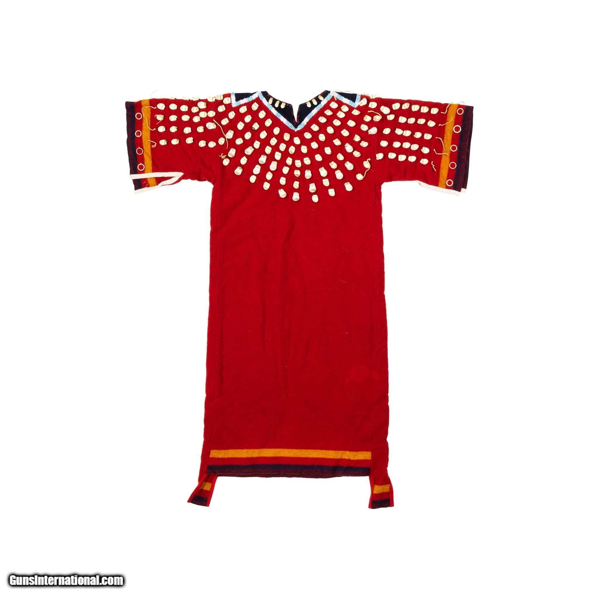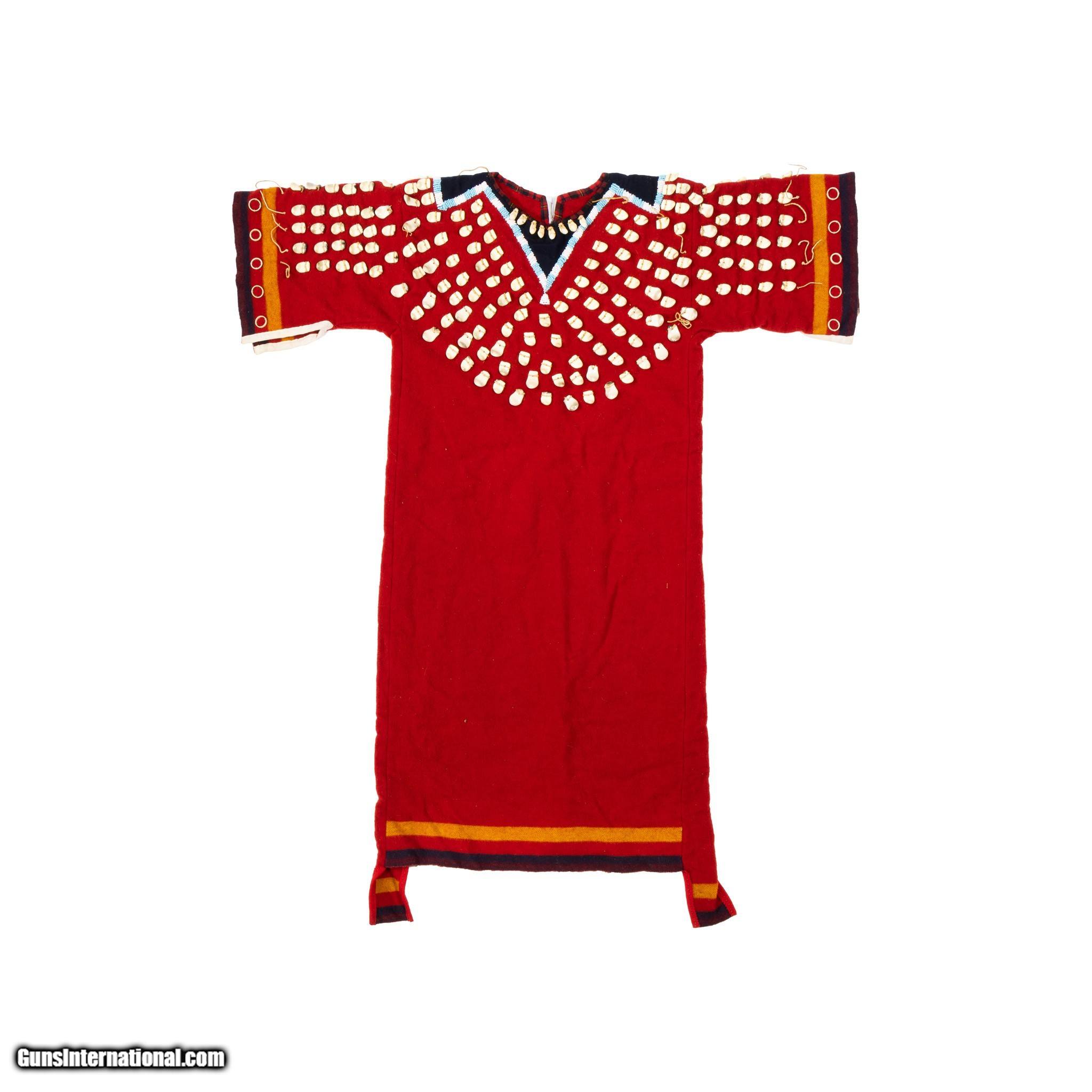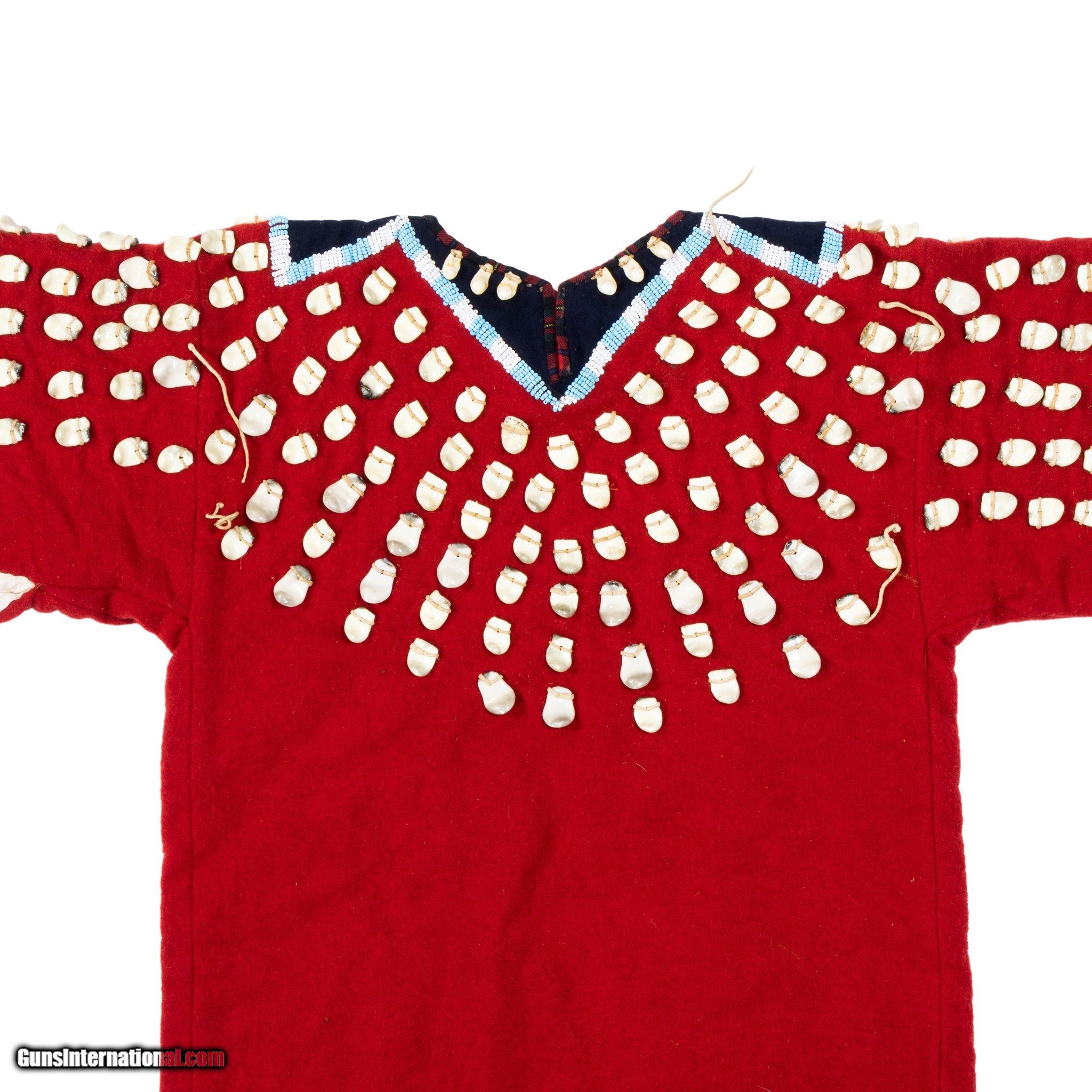 Description: Native American Northern Plains, possibly Crow, red stroud woman's dress with over 300 ceramic elk teeth and beaded neck both sides. A lovely early 1900's made piece, great for display in a handmade indigenous clothing or beadwork collection. Would also display nicely in Southwestern home decor. Could continue to be worn and used with care. Size: 46"L x 40" across Family Owned & Operated Cisco’s Gallery deals in the rare, exceptional, and one-of-a-kind pieces that define the history of America and the Old West. Our pieces range from American Indian to Cowboy Western and include original items of everyday life, commerce, art, and warfare that tamed America’s frontier. Our 14,000 square foot gallery opened in 1996 in beautiful Coeur d’Alene, Idaho. Personal Service Cisco’s operates on old fashioned values – honesty and integrity, and all of our items are backed by our money back guarantee. We appreciate the opportunity to earn your business. Whether you desire assistance with a jewelry purchase, choosing a gift, identification, or even selling – we hope to be your trusted source. SOLD |