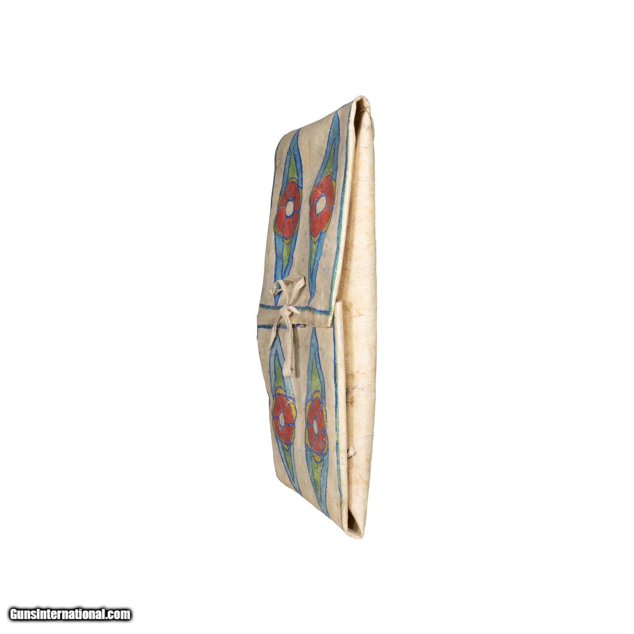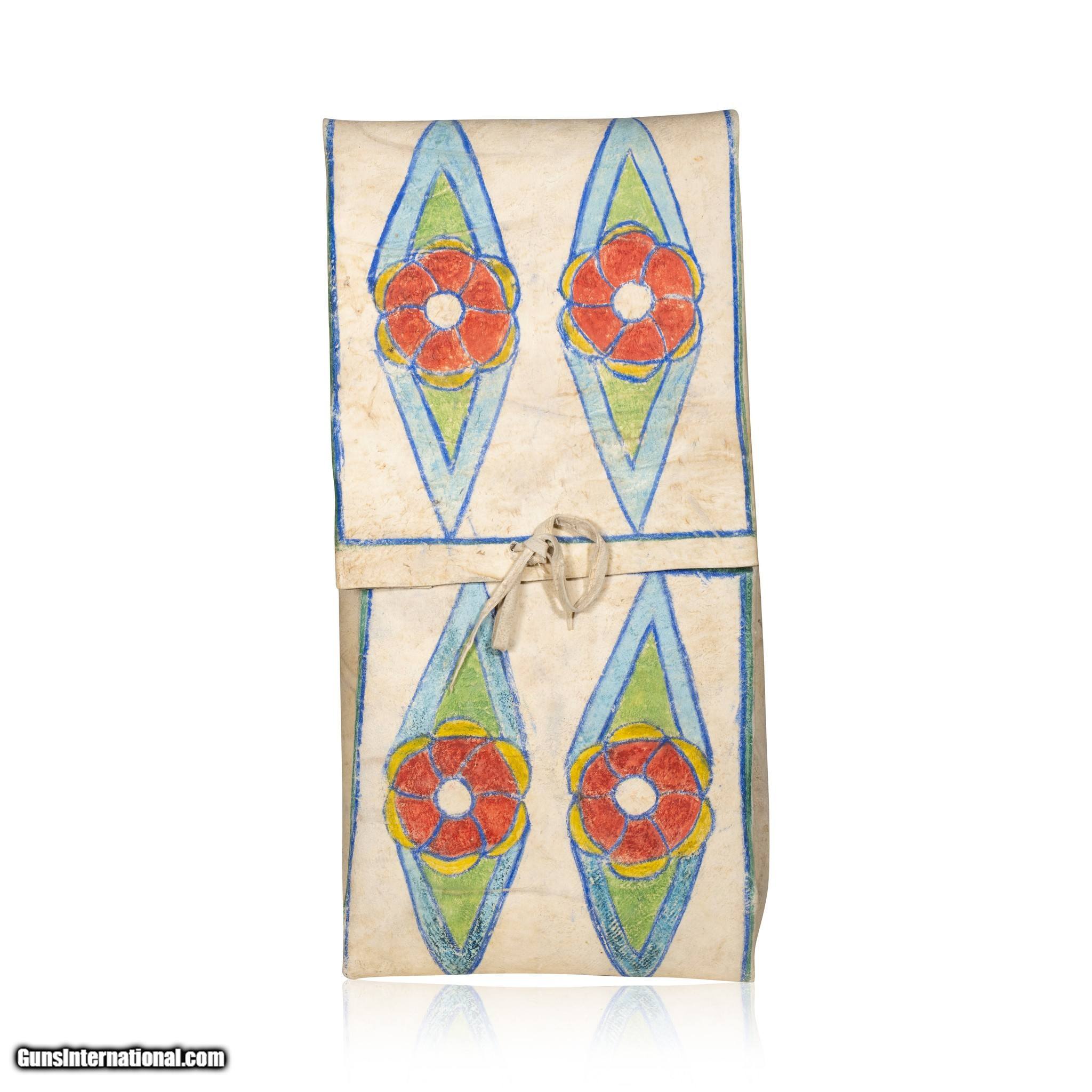 Description: Matched pair of Plateau parfleche packets with diamonds and stylized flowers and brain tanned ties. Difficult to find a pair. Rare design. The term parfleche was first coined by the French fur traders and derived from the French word “parer” meaning defend and “fleche” meaning arrows, as the hide was tough enough to be used as a shield and deflect an arrow. The original containers had graphics that were maps, geographical depictions such as rivers and mountains, or symbols that told the family’s stories. Once the parfleche left the family, the story was lost and the parfleche became Native American art rather than a meaningful storyteller. 11" x 23 SOLD |