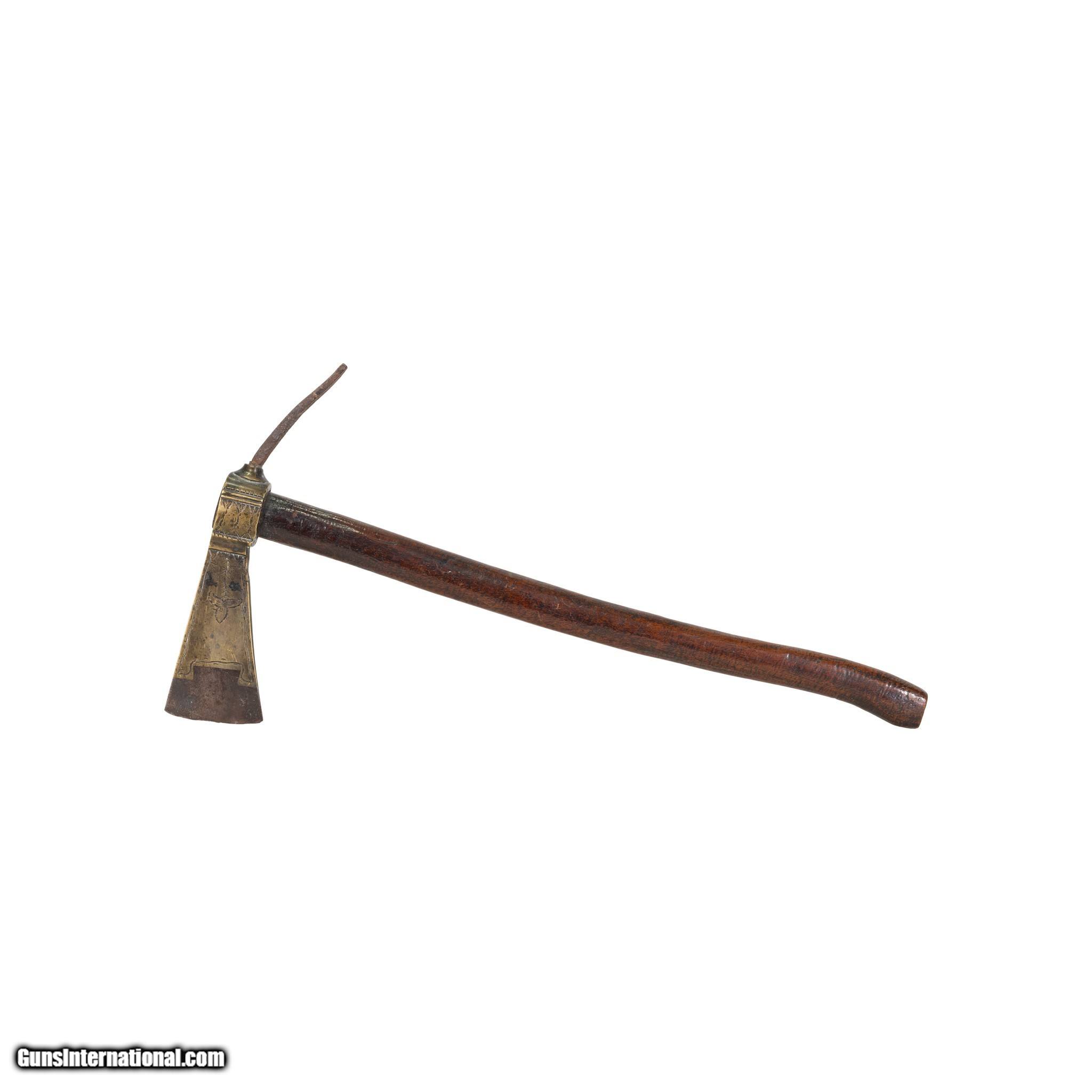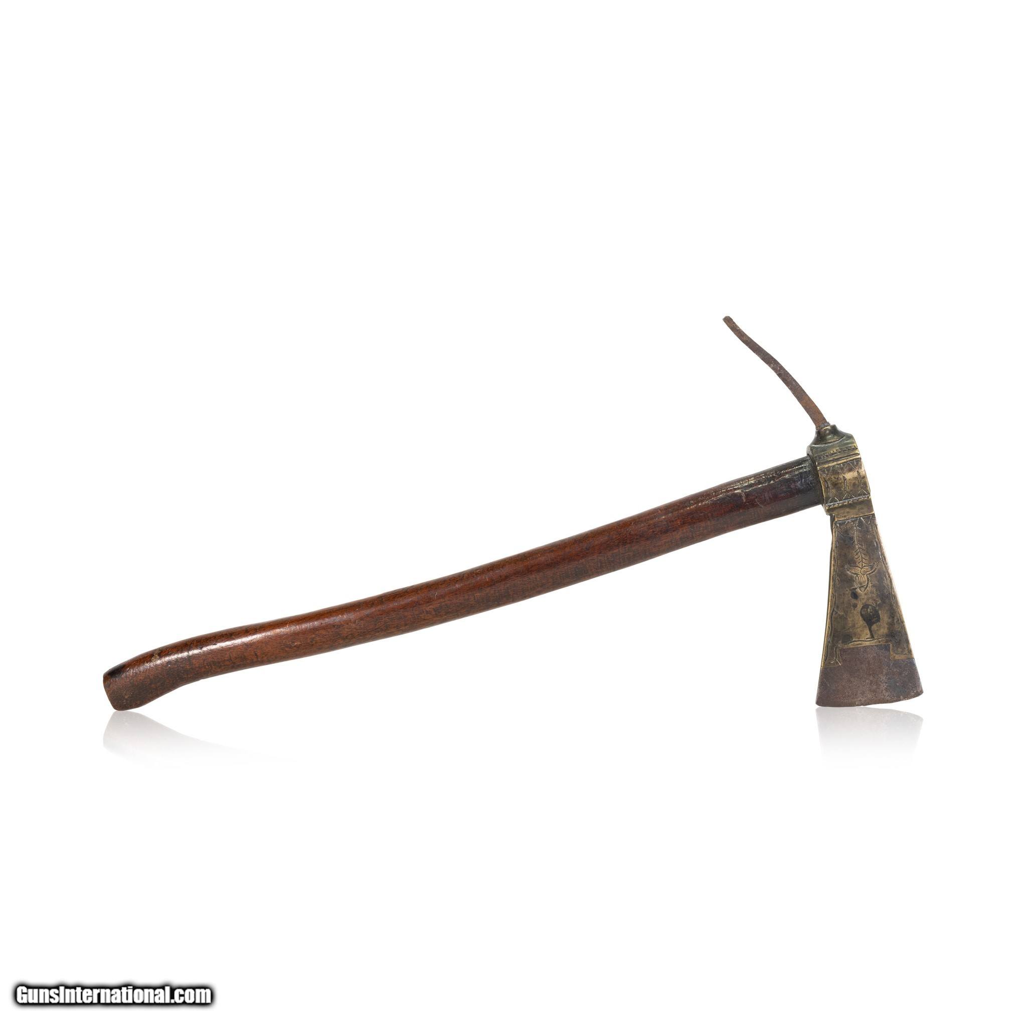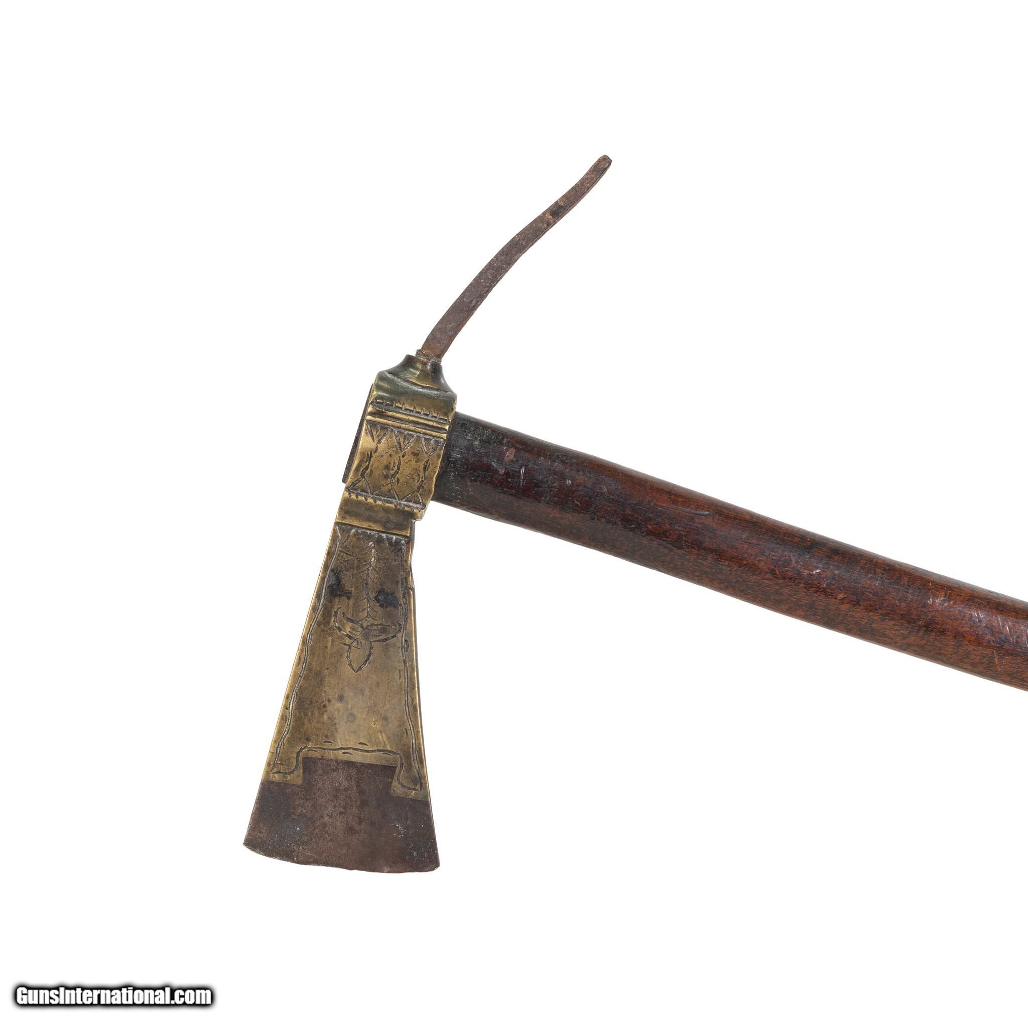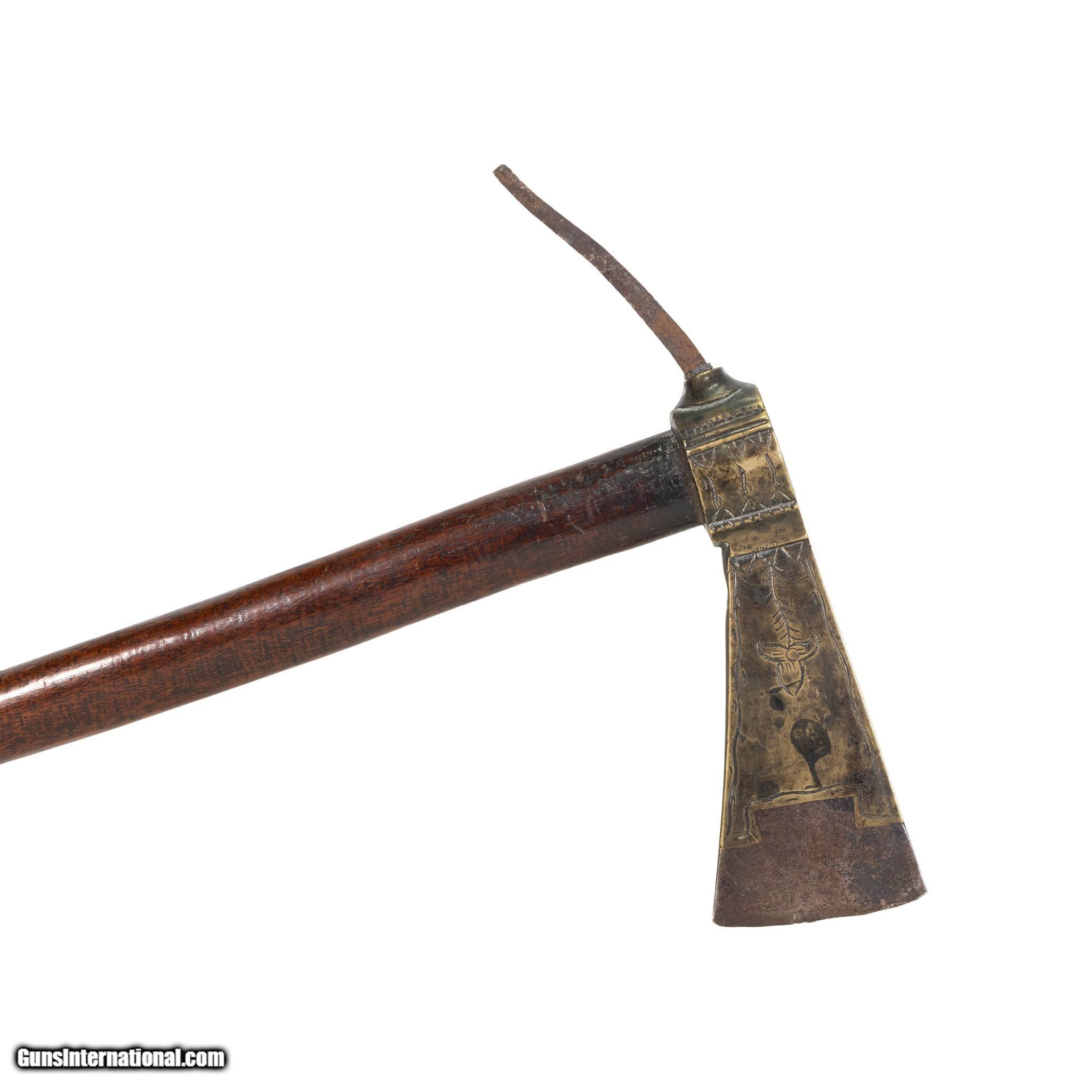 Description: Pipe tomahawk with steel spike inserted into a brass body. Heavily engraved, bowl removed during period of use and steel spike inserted. Shaft was period replaced to non-smoking common to the period in the early 19th Century. This weapon shows an excellent dark patina. Attractive, interesting weapon that shows ingenious conversions. Ex. William Myers. Blade 8 1/4" Overall 15 1/2". Mid 19th century. SOLD |