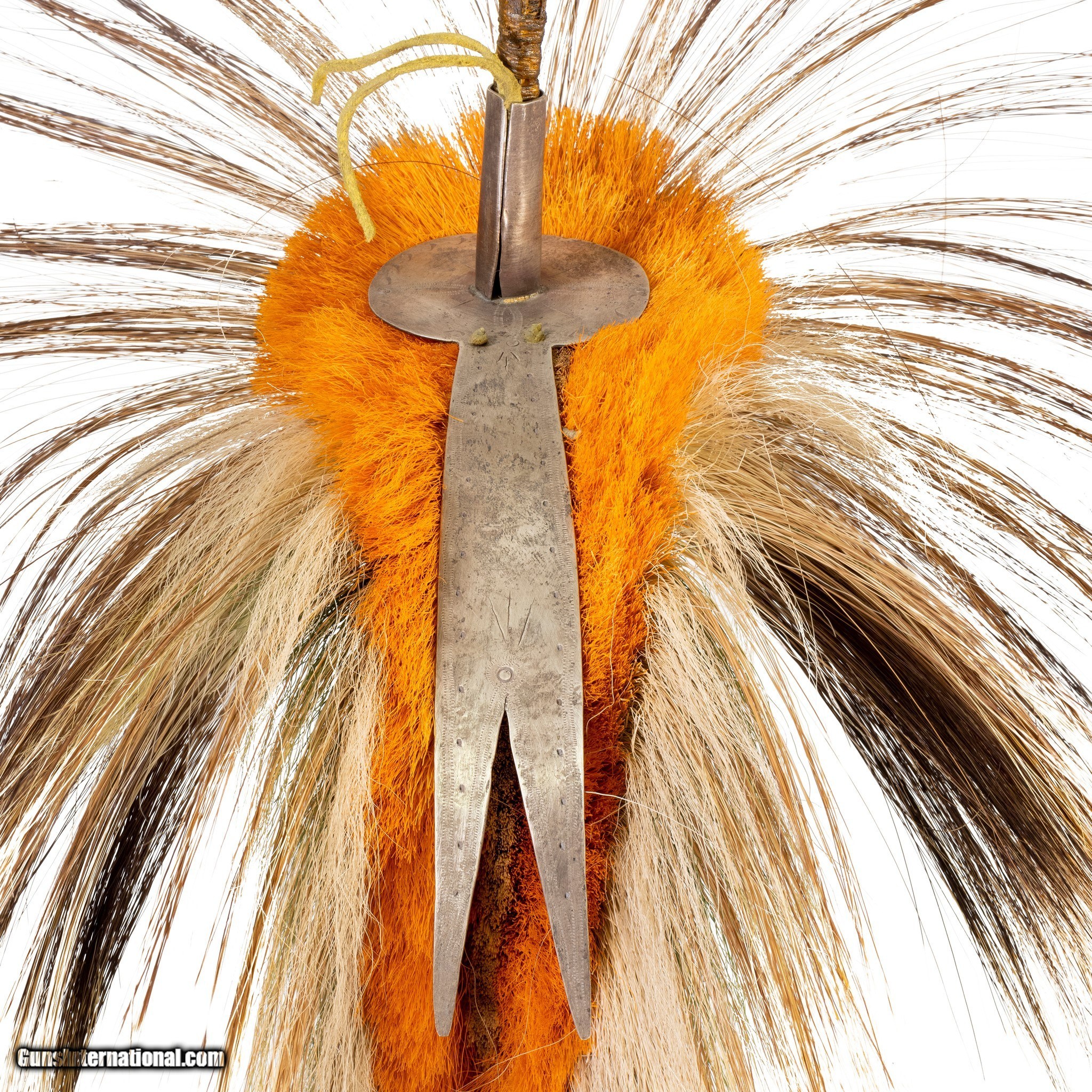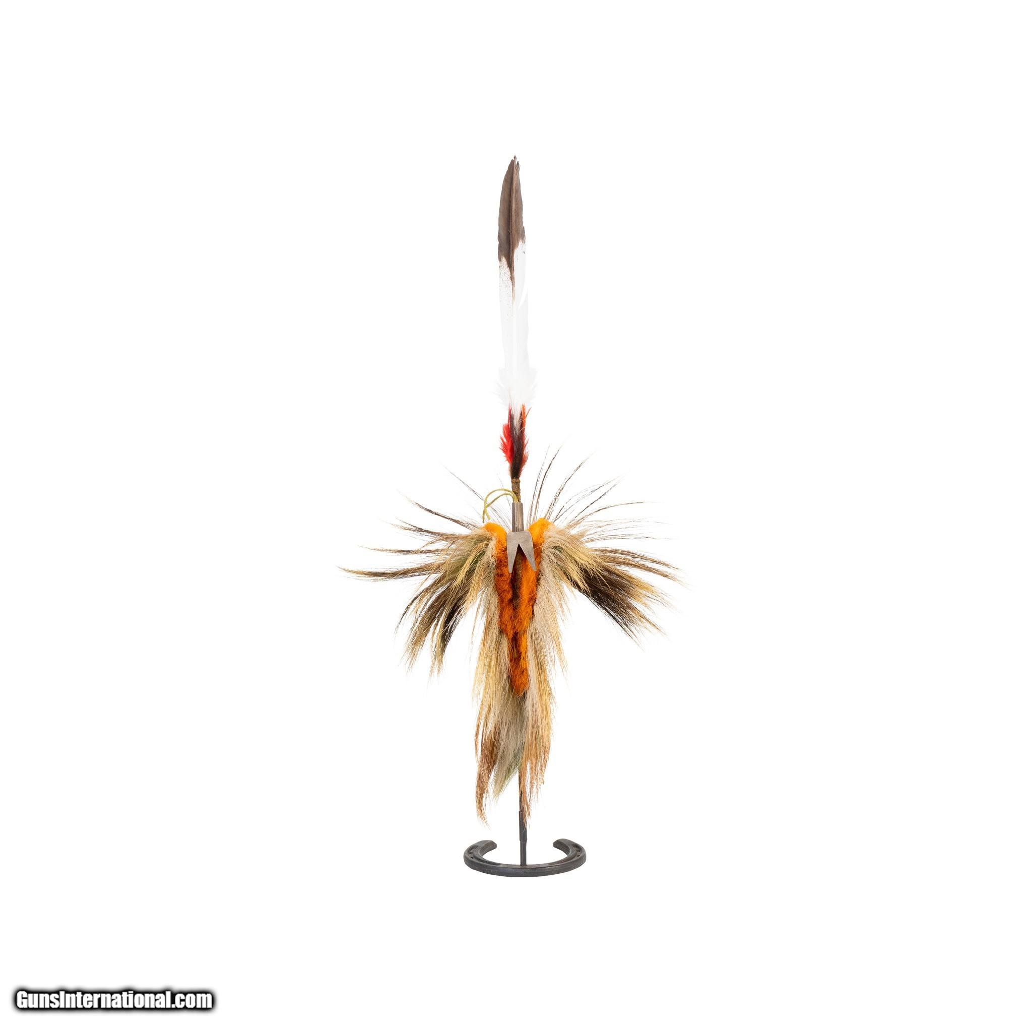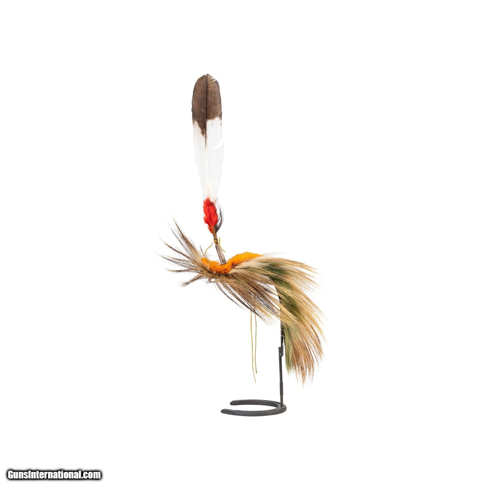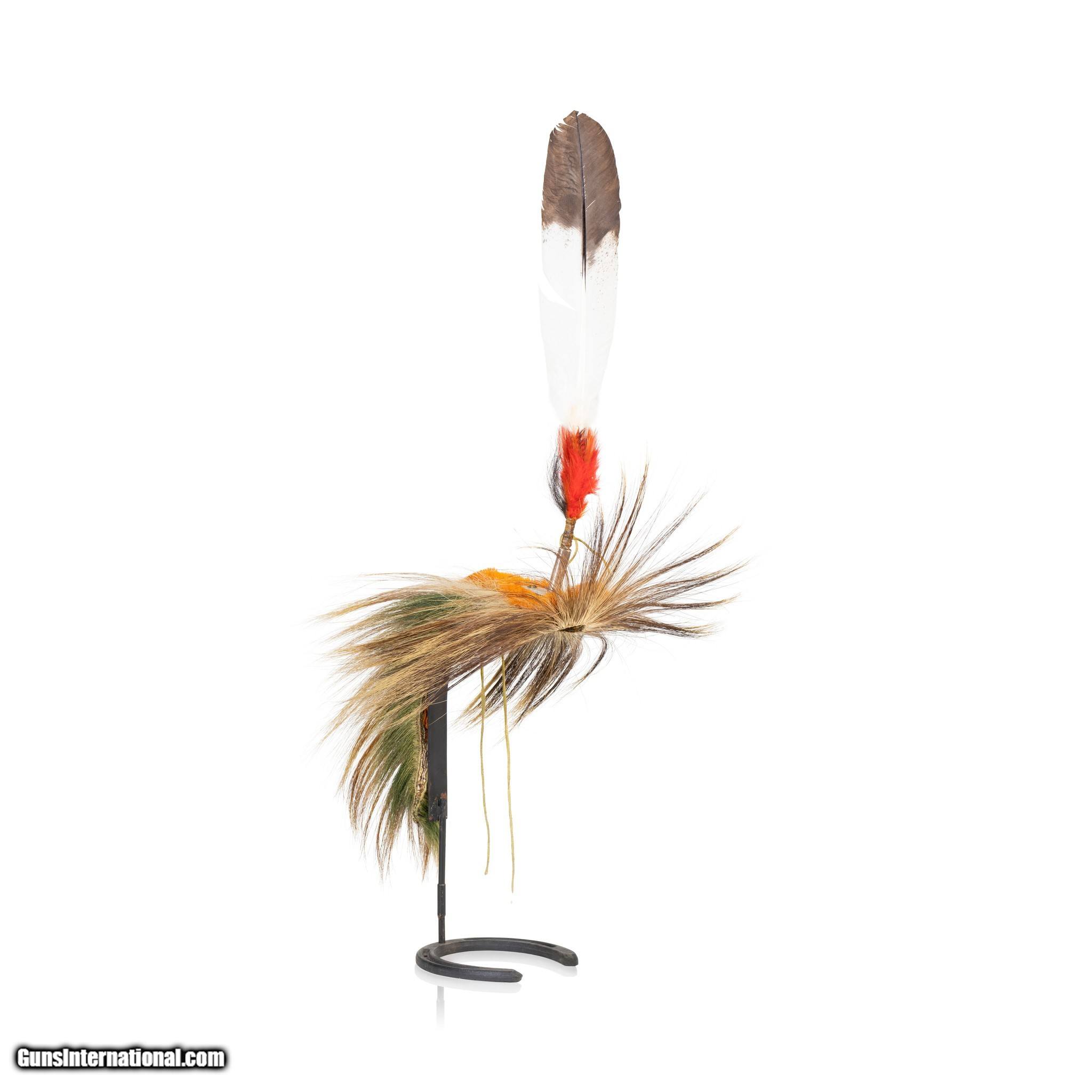 Description: Plains deer tail roach with period engraved German spreader. With personal feather (simulated eagle feather). Finely woven deer tail center. 18"L x 16"W. 19th cenutry. (Stand not included) SOLD |