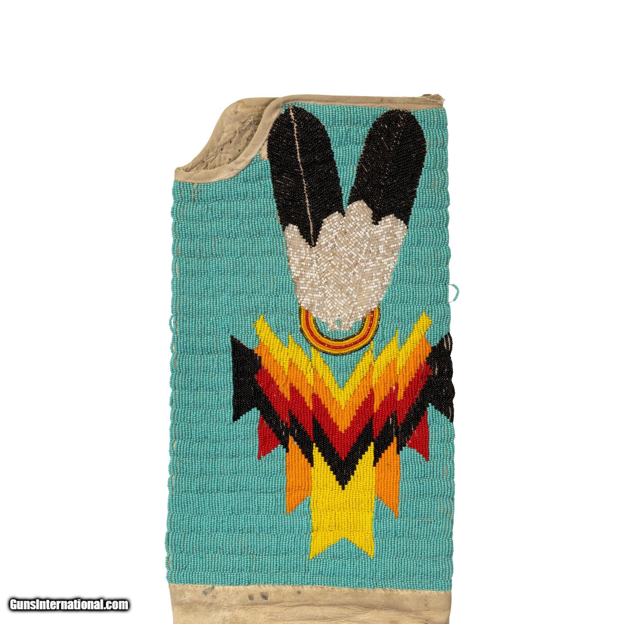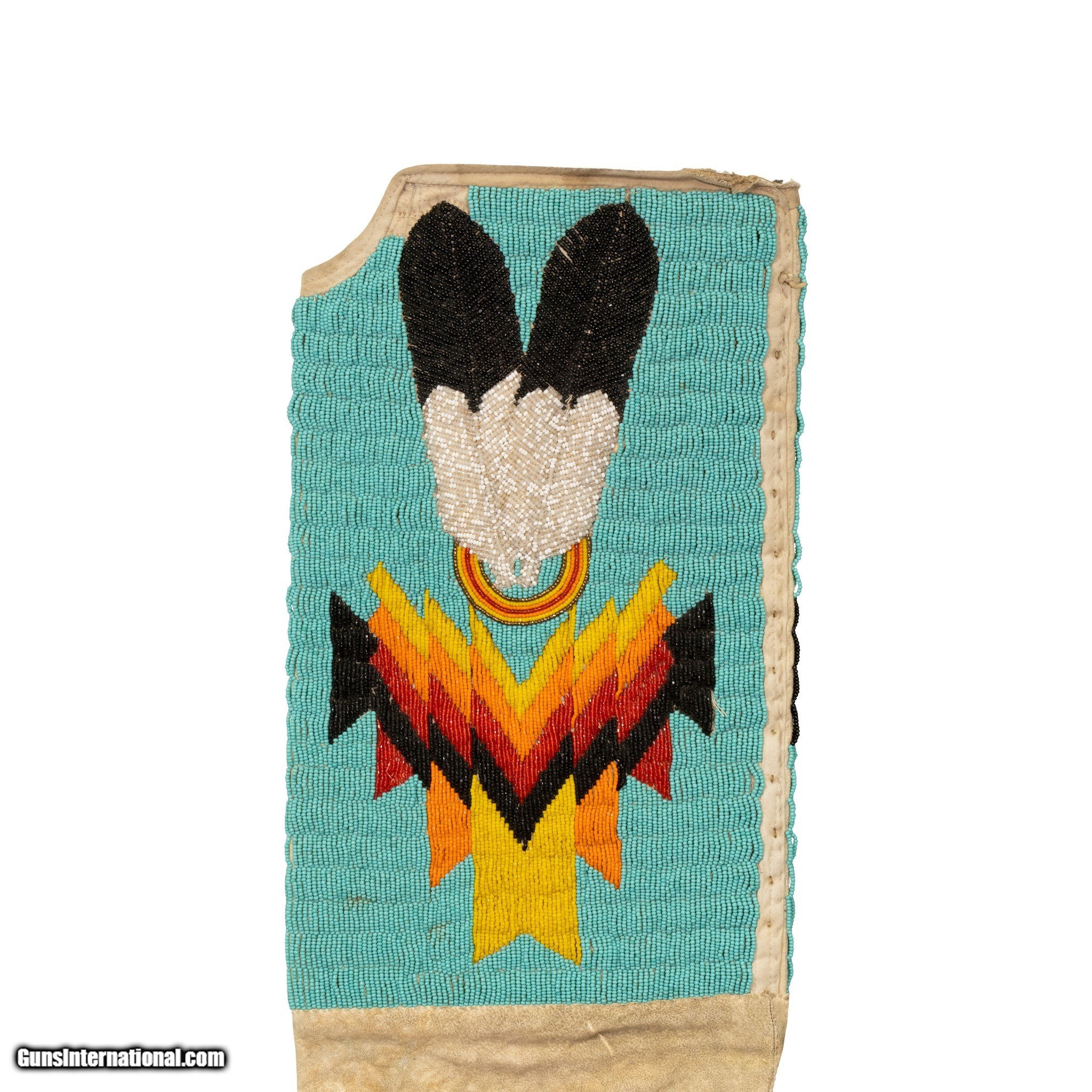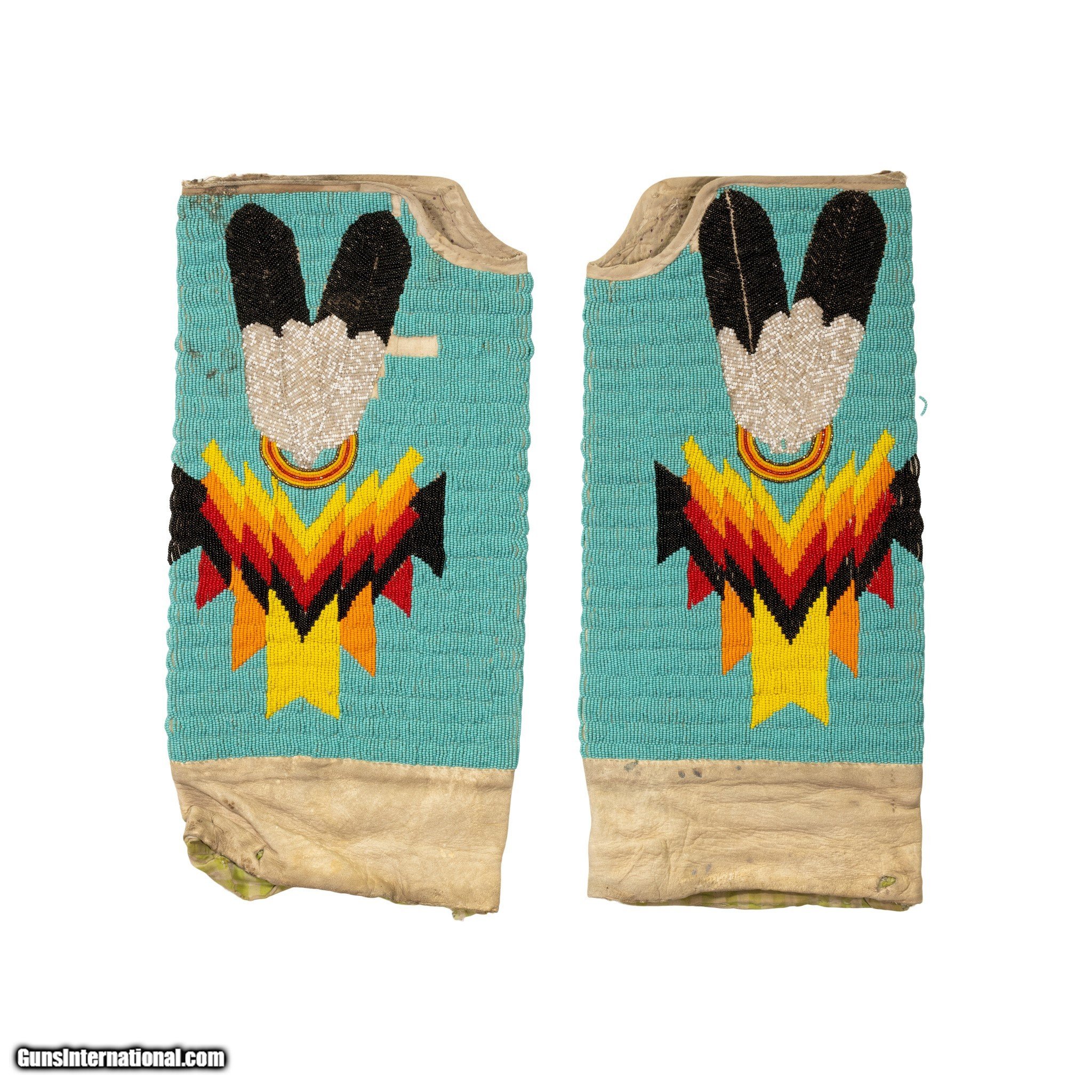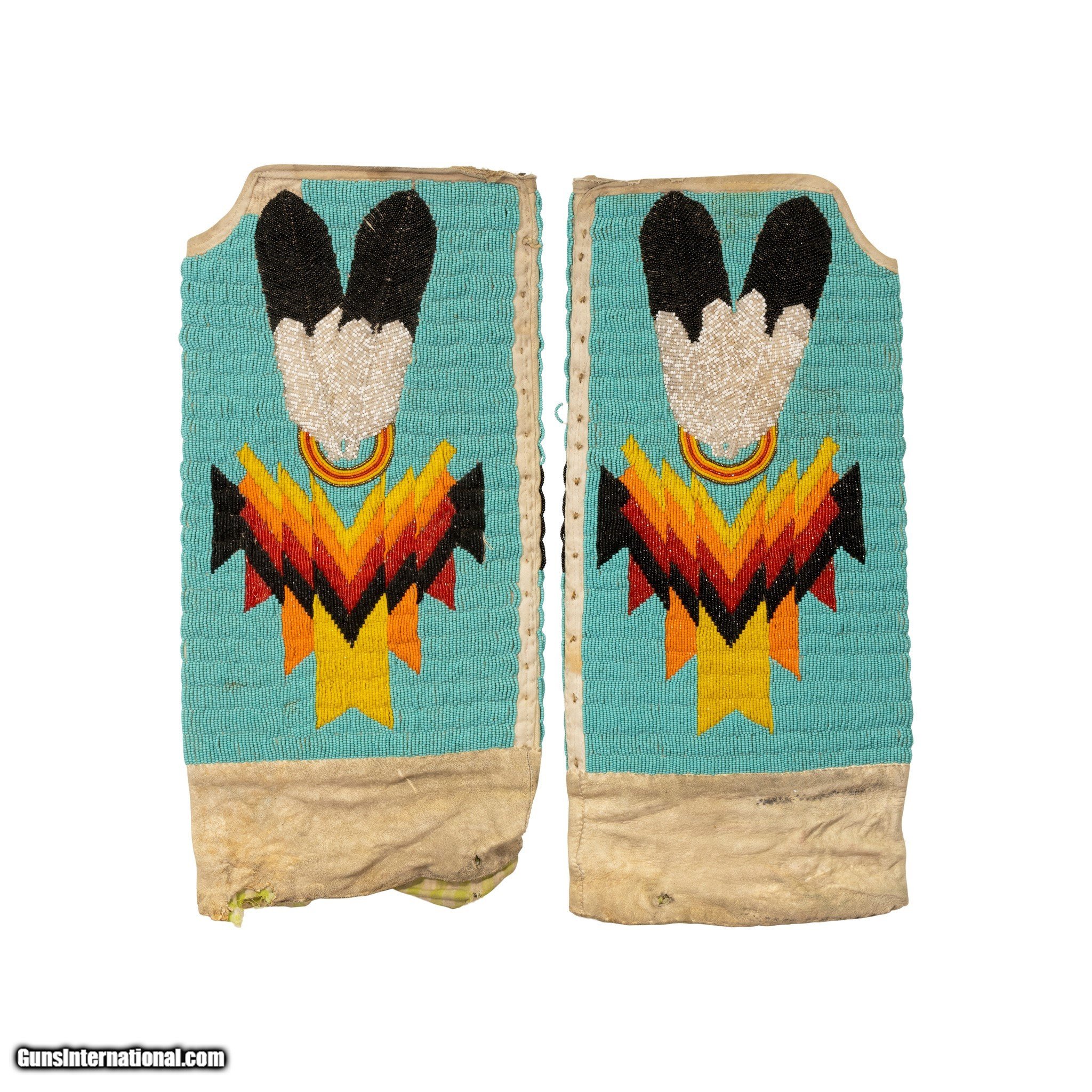 Description: Plateau leggings with geometric design and eagle feathers on brain tanned deer skin. Beaded both sides. Each 7" x 16". Mid 20th century. SOLD |