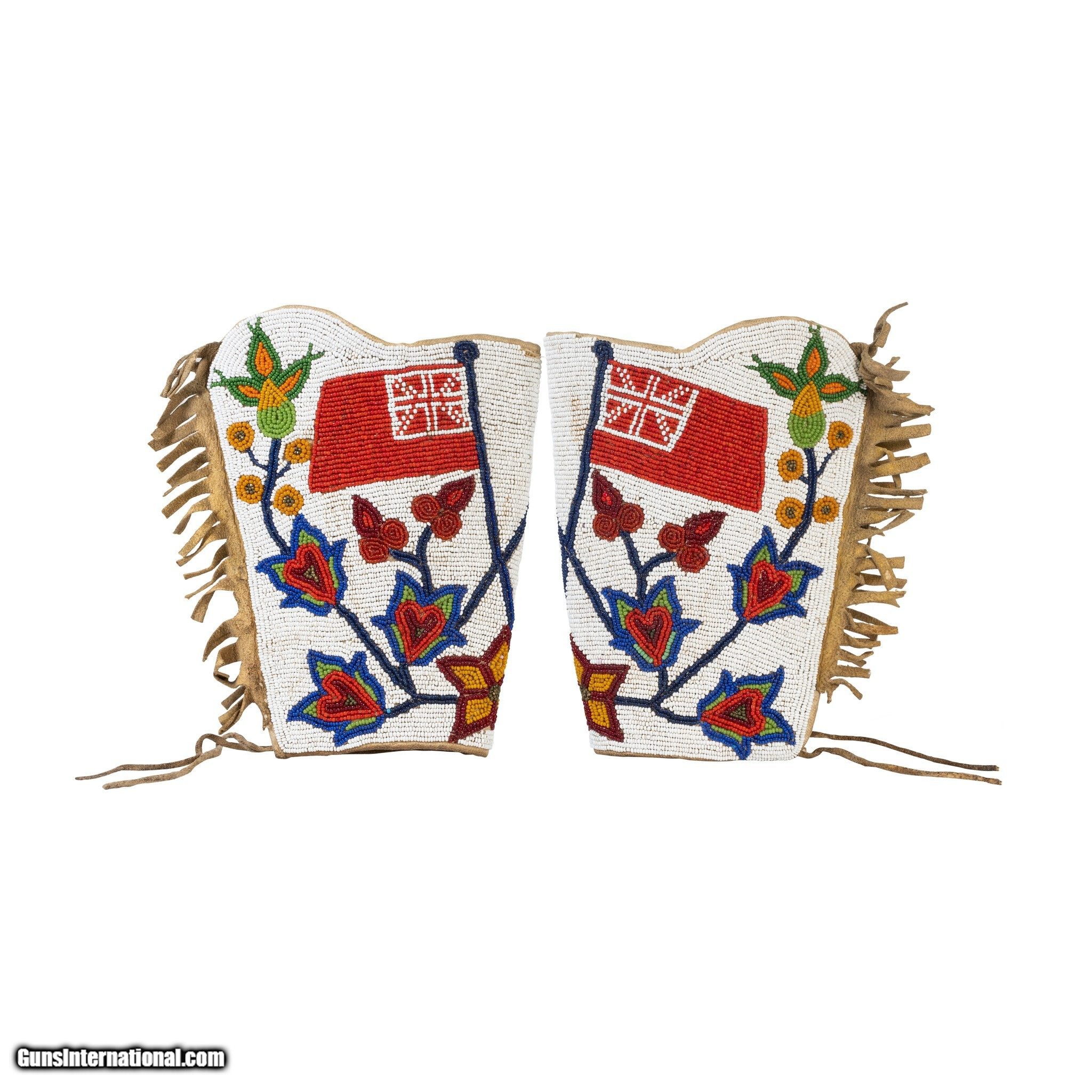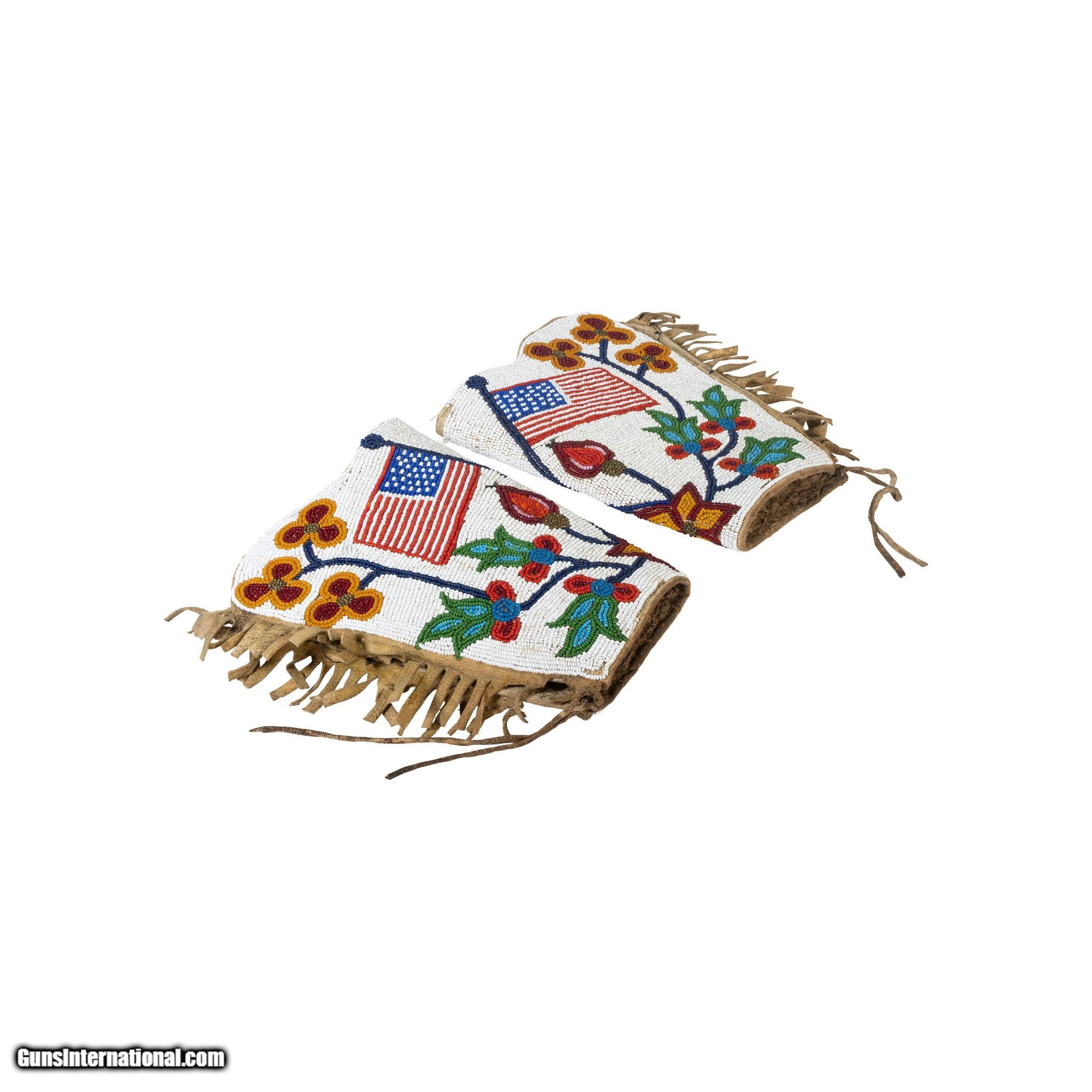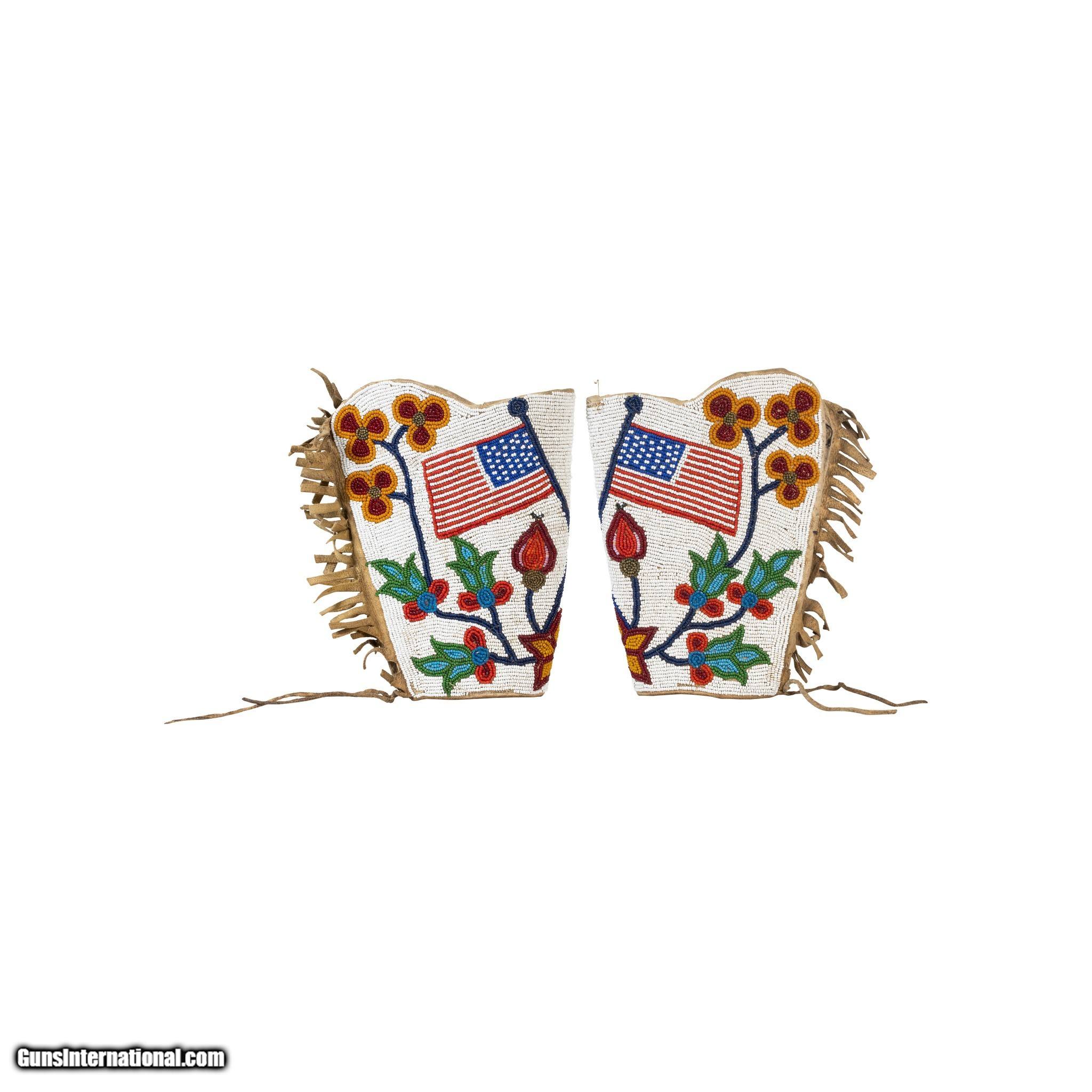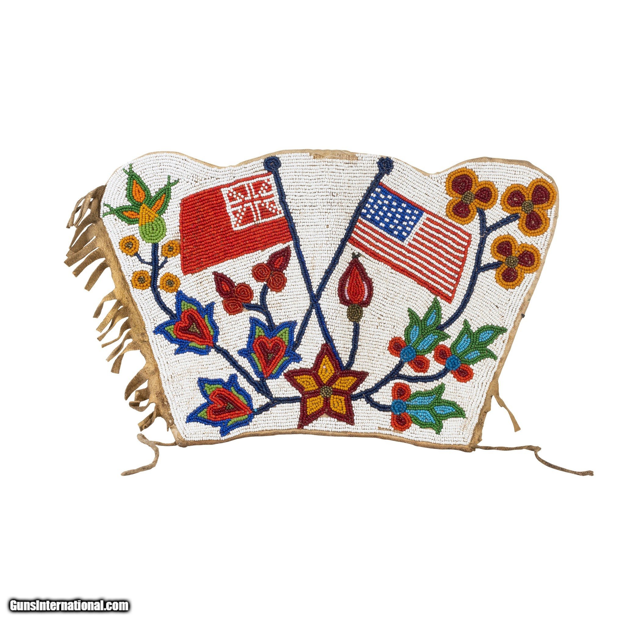 Description: Plateau beaded cuffs on brain tanned hide. Floral design with both US and British Flags. Beaded on tent canvas with brain tanned fringe. 8" x 12". Circa 1900 SOLD |