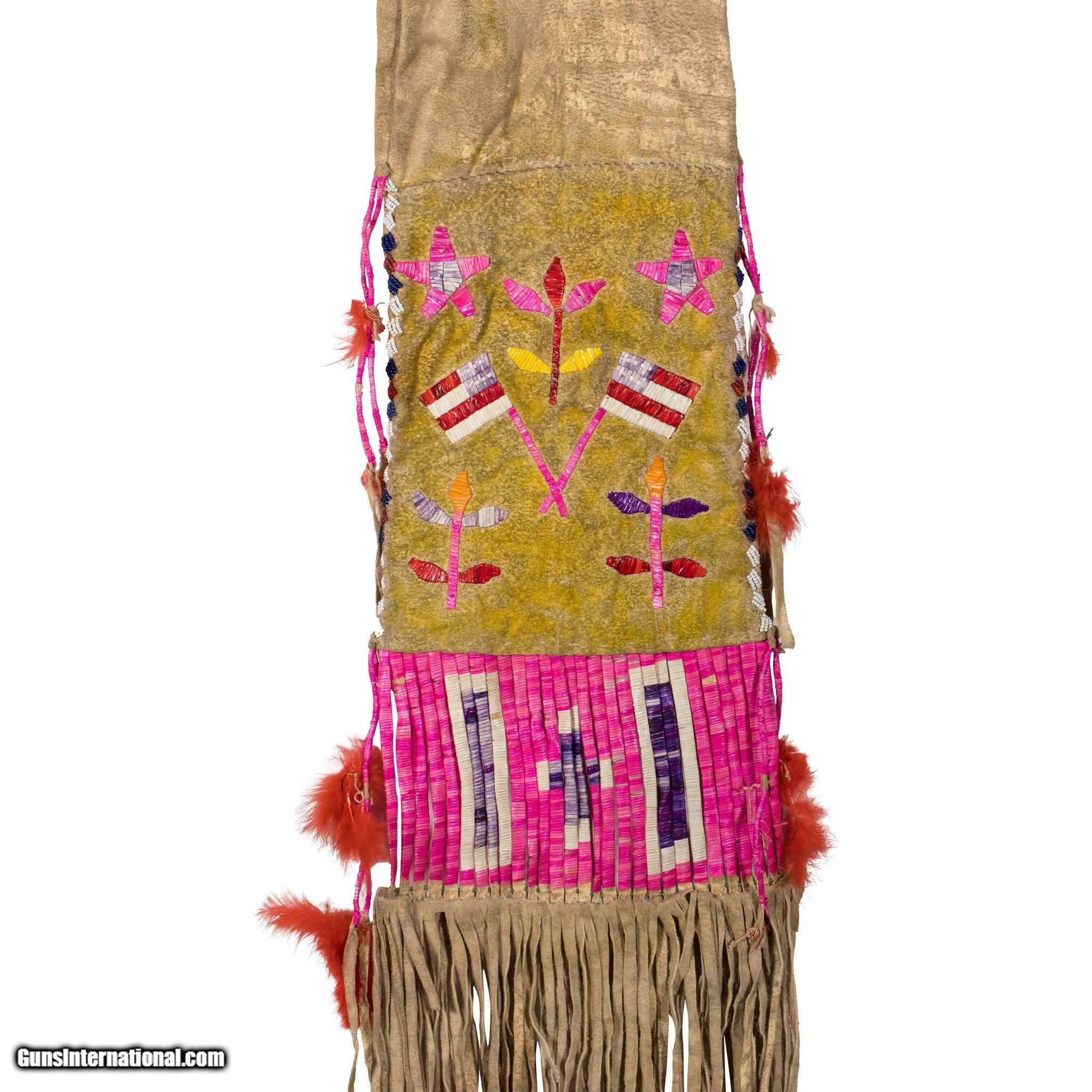 Description: Santee Sioux quilled and beaded pipe bag, 18" plus 5" quilled slats and 8" fringe. Yellow ochre on mid panel. 7 1/2" wide. Ex Williams collection. SOLD |