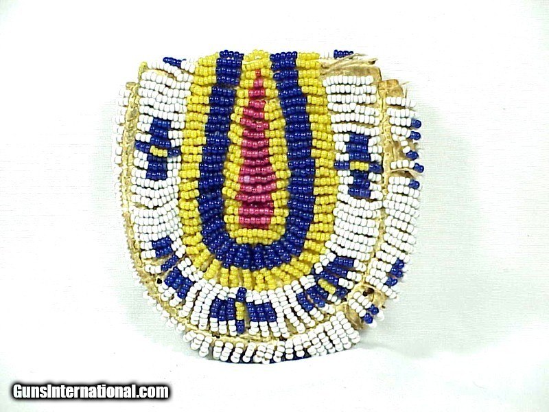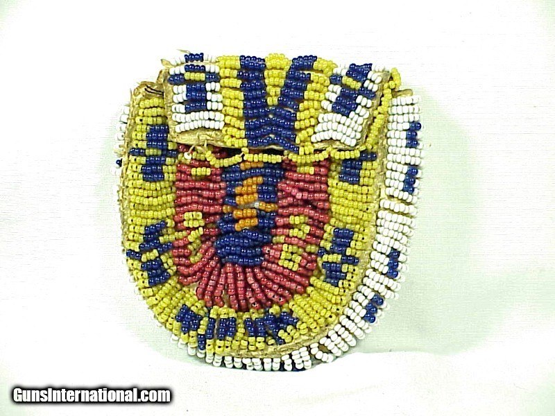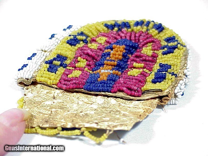 Description: Sioux beaded coin purse. Has a few missing beads. Made of deer skin with buffalo track design and crosses on edging. Circa 1890's. 3" X 3" long. SOLD |