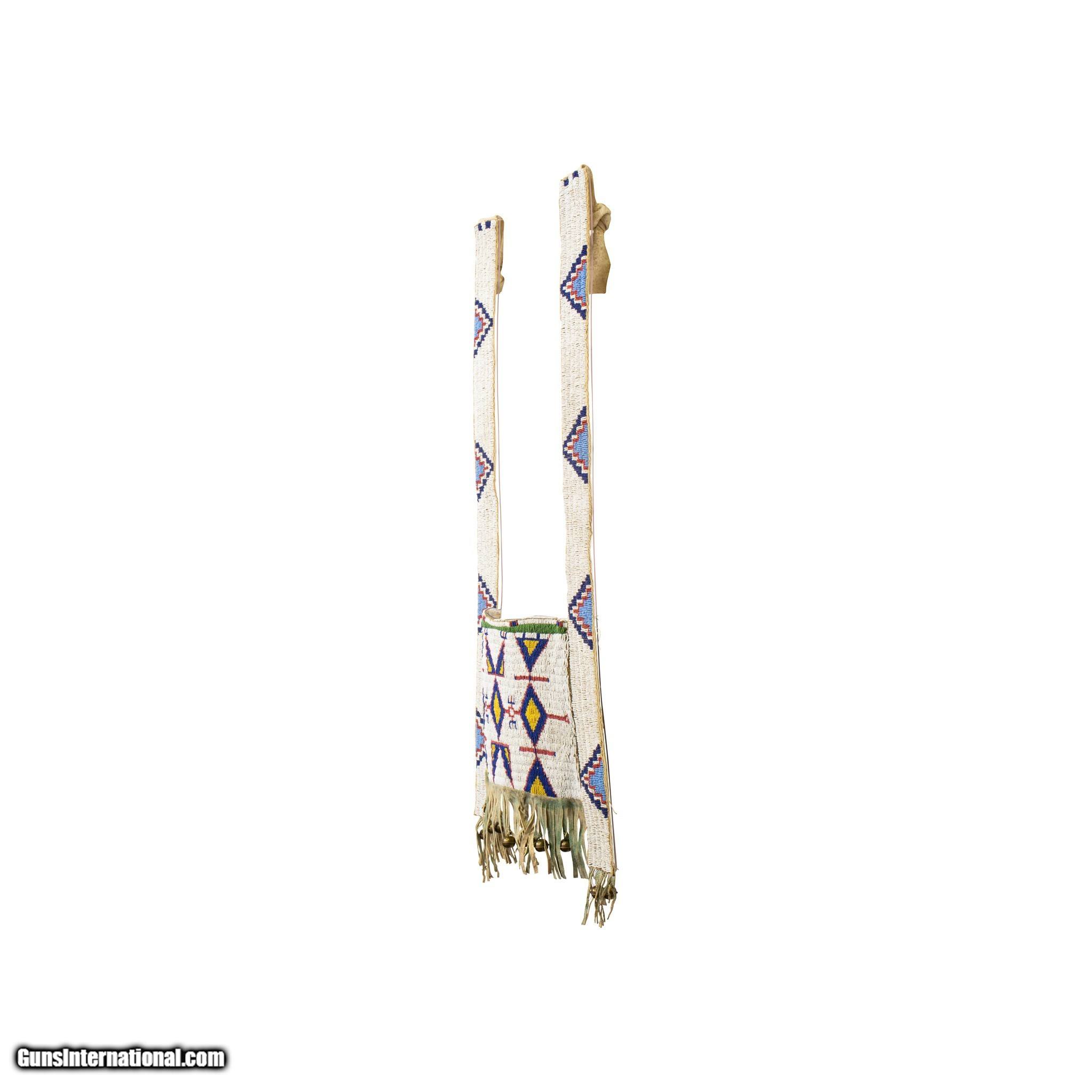 Description: Sioux martingale made from repurposed shirt strips and teepee bag front. Sinew sewn, brain tanned and then onto tent canvas. Green ochre covered fringe and hawk bells on professional acrylic mount. 33" x 2 3/4" Center Panel 9" x 11" Overall 15" x 38" Plus fringe SOLD |