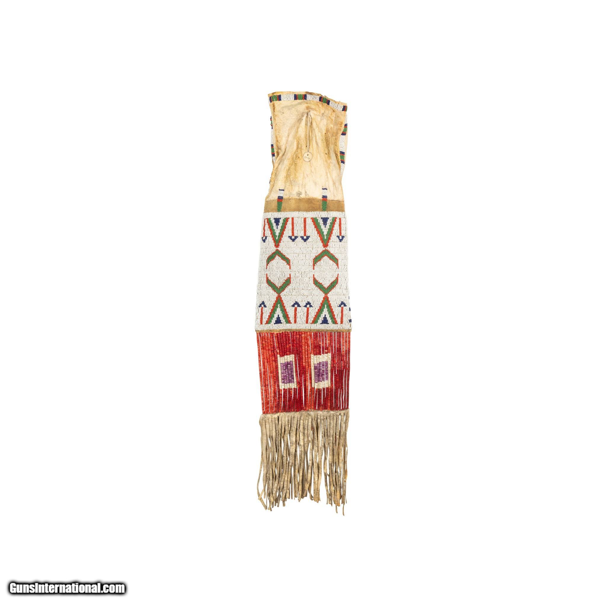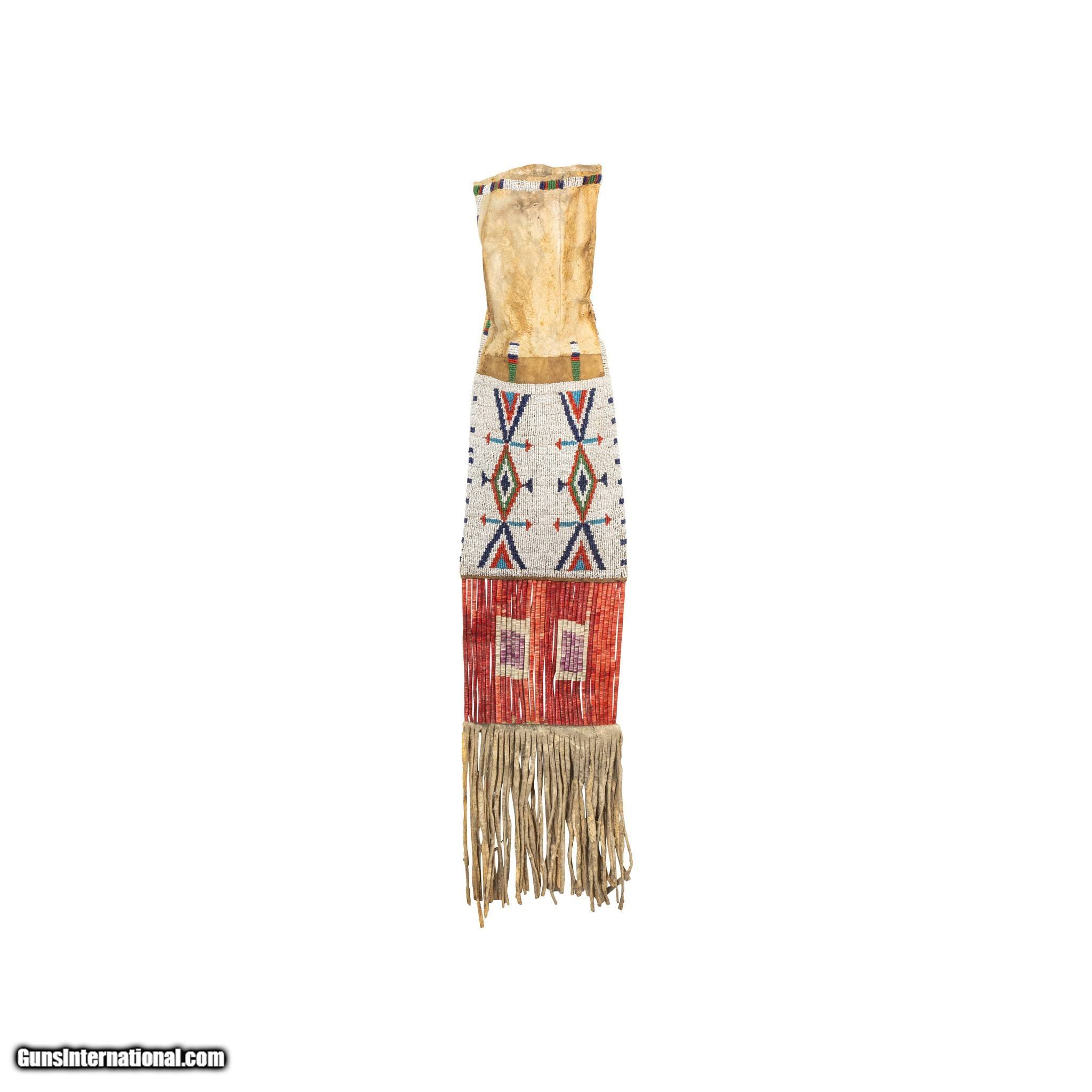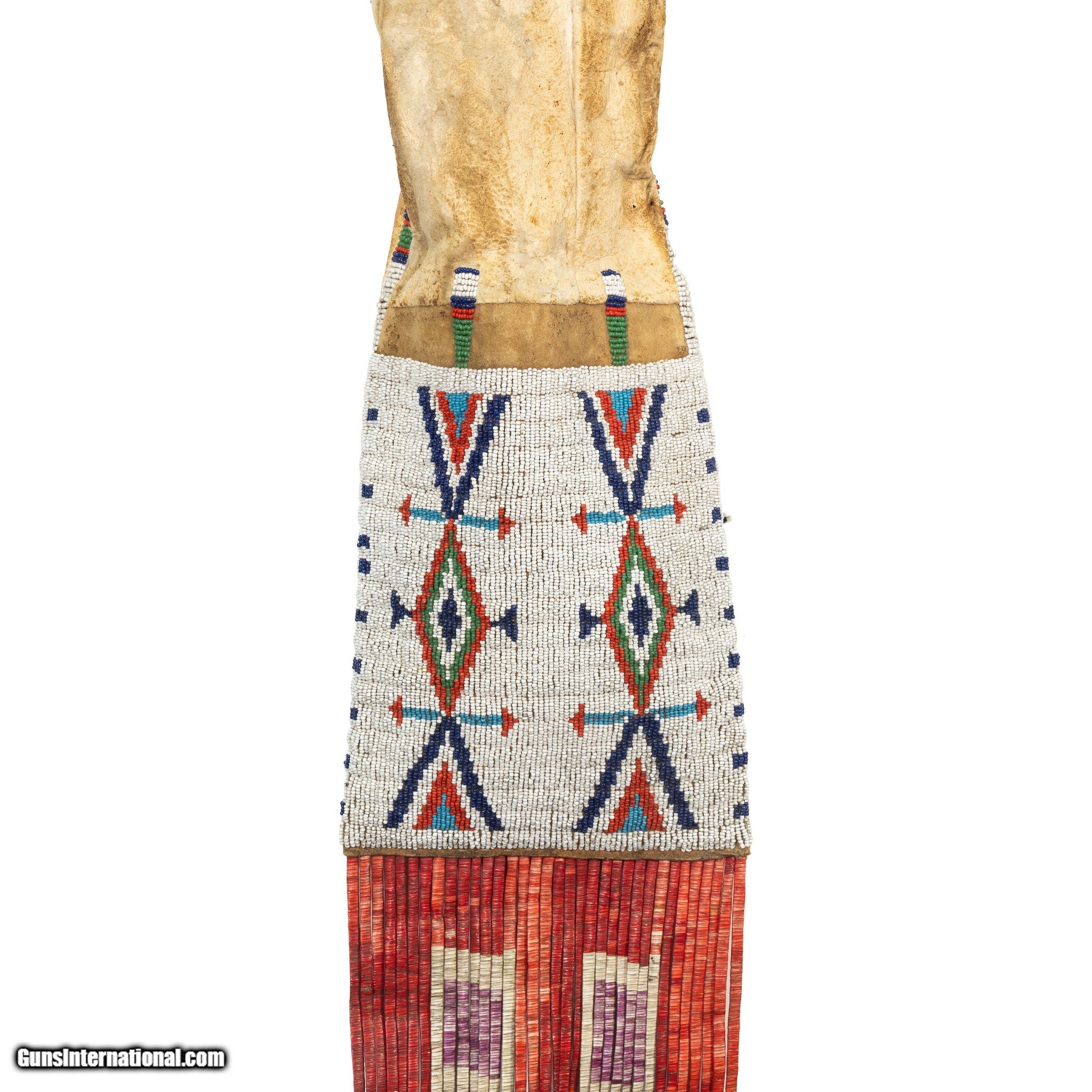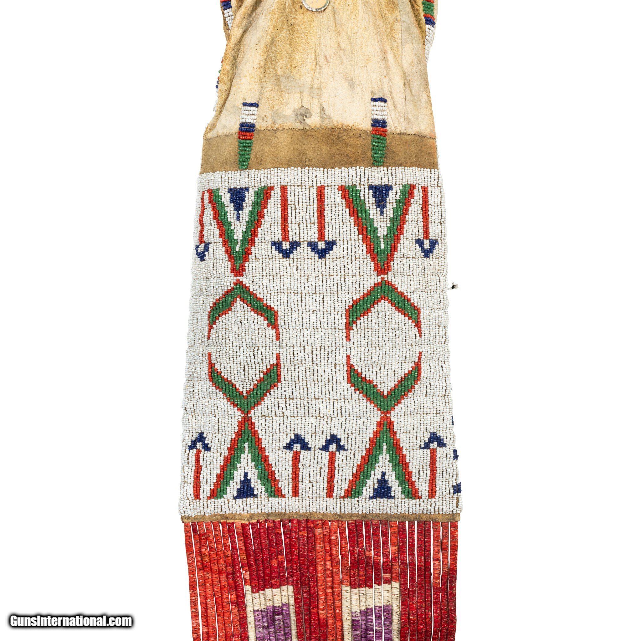 Description: Sioux pipe bag with large beaded panels different both sides. Quill parfleche slats in exceptional condition and brain tanned buffalo fringe. Old collection tag remains. Bag 16" x 7"W; Overall 31"; Slats 6"; Fringe 8". Last quarter 19th Century. SOLD |