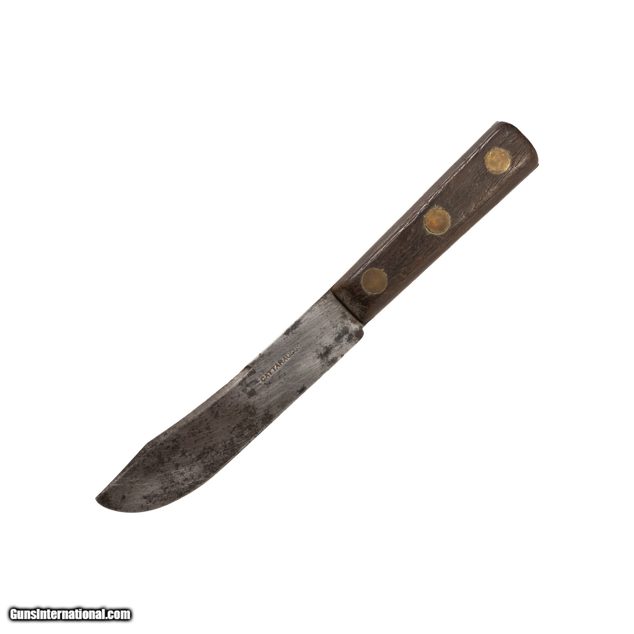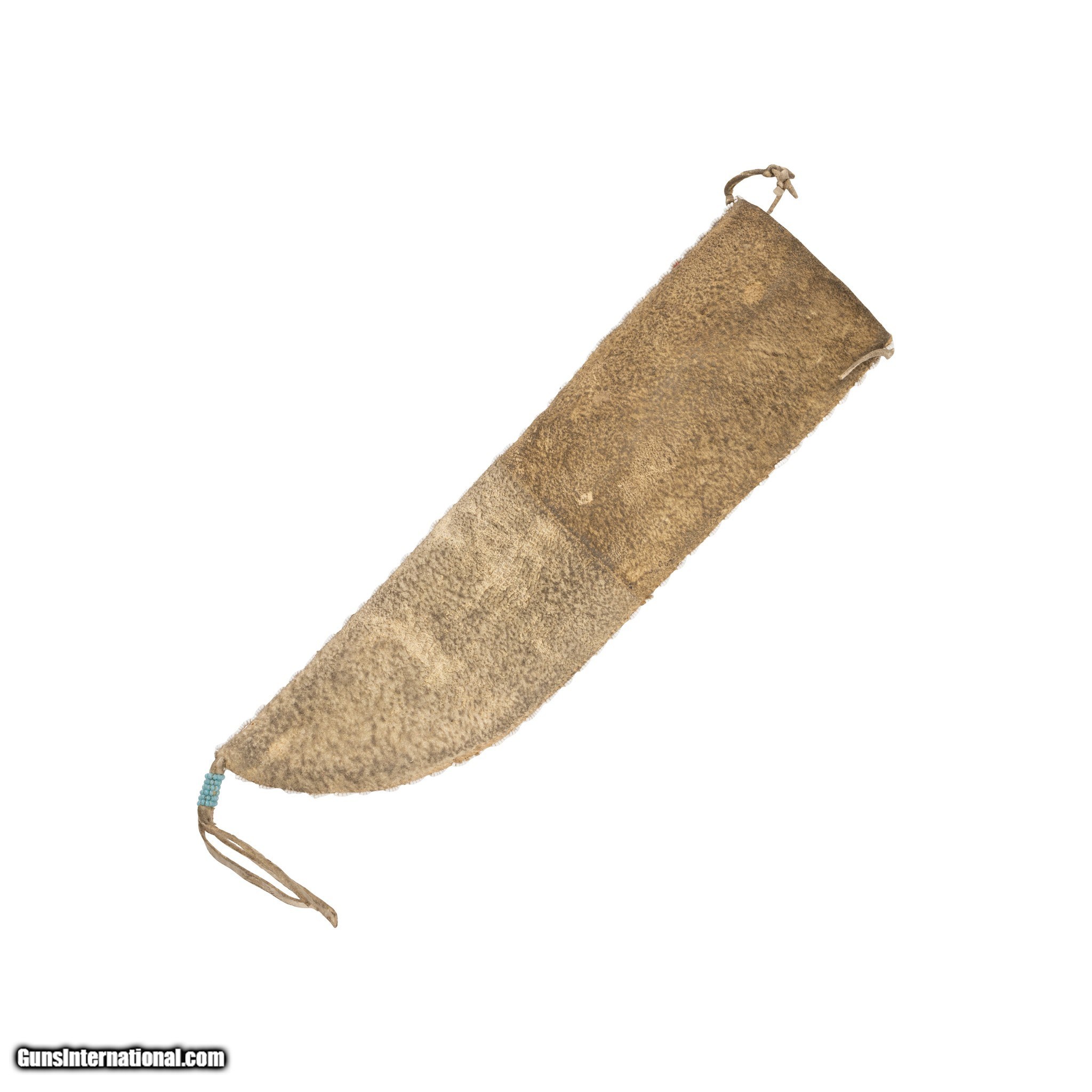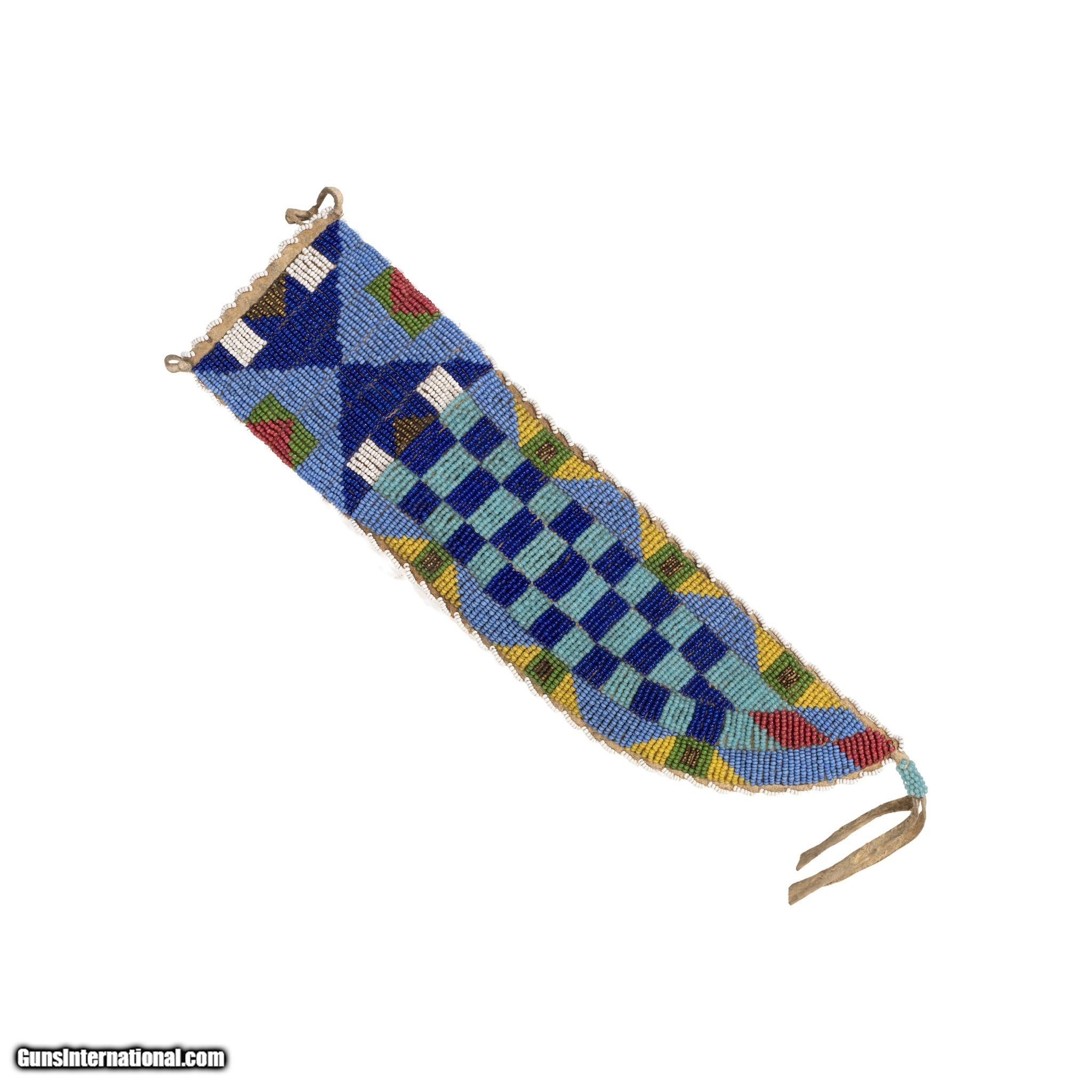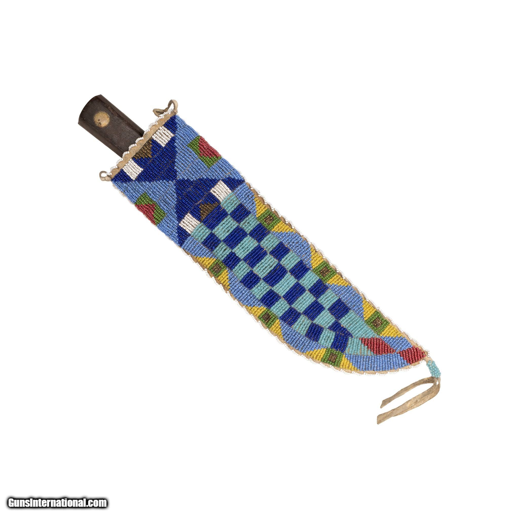 Description: Elaborate Native American Sioux Indian beaded knife sheath on brain tanned hide with metallic beads. Sinew sewn. Featuring colors of blue, teal, dark blue, yellow, green, white, and red. A nice piece that would display well in a handmade indigenous beadwork collection or a Southwestern style home. Size: 10" plus 3" drop x 3" wide with knife. Family Owned & Operated Cisco’s Gallery deals in the rare, exceptional, and one-of-a-kind pieces that define the history of America and the Old West. Our pieces range from American Indian to Cowboy Western and include original items of everyday life, commerce, art, and warfare that tamed America’s frontier. Our 14,000 square foot gallery opened in 1996 in beautiful Coeur d’Alene, Idaho. Personal Service Cisco’s operates on old fashioned values – honesty and integrity, and all of our items are backed by our money back guarantee. We appreciate the opportunity to earn your business. Whether you desire assistance with a jewelry purchase, choosing a gift, identification, or even selling – we hope to be your trusted source. SOLD |