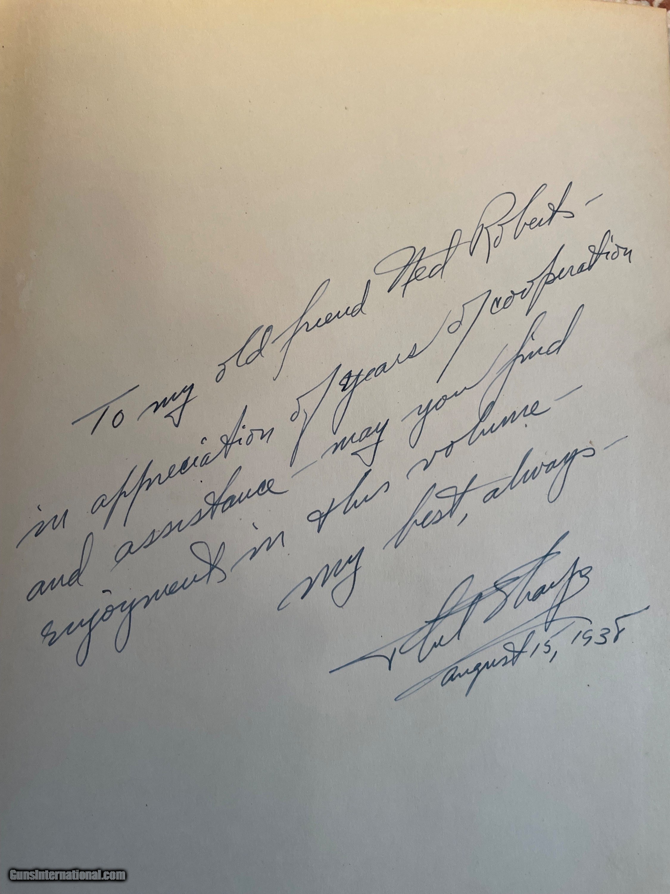 Description: THE RIFLE IN AMERICA by Philip Sharpe You are looking at a high condition fantastically rare treasure!. This is a First Edition (1938) boxed copy of this wonderful book with a warm hand-written acknowledgement from the author to his old friend Ned Roberts. Two pages into the book it is signed by Ned Roberts! Call (520-399-0440) or email (dmkernazcox )with any questions. BTW: Besides writing this book and another one entitled COMPLETE GUIDE TO HANDLOADING, Mr. Sharpe was the co-inventor of the .357 Magnum round in 1935 in cooperation with Douglas Wesson. Shipped to you with postage and insurance paid for by the seller. Shipped via USPS Priority Mail. The buyer of this book will also be given Mr. Sharpe’s other book as a gift. I’d like these books to stay together. The inscription reads: To my old friend Ned Roberts in appreciation of years of cooperation and assistance - may you find enjoyment in this volume. My best always, Phil Sharpe, August 15, 1938 Price: $595.00 Contact Seller |