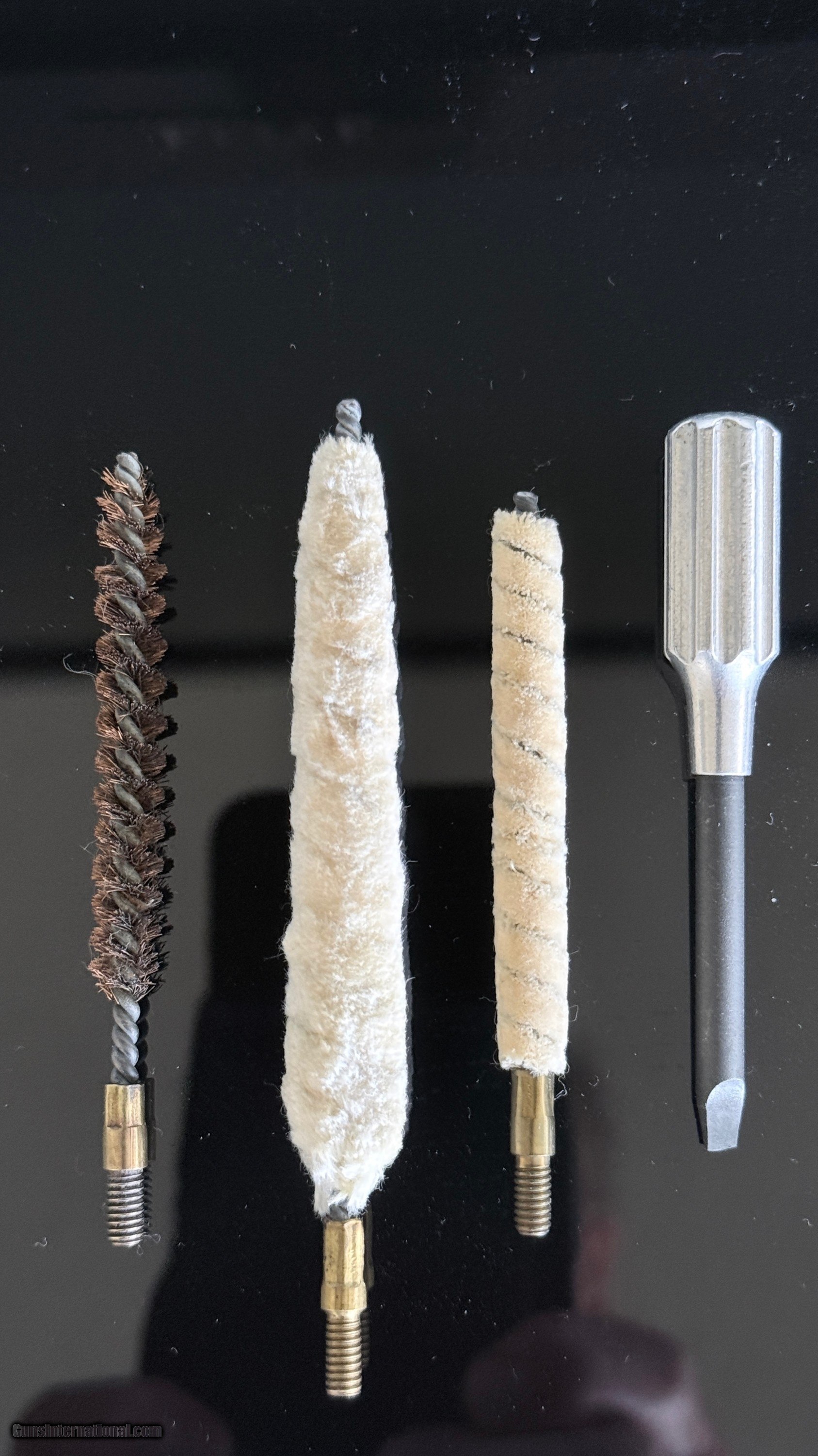 Description: BEING OFFERED SELDOM SEEN : SMITH AND WESSON MODEL 53 * REMINGTON JET 22 CALIBER * CLEANING KIT * SIGHT ADJUSTMENT TOOL * FACTORY ADVERTISING FLYER FACTORY ORIGINAL * CIRCA 1964-1973 FACTORY ORIGINAL KIT COMES PERIOD CORRECT AS *NEW OLD STOCK* BRASS STEM 22 CALIBER BORE BRUSH BRASS SEM TAPPERED BORE MOP BRASS STEM STRAIGHT BORE MOP REAR SIGHT ADJUSTMENT TOOL PERIOD CORRECT 1964-1973 (1961-1964 SIGHT ADJUSTMENT TOOL AVAILABLE UPON REQUEST) THIS KIT IS BEING OFFERED SIZED FOR AN 8 - 3/8 INCH BARREL COMES WITH A FACTORY 9 - 1/4 INCH FACTORY BORE ROD. ALSO AVAILABLE IN 4 OR 6 INCH BORE RODS UPON REQUEST. PLEASE SEE LAST LISTING PHOTO THE MODEL 53 JET CLEANING KIT WITH ITS SIGNATURE TAPPERED BORE MOP , MADE SPECIFICALLY TO FIT THE REVOLVERS BOTTLE NECK CHAMBERS, IS GIVEN NOTED REFERENCE AS BEING " UNIQUELY COLLECTIBLE " AND IS DOCUMENTED AS SUCH IN THE SMITH AND WESSON CATALOG , 3RD EDITION, PAGE 35. A COPY OF WHICH IS INCLUDED IN THE LISTING PHOTOS. THE SMITH AND WESSON FACTORY FLYER SHOWS AS PRESENTATION GRADE AND WAS INCLUDED AS PART OF A SHIPMENT SENT BY THE SMITH AND WESSON FACTORY TO A SMITH AND WESSON FIREARMS DISTRIBUTOR. PLEASE SEE ORIGINAL SHIPPING ENVELOPE INCLUDED IN LISTING PHOTOS. BUY WITH CONFIDENCE, PLEASE INQUIRE WITH ANY QUESTIONS. Price: $325.00 Shipping: $12.60 Buy Now Contact Seller |