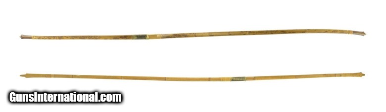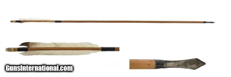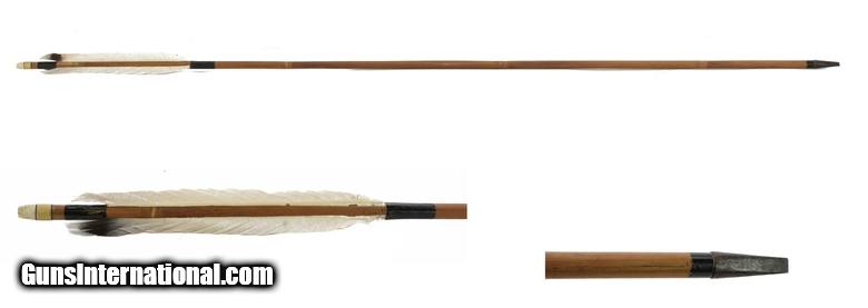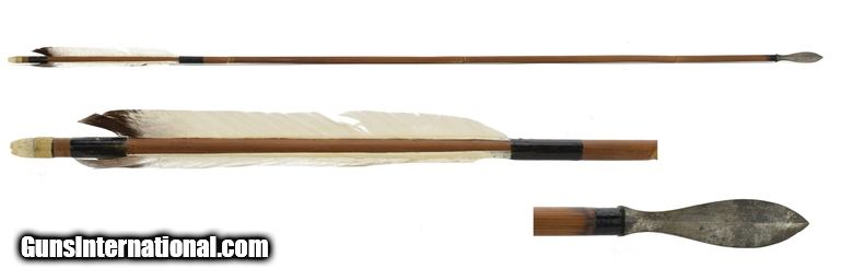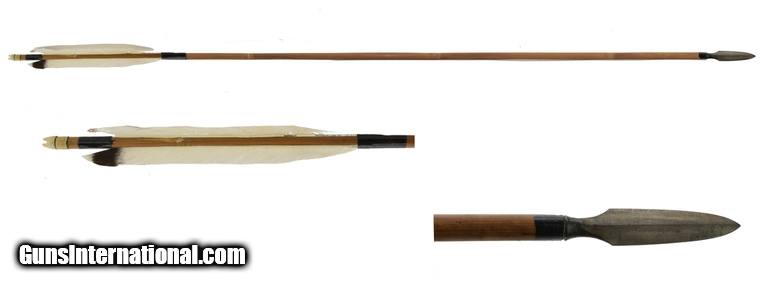 Description: Japanese Bow Unstrung with four white and gray fletching hunting arrowhead tipped arrows. SOLD |