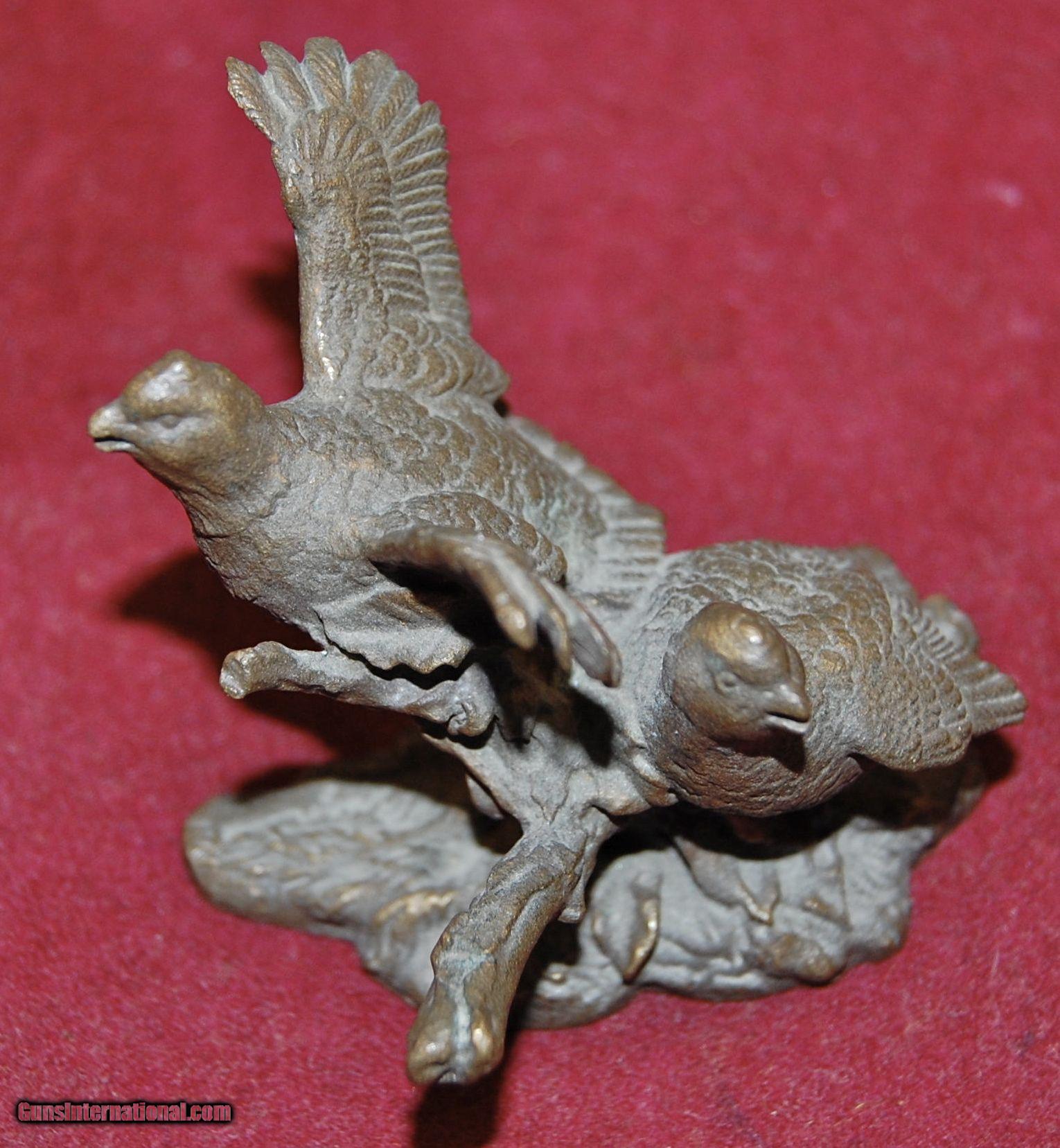 Description: Bronze paperweight of two bobwhite quail flushing.This piece was part of a wildlife series done by Avon in the late 1970s and 1980s.It is 31/2" tall and 3" long.A nice addition to your desk or mantle. SOLD |
