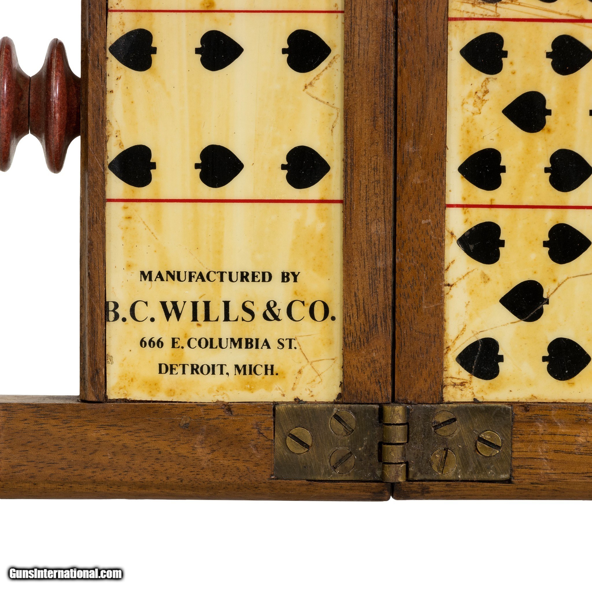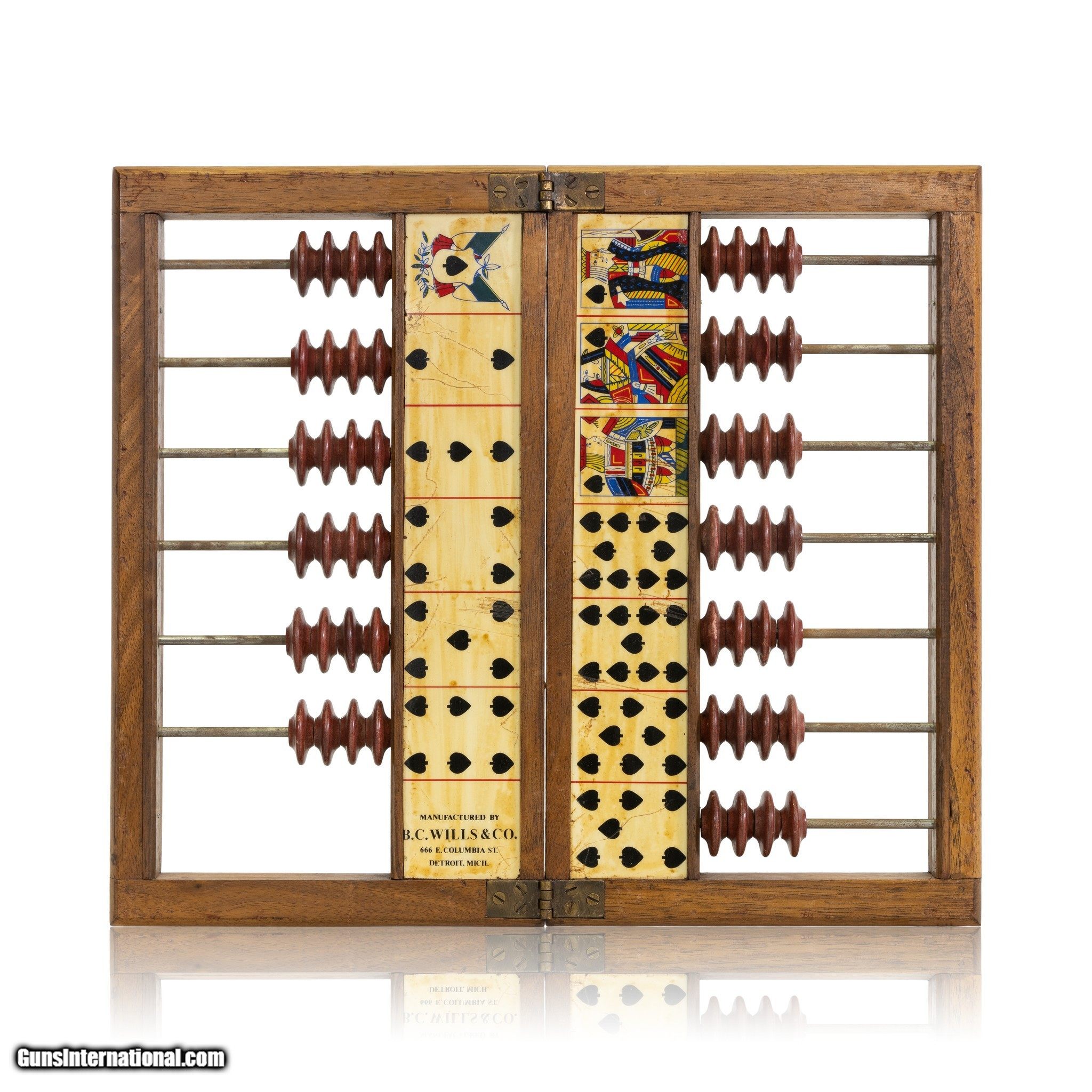 Description: Case keeper in spades by B.C. Willis & Co., 666 E. Columbia St. Detroit, Michigan. Keeper is in good overall condition for playing faro, casino favorite, in the saloons of Virginia City and the Old West. 13" x 12" Extended SOLD |