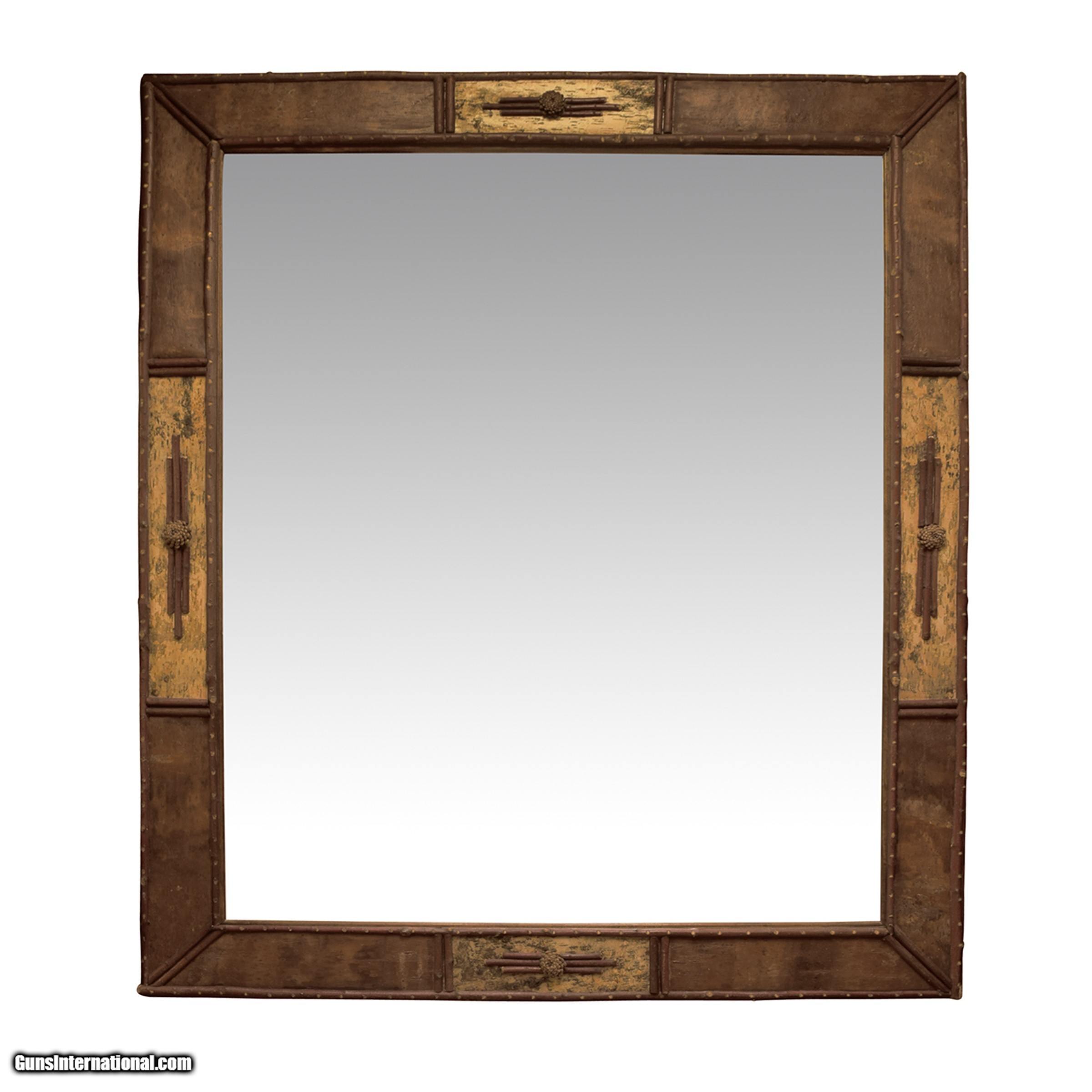 Description: Chip-carved chest, twigwork, pine cones, antler handles, natural edge. 4 doors and 4 drawers, brown birchbark with twigwork accents. 6'wide x 21"deep x 42"H with matching beveled mirror, 78" x 67". Priced as a pair, but can break apart. PERIOD: Contemporary ORIGIN: Cisco's SIZE: Chest 6'W x 21"L x 42"H; mirror 78" x 67" SOLD |