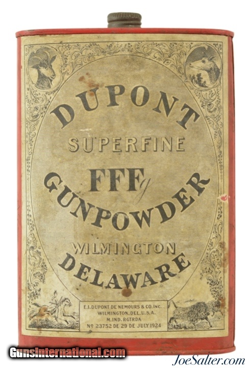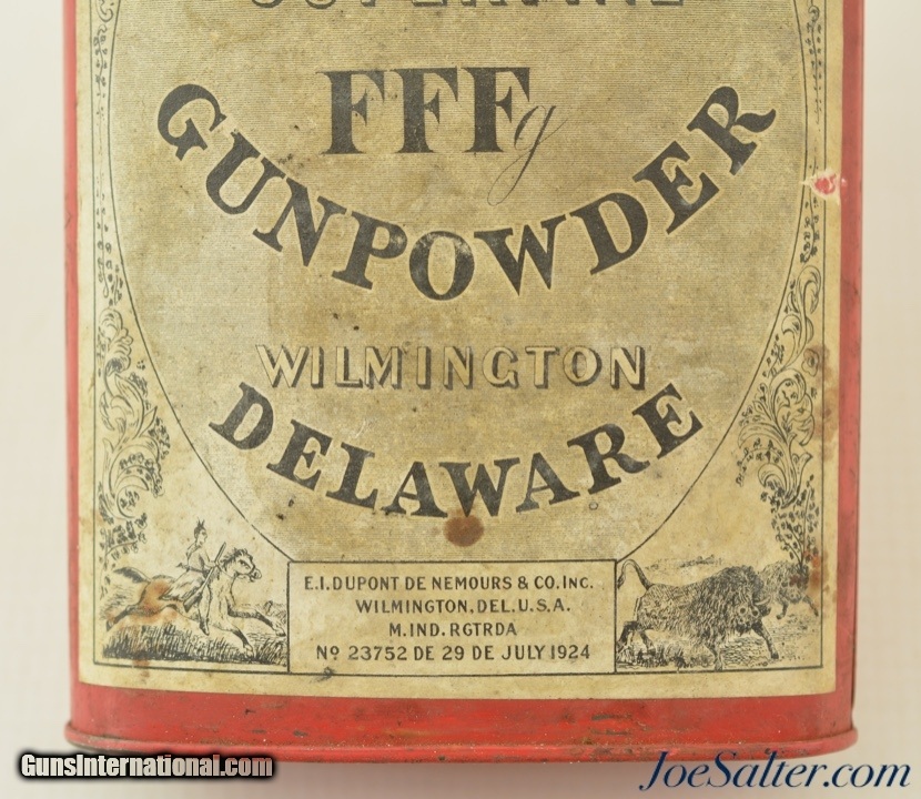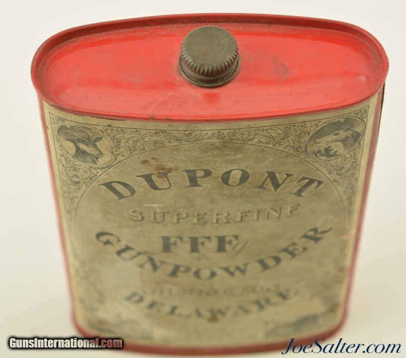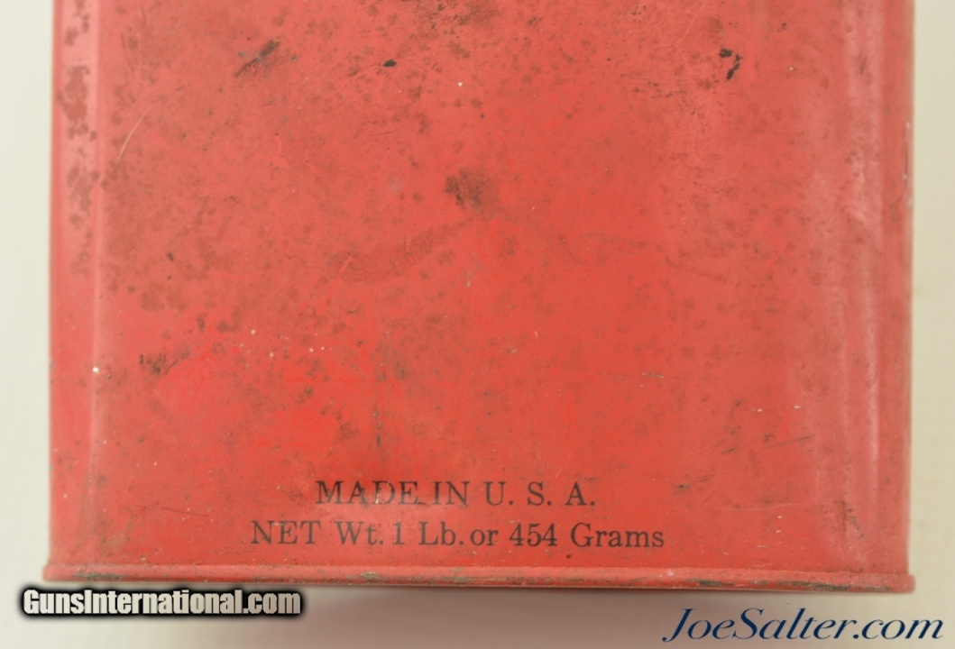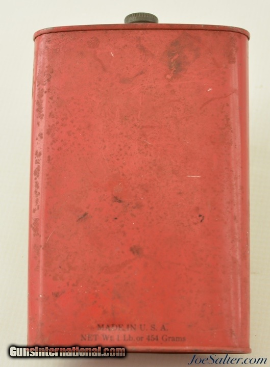 Description: This is an empty Dupont black powder tin with a July 1924 date. The painted tin can is in very good condition with most of the original red paint with surface dirt that should clean well. There is a small dent in the very bottom of the back where it says "Made In U.S.A." and some edge wear. The cap is present and works properly. The label is in good condition and has darkened with age. There is an 1/8 inch round area missing half way up on the right side with a scratch and scattered areas of light staining. Please see the photographs for further information on condition.; SOLD |
