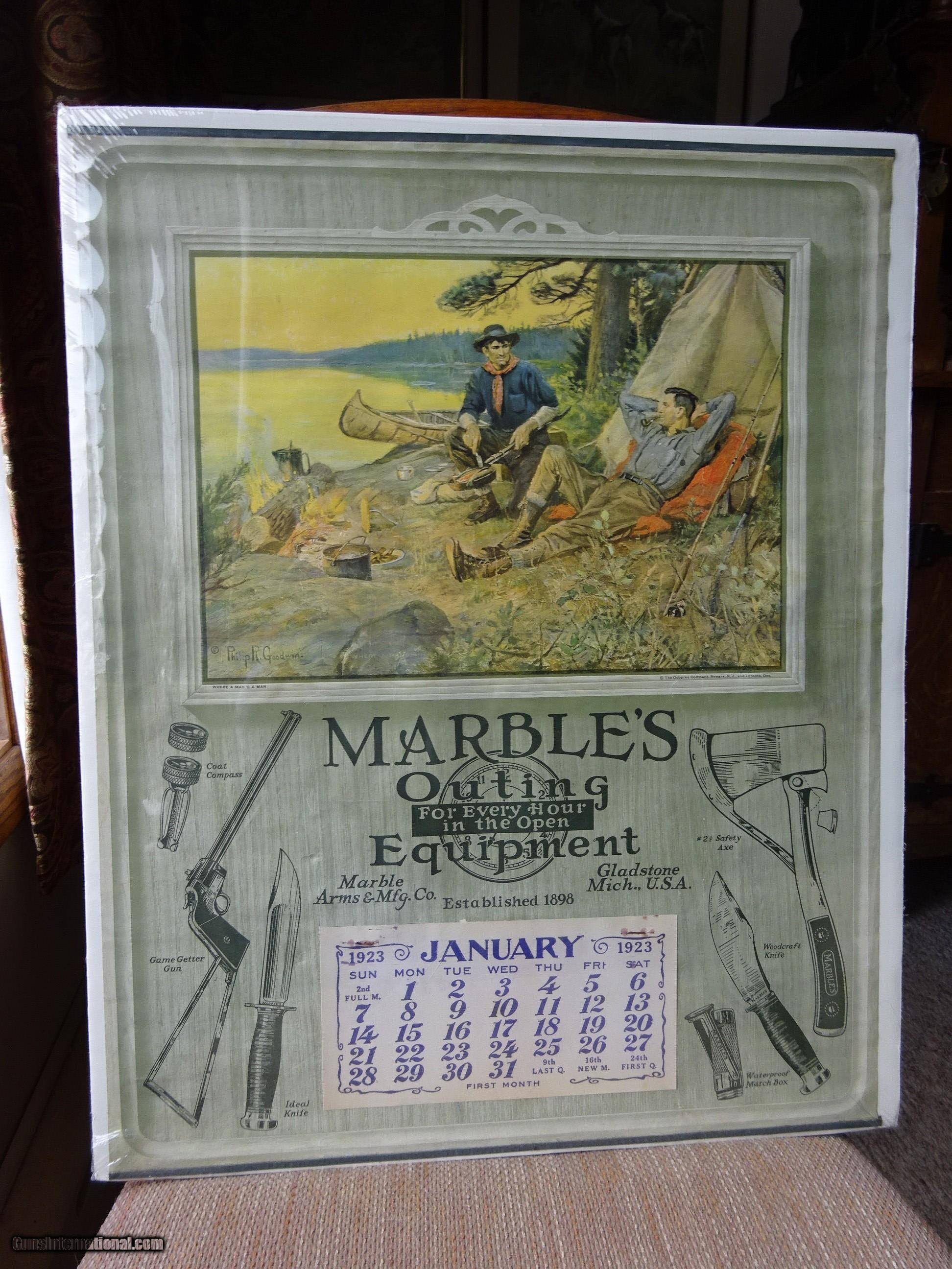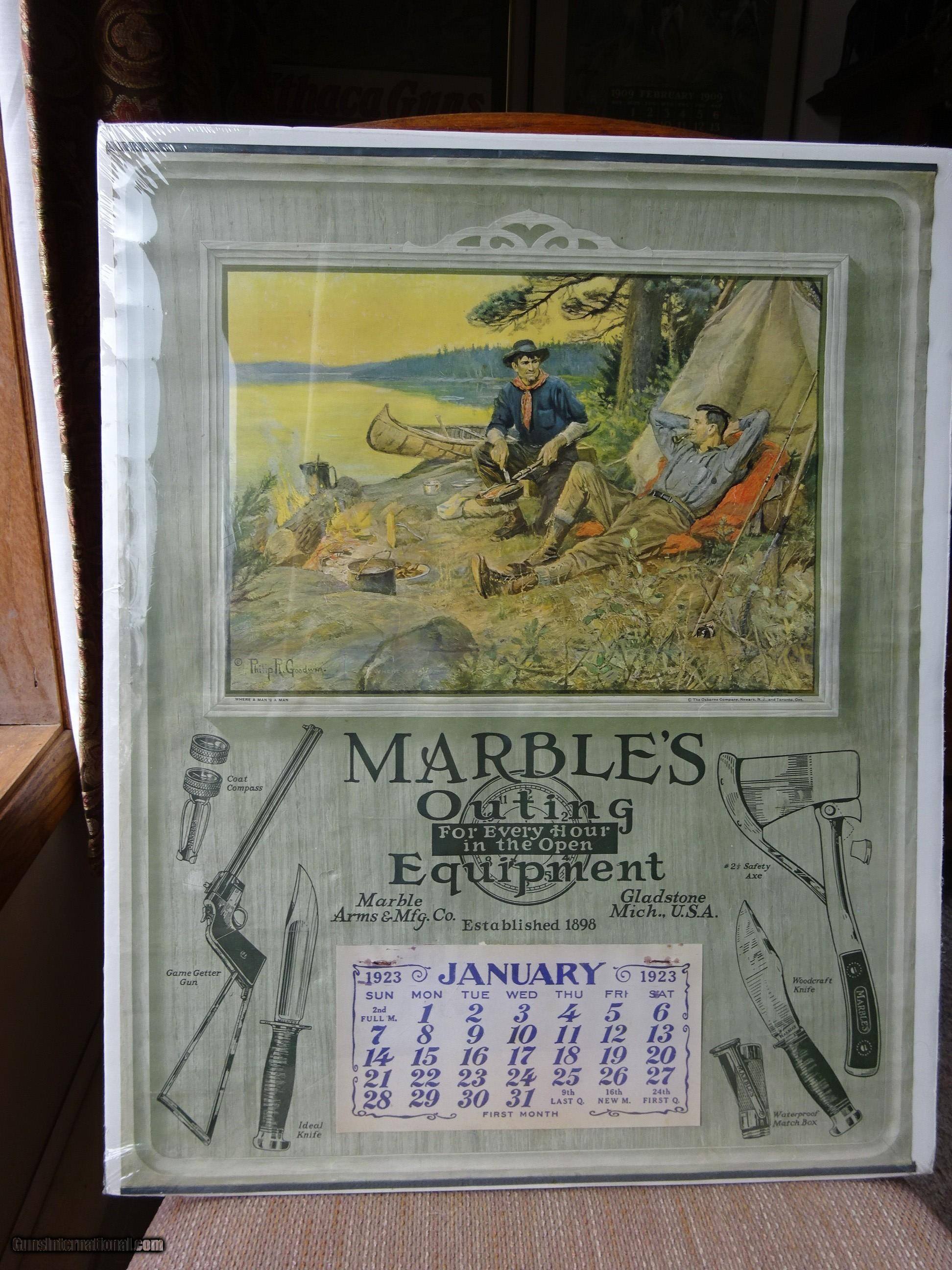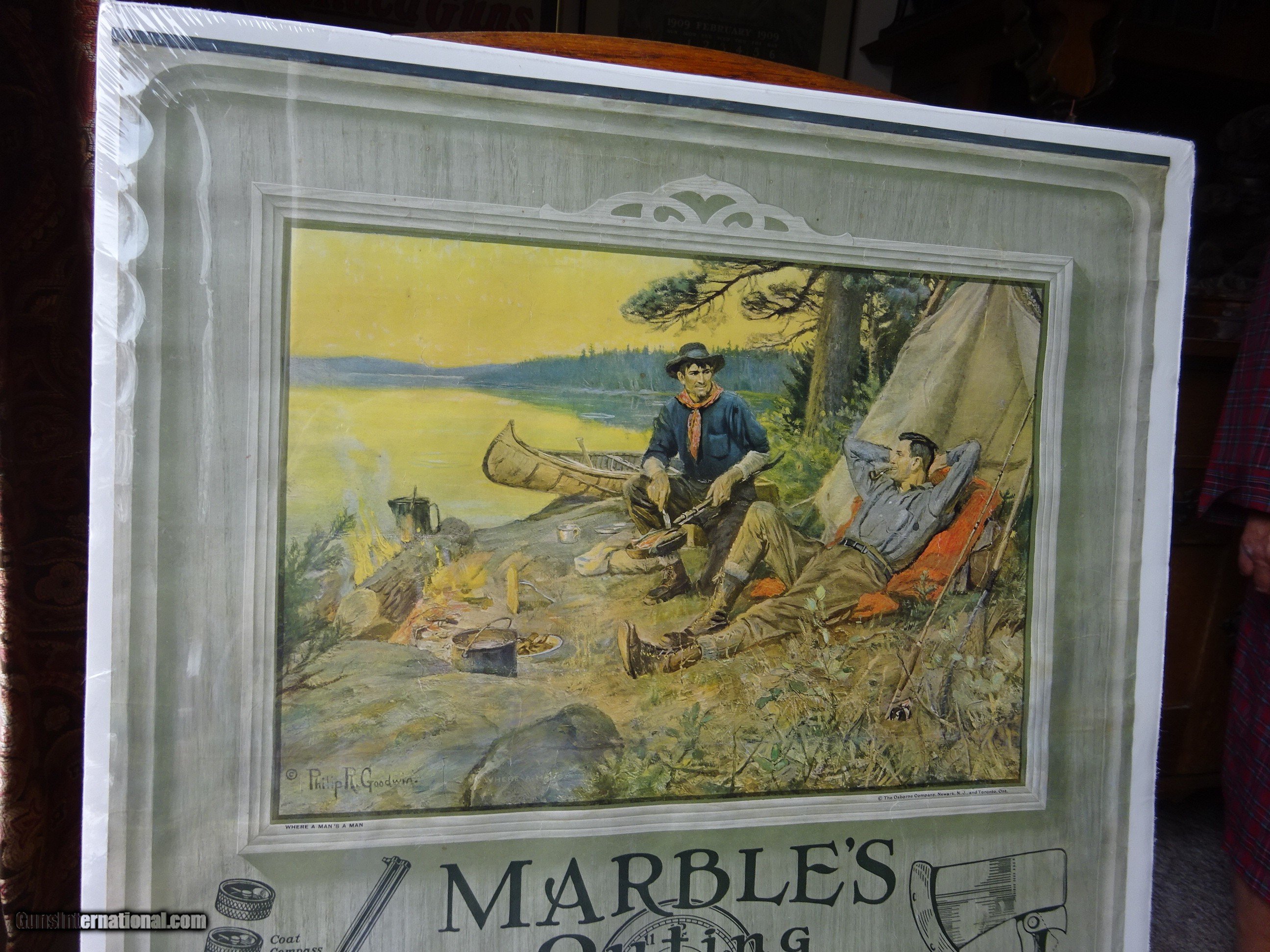 Description: MARBLES ARMS & MFG. CO. GLADSTONE MICH. USA., 1923 CALENDAR. PHILIP R. GOODWIN IMAGE TITLED "WHERE A MAN IS A MAN", FULL-COLOR CAMPING, AND FISHING SCENE ACROSS THE TOP, AND VARIOUS MARBLES PRODUCTS ALSO PICTURED. 23 1/2" TALL, 18 1/2" WIDE. METAL BAND AT TOP AND BOTTOM. OUTSTANDING ORIGINAL CONDITION. NO ROLL WRINKLES, TEARS OR BLEMISHES. VERY RARE PIECE OF SPORTING COLLECTIBLE ADVERTISING. THE FIRST TWO PHOTOS ARE BASICALLY THE SAME. I WAS TRYING TO LESSEN THE GLARE OFF THE SHRINK-WRAP ON THE LEFT SIDE. $5500.00 + $50.00 Insured shipping. Layaway is available. See all Pats gun listings on this site! We also have hundreds of ORIGINAL gun company advertising & memorabilia pieces available for sale on our site SPORTINGCOLLECTIBLES. We have no reprints or reproductions. Email for more information. If you need to call, morning or evening is best, and please note the Seller's Inventory number. SOLD |