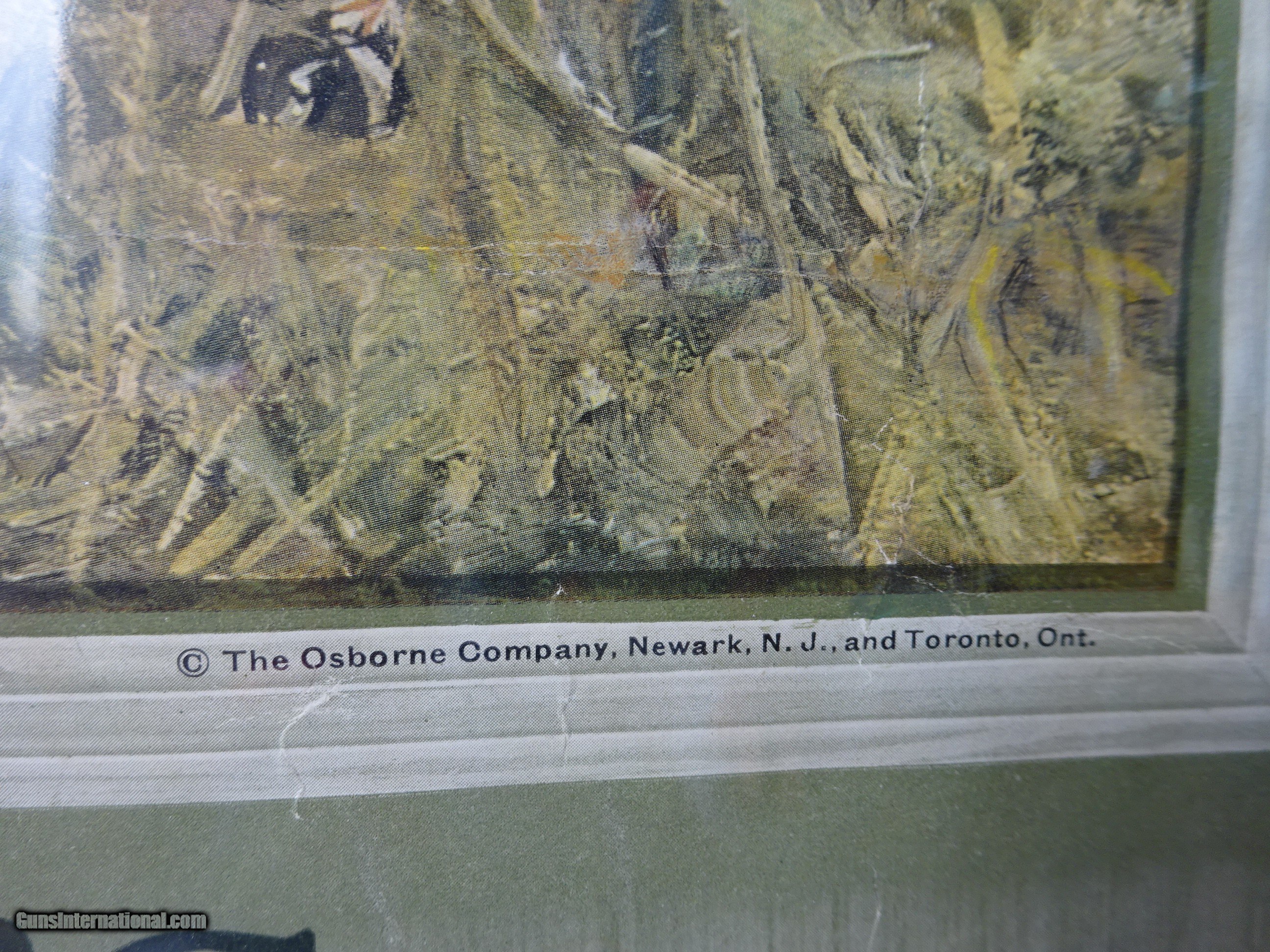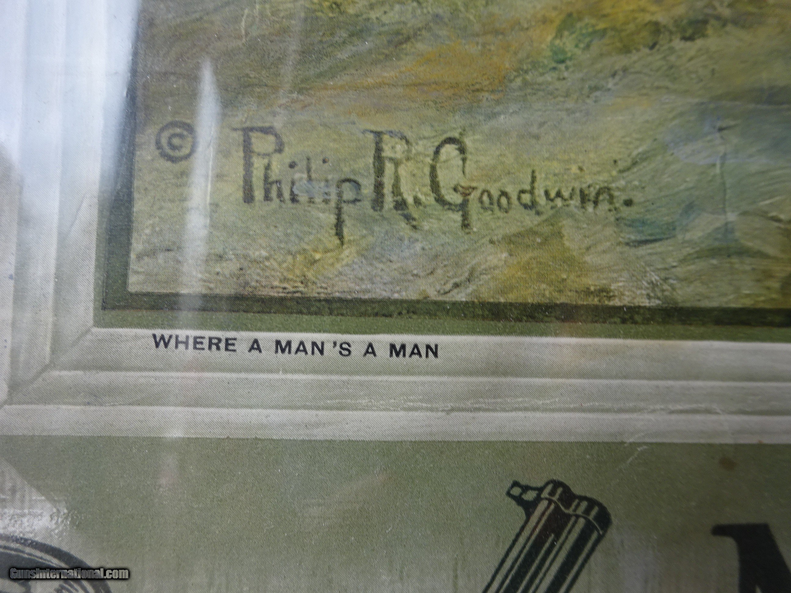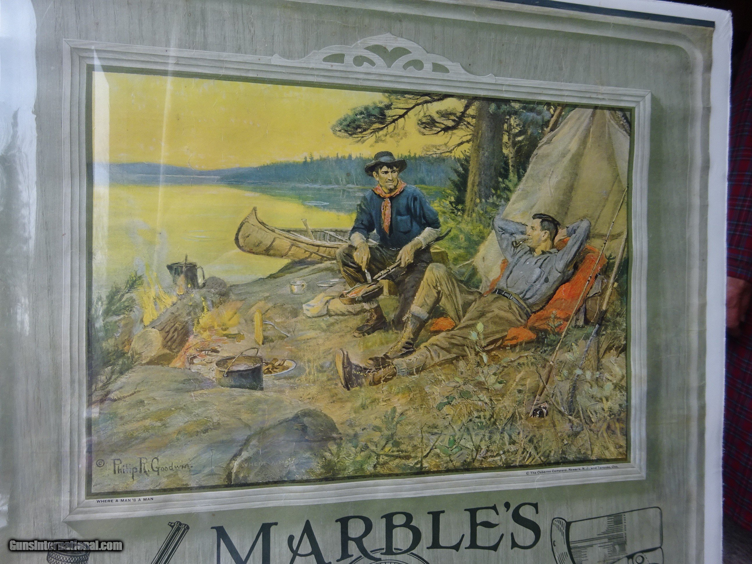Description: MARBLES ARMS & MFG. CO. GLADSTONE MICH. USA., 1923 CALENDAR. PHILIP R. GOODWIN IMAGE TITLED "WHERE A MAN IS A MAN", FULL-COLOR CAMPING, AND FISHING SCENE ACROSS THE TOP, AND VARIOUS MARBLES PRODUCTS ALSO PICTURED. 23 1/2" TALL, 18 1/2" WIDE. METAL BAND AT TOP AND BOTTOM. OUTSTANDING ORIGINAL CONDITION. NO ROLL WRINKLES, TEARS OR BLEMISHES. VERY RARE PIECE OF SPORTING COLLECTIBLE ADVERTISING. THE FIRST TWO PHOTOS ARE BASICALLY THE SAME. I WAS TRYING TO LESSEN THE GLARE OFF THE SHRINK-WRAP ON THE LEFT SIDE. $5500.00 + $50.00 Insured shipping. Layaway is available. See all Pats gun listings on this site! We also have hundreds of ORIGINAL gun company advertising & memorabilia pieces available for sale on our site SPORTINGCOLLECTIBLES. We have no reprints or reproductions. Email for more information. If you need to call, morning or evening is best, and please note the Seller's Inventory number. SOLD |