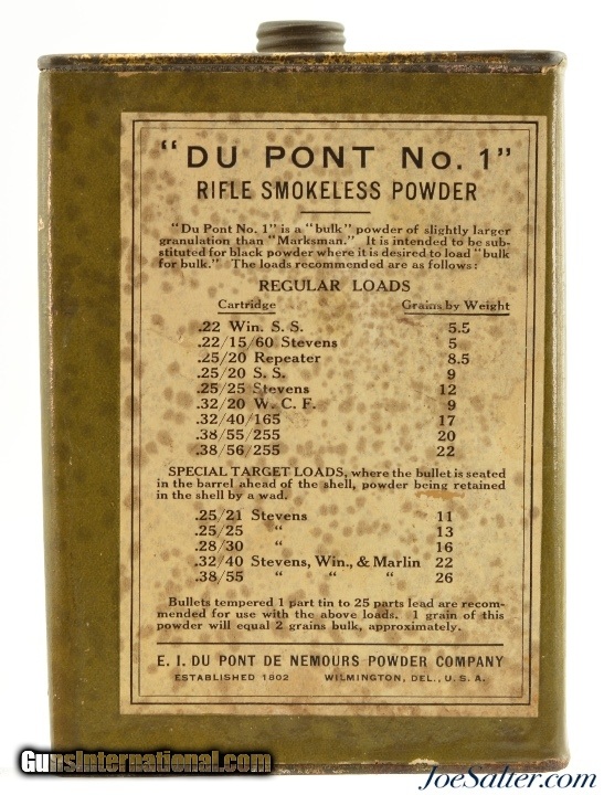Description: This is an empty tin manufactured by Dupont with No. 1 Smokeless powder for reloading rifle cartridges that "has been especially designed for use by clubs and civilian organizations" dating to circa 1912-1926. It measures 5 ¼ inches tall by 3 ¾" wide and features a laurel wreath design. The tin is in near excellent condition with the colorful graphics have bright colors with some overall age darkening. SOLD |