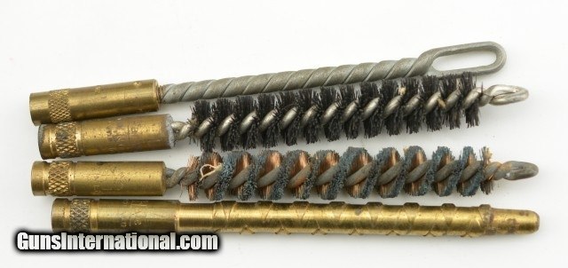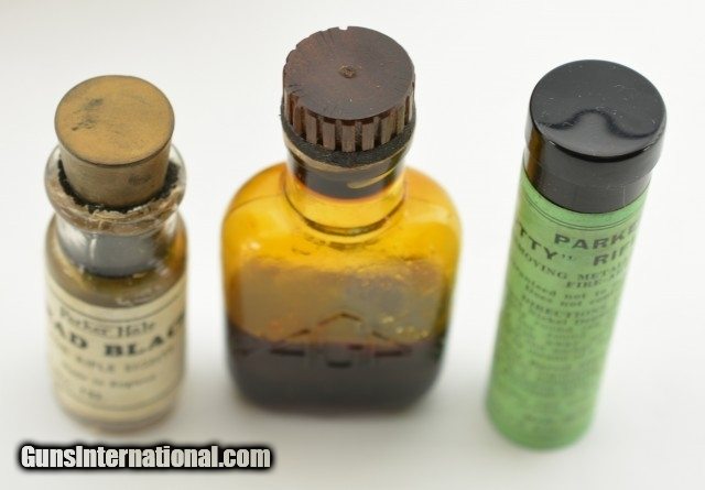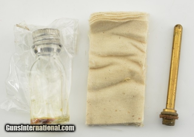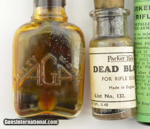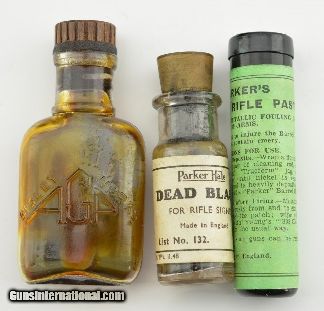 Description: This is an exceptionally nice depression era, English made Parker-Hale gun cleaning kit in a locking, hinged Mahogany box with a metal company logo disc on the front. The neat little box has fitted compartments for each of the included supplies. Included is one glass bottle of Parker Hale "DEAD BLACK" for rifle sights; one glass bottle impressed "Bisley Works AGP" logo half full of solvent; one plastic tube of Parkers "Motty" rifle paste with 5/35 date code; one oil bottle with screw in nozzle; and 4 assorted jags and brushes. A great looking cleaning kit which harkens back to a golden age of shooting that would look great on display in a gun room or with your vintage English rifle or pistol. SOLD |