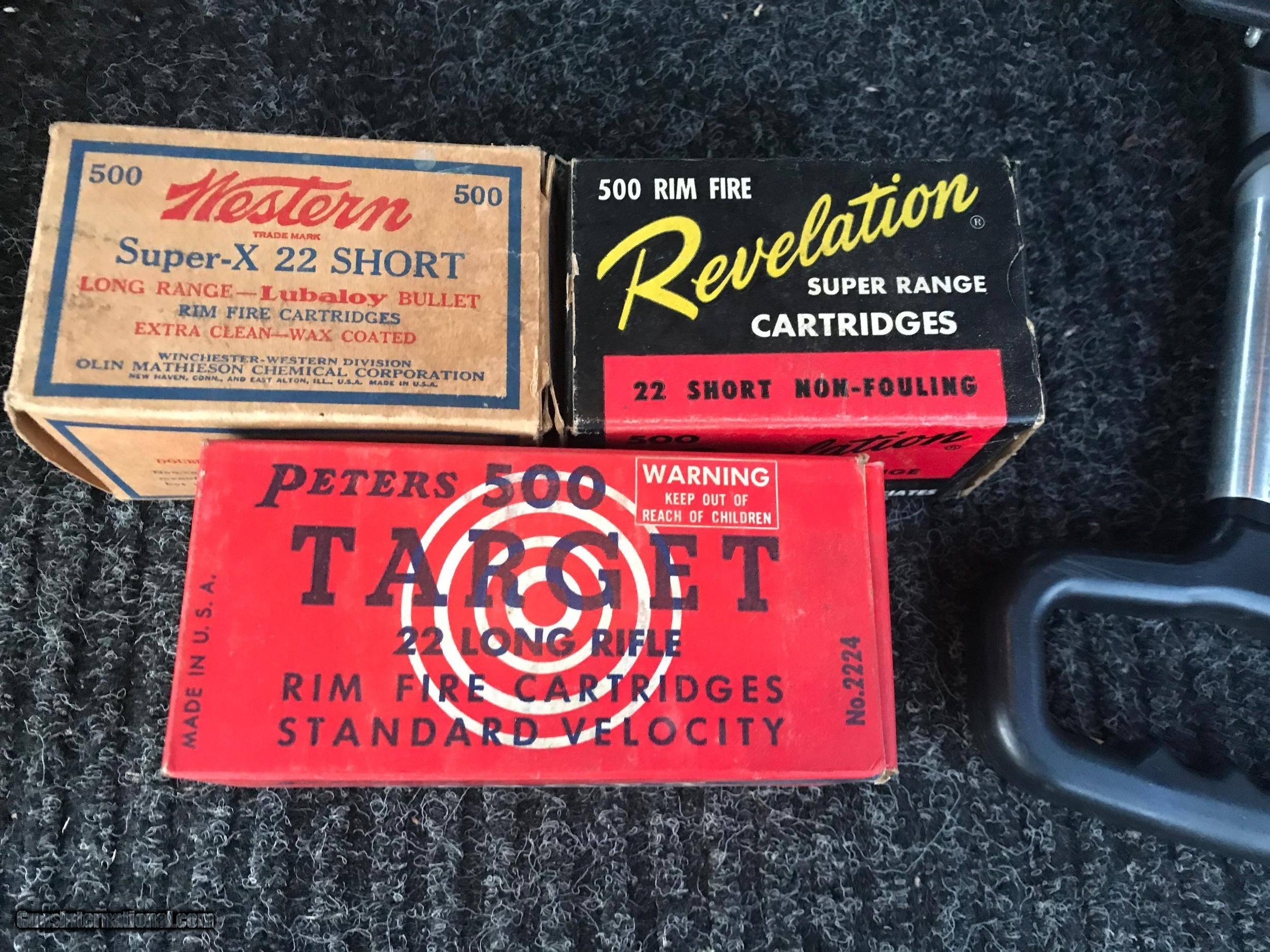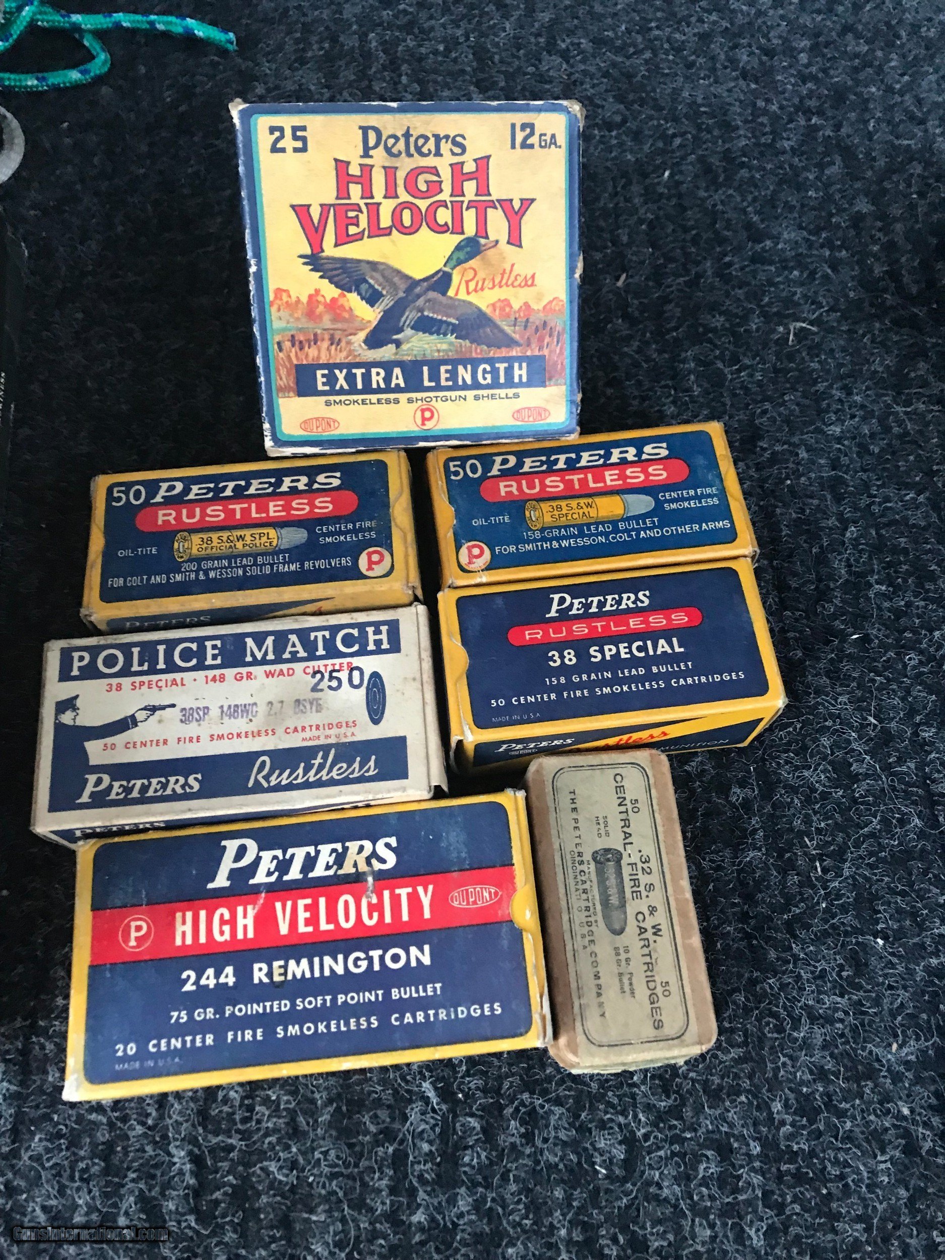 Description: 7 Peters empty ammo boxes. Four 38 special, 1 244 Remington, 1 12 gauge Duck box, 1 22 LR target Brick box, 1 32 S&W ,1 Western 22 short brick box, 1 Revelation 22 short brick box. SOLD |