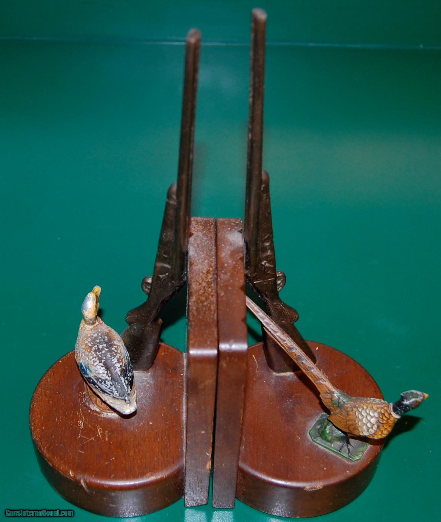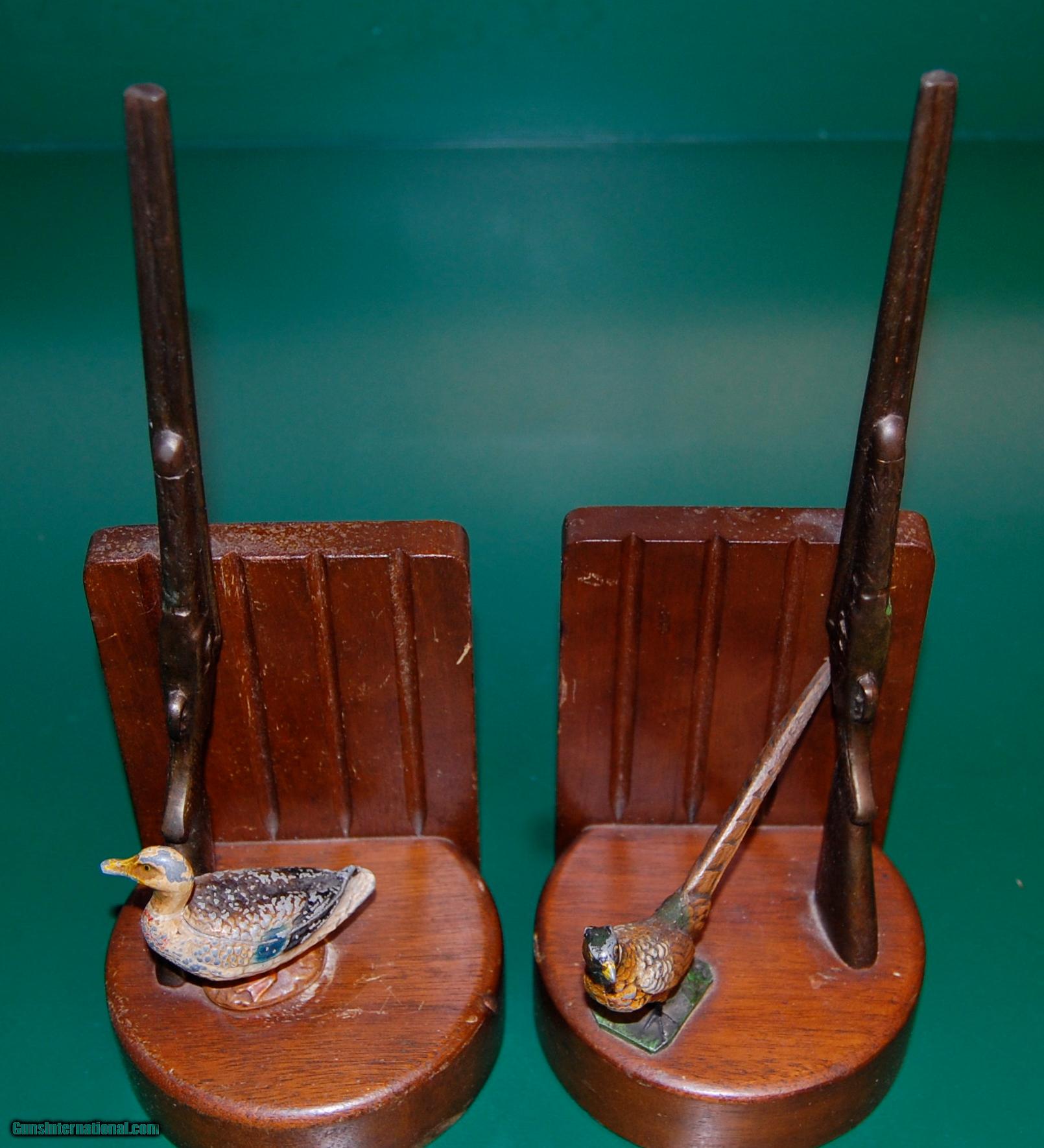 Description: Very unusual bookends from the late 194's or early 1950's.Weighted wooden bookends with cast metal double barreled shotguns and cast metal pheasant and duck.A classic addition to your gunroom or den. SOLD |