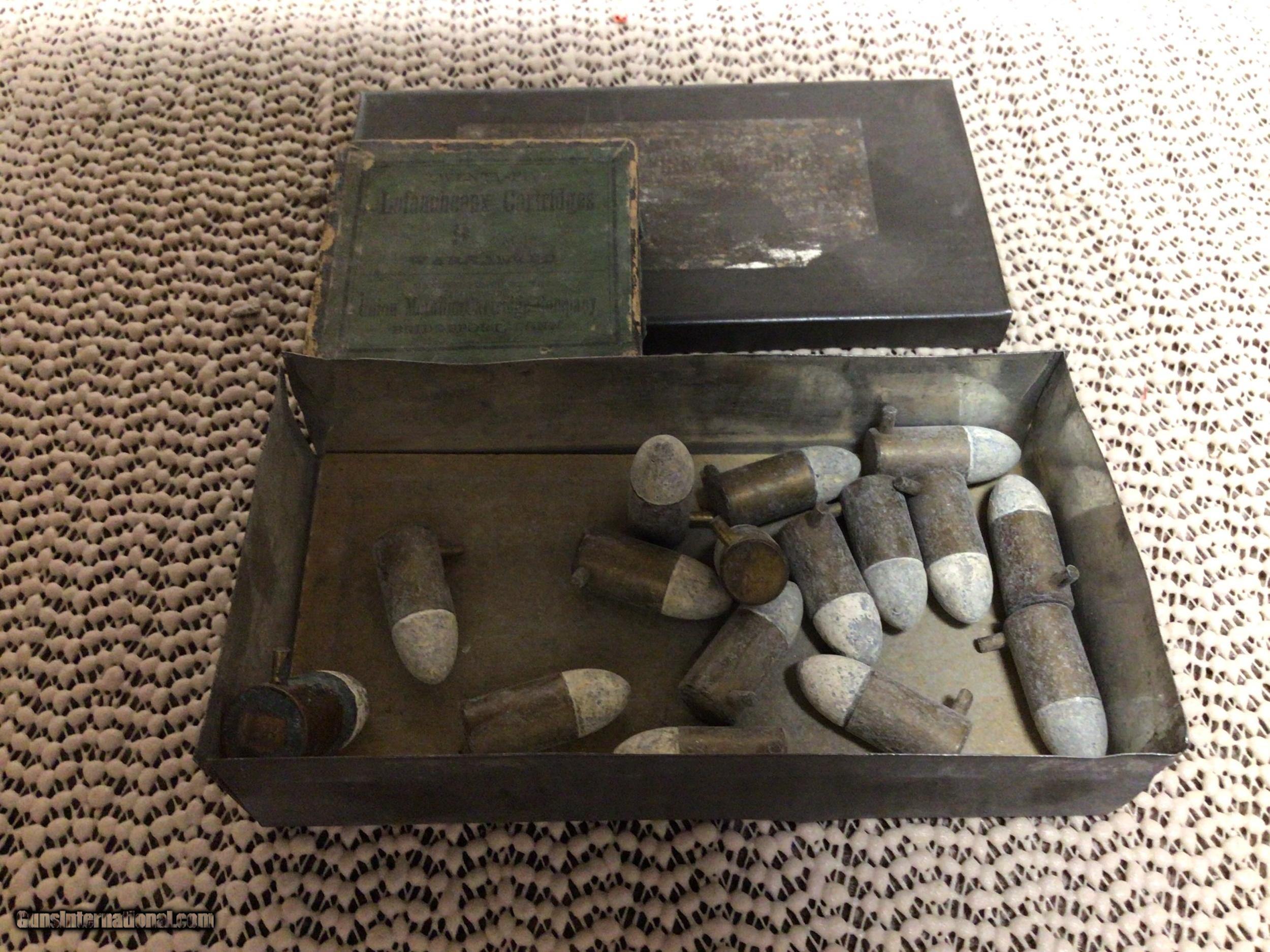 Description: 15 pinfire shells #9 letter u on bottom 1 larger marked sb Lefancheanx box top marked 9 Union Matallic Cartridge Company very good condition SOLD |