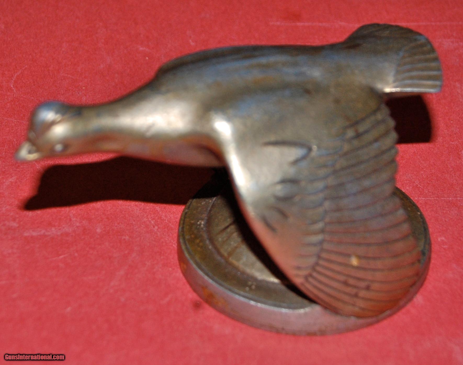 Description: A very unusaul flying quail ornament designed to fit the radiator cap of a model T.The quail is around 4 inches long and is made of heavy cast metal with a brass finish.It appears to be old enough to have been in the model T era.A great desk or mantel ornament for the den or gunroom. SOLD |