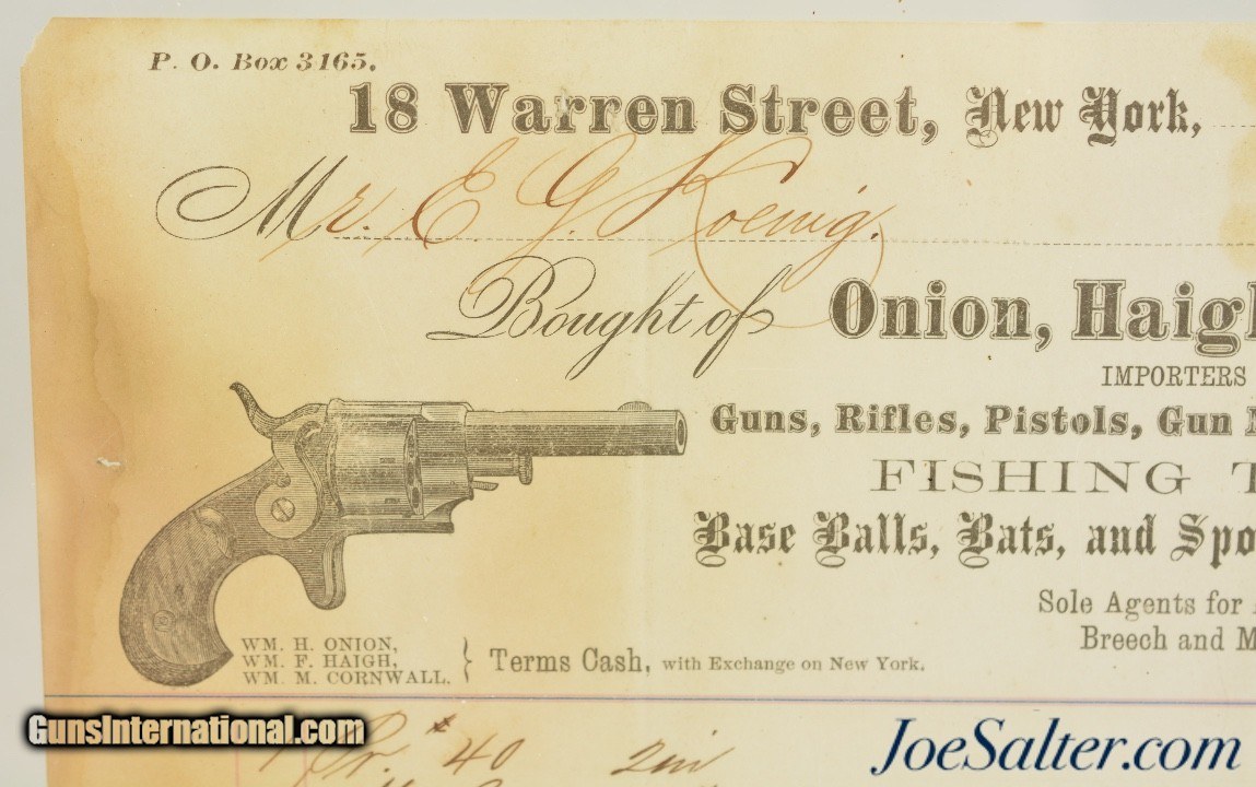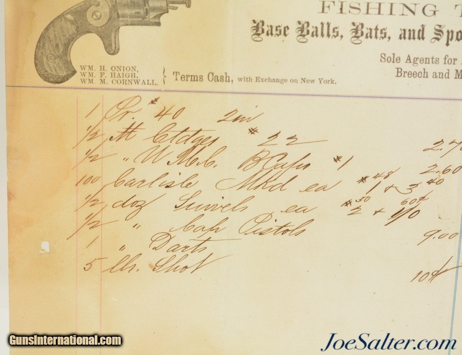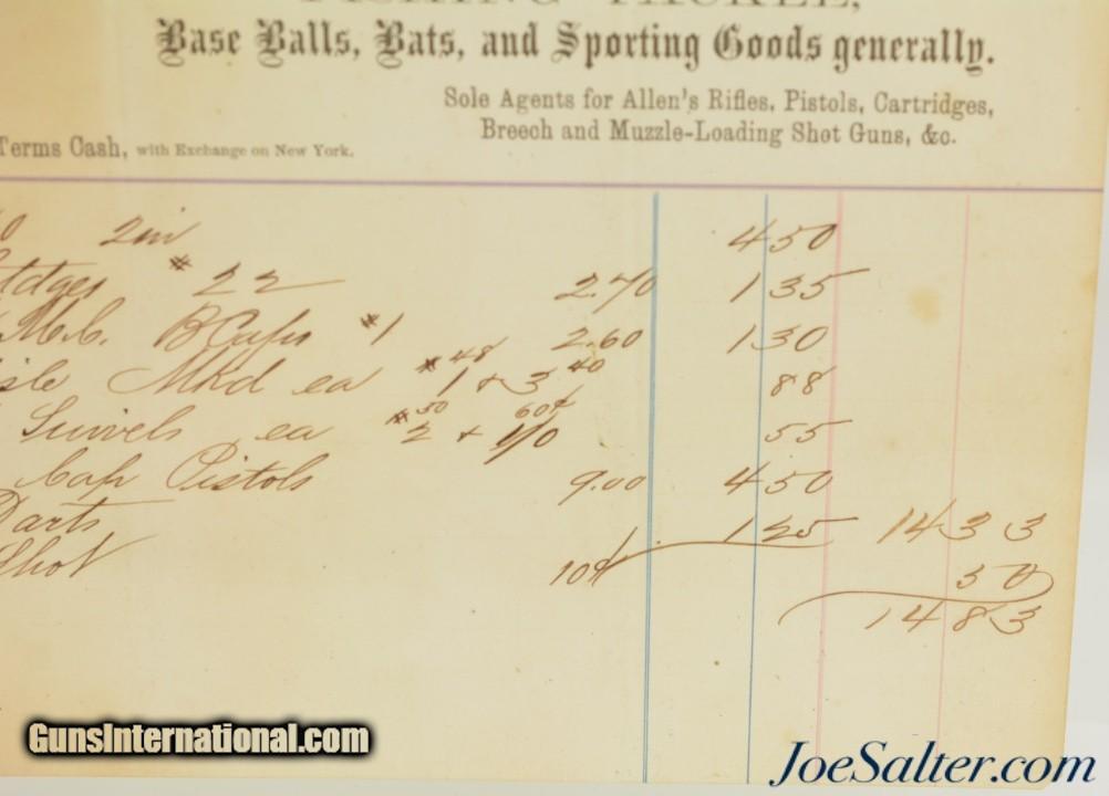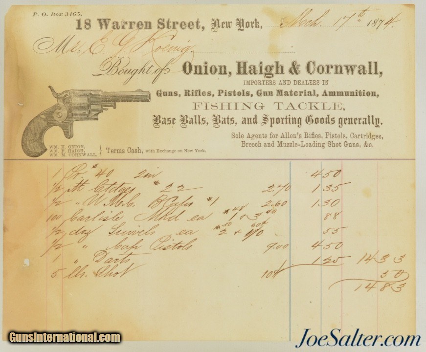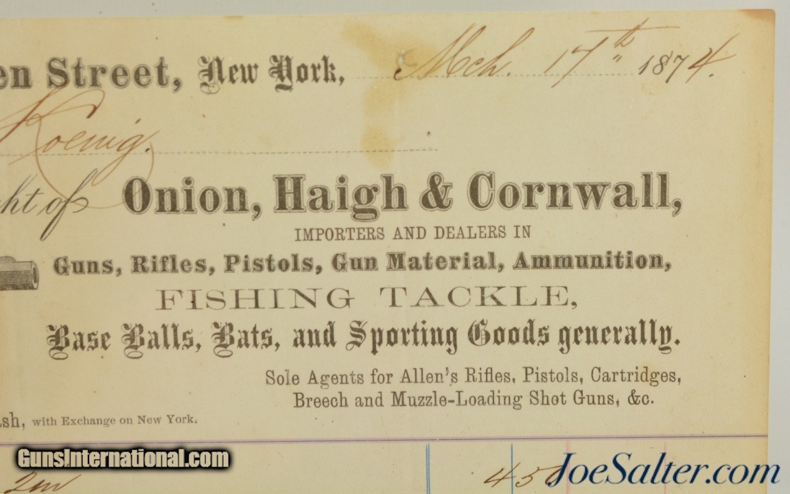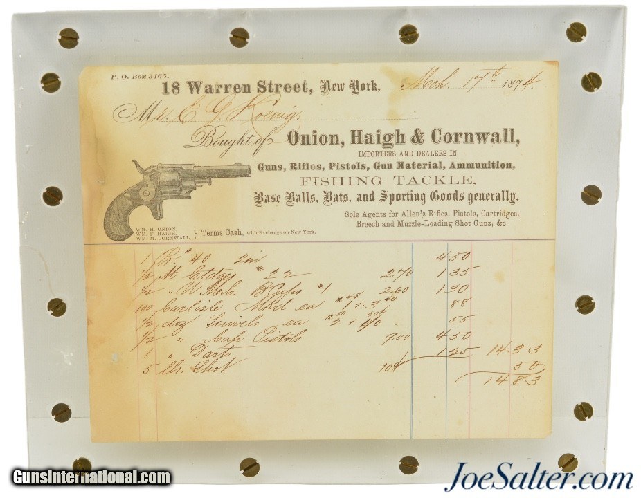 Description: This is a rare surviving piece of ephemera from NY in the 1870's from the company of Onion, Haigh & Cornwall "importers of Guns, Rifles, Pistols, Gun Material, Ammunition, / FISHING TACKLE / Base Balls, Bats and Sporting Goods generally." The 1874 dated ledger receipt shows an Allen Side hammer .22 revolver with the statement that they were "Sole Agents for Allen's Rifles, Pistols, Cartridges, Breech and Muzzle-Loading Shot Guns, &c.." Encased between two sheets of thick plastic the preserved receipt remain in excellent condition with crisp graphics. This will make an excellent display item to pair with an antique Side Hammer or other Allen firearm. Price: $245.00 Contact Seller |