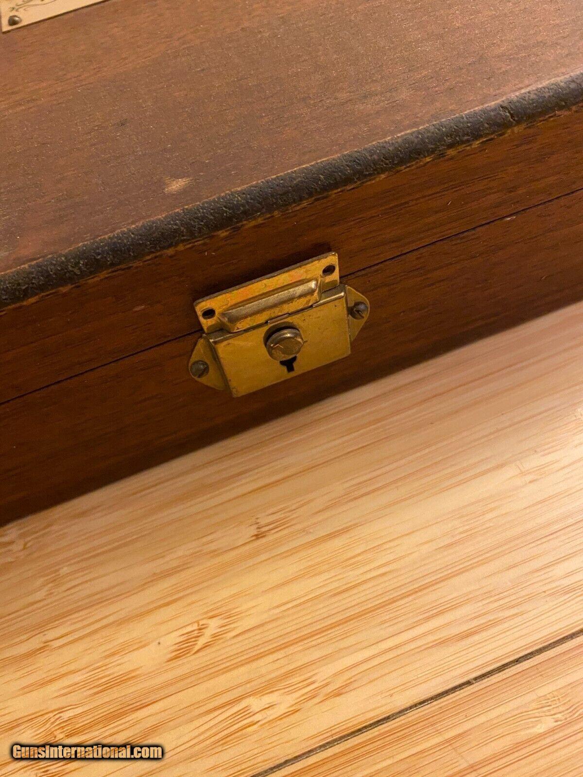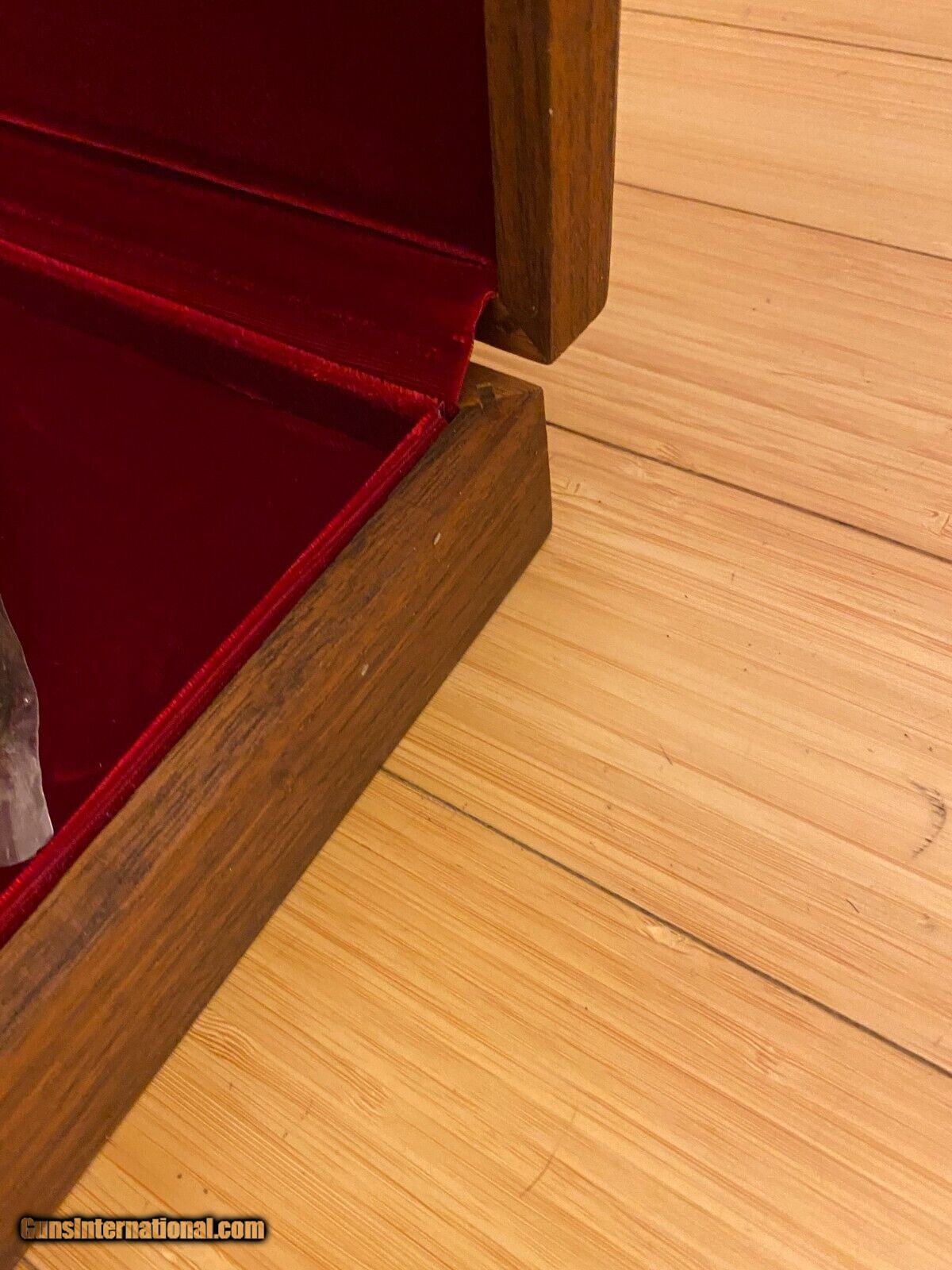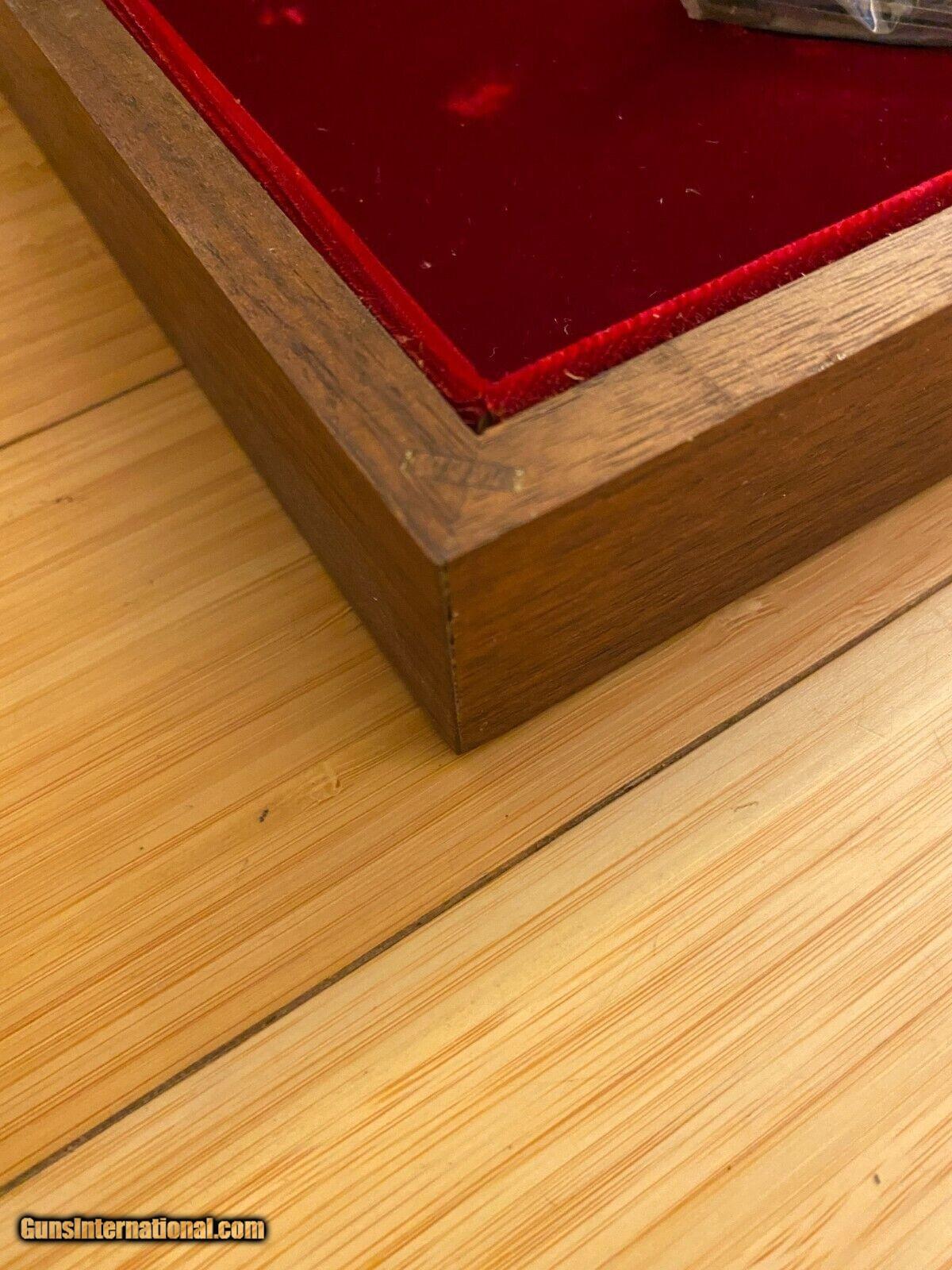 Description: Very Rare Rare Browning Centennial Limited Edition Pocket Knife Set 1978 (3) Knife Set Knives Never used brand new Will come in original plastic bags The Box is all Wood but has some aging wear as you can see in the pictures Inside the box the fabric has some indentations and marks the corners of the box are in good condition no chips cracks or dents The top of the box has some age marks on it from sitting inside a garage for over 40 years You can probably refinish it and stain it to bring it back to its original look. The knives have never been used. As you can see they are brand new and very shiny. No Rust or marks on blades. This Beautiful Browning Stag 1878 - 1978 Centennial 3 stag knife set features One Canoe, One Stockman and One Medium Lockback in a beautiful locking Walnut wood with red velvet lined display case. The case has a metal Browning Centennial placquard on the top. It also includes 2 keys. The knives were made in Germany. It is a very rare Browning set as the production was limited. The stag on the knives have lots of character. The three knives feature Genuine Stag handles, Brass bolsters, pins and liners and Stainless Steel Blades. The main blades are etched "BROWNING CENTENNIAL 1878-1978". Condition is New.Each knife has Serial #0182 stamped on the back.The Browning Stag Canoe measures 3 5/8" closed.The Browning Stag Stockman measures 3 3/8" closed.The Browning Stag Lockback measures 4 3/8" closed Contact me if you'd like to see more pictures of knives. Thanks for looking! SOLD |