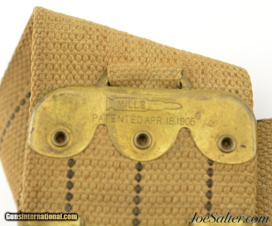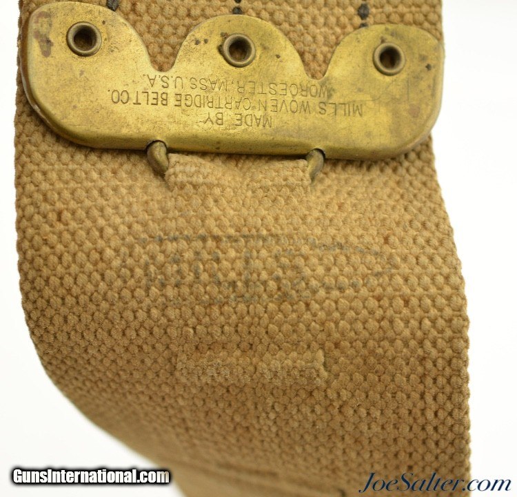 Description: This is an original Anson Mills woven sporting cartridge belt manufactured in Worcester, Mass by the Mill's Woven Cartridge Belt Company. It is nicely marked and has the Mills cartridge logo with April 18, 1905 patent date. The sporting belt has the classic dog's head buckle and is 3 inches wide with 35 cartridge loops. It remains in excellent condition with slight age soiling and pleasing aged brass. Price: $195.00 Contact Seller |