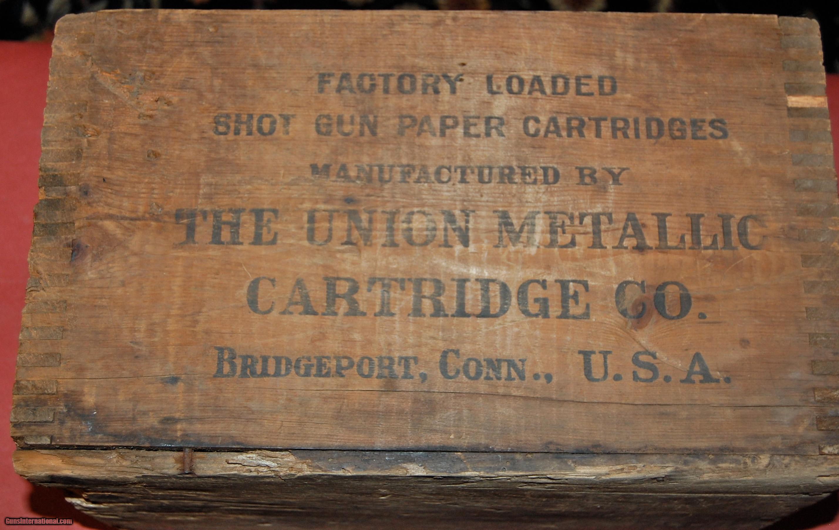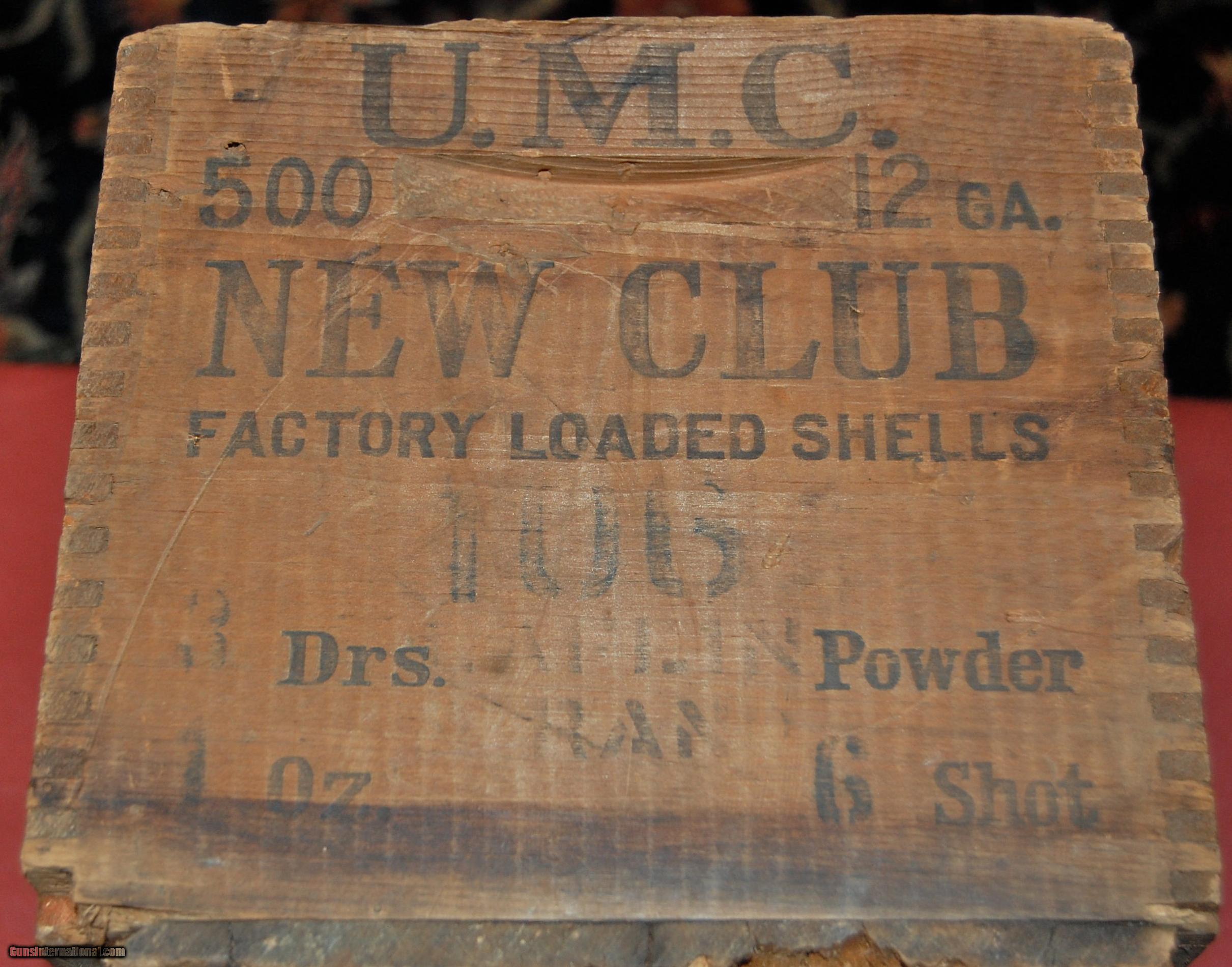 Description: Very old New Club wooden shotshell box.This is the oldest box I have owned.The New Club line was discontinued around 1905,so this box was made prior to that date.It is dovetailed construction.The markings are still clear and readable.The box is sound,but has obviously been in a barn or warehouse for some time.A great addition to your den or gunroom to keep magazines or kindling for the fireplace in. SOLD |