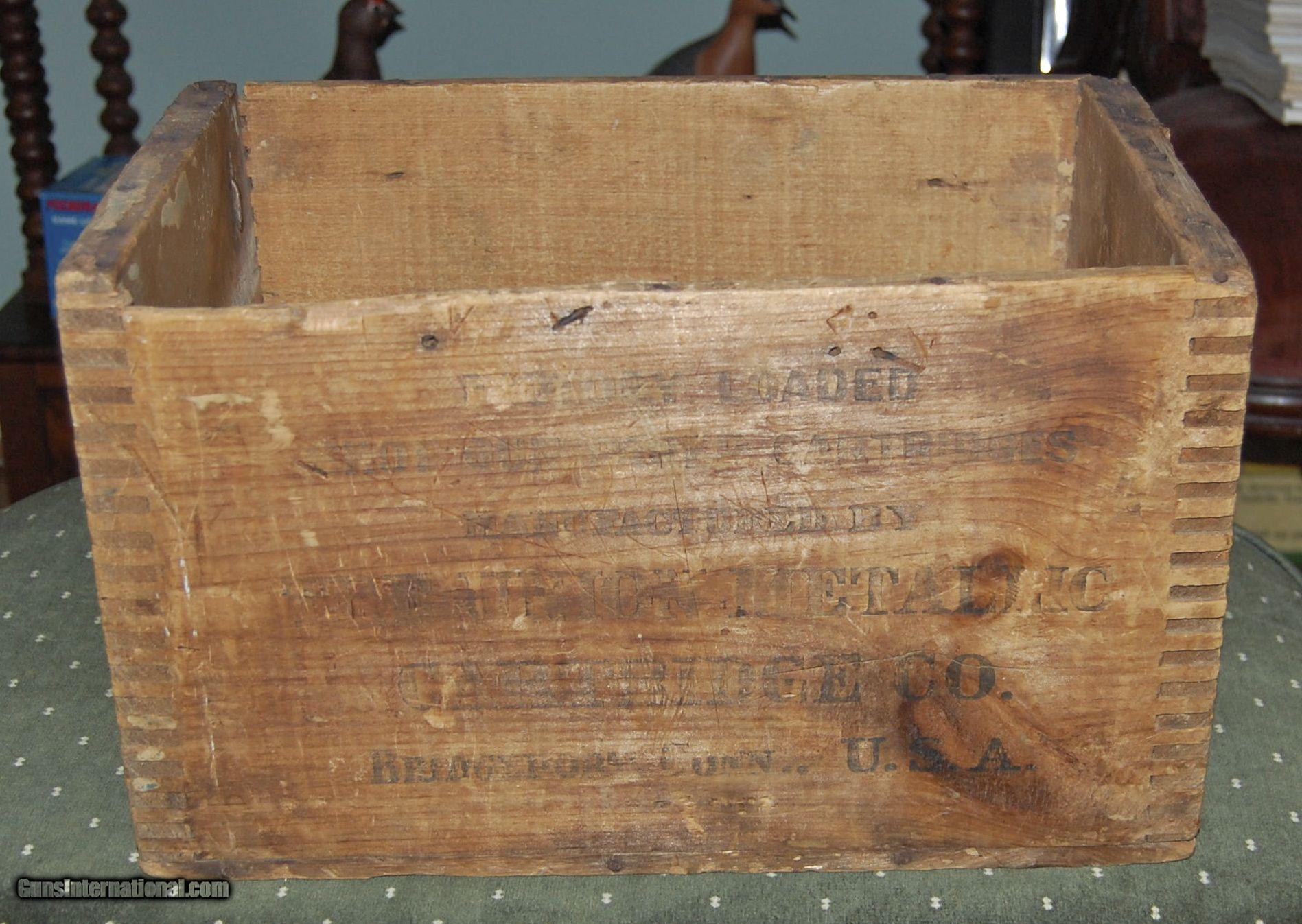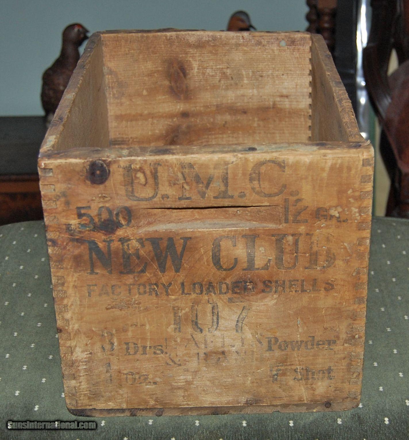 Description: A very old UMC New Club 12 gauge wooden shell box circa early 1900s.This box is built with the old style dovetailed corner construction and is very sound.The lettering is somewhat faded,but is easily readable.These old dovetailed boxes are getting harder to find.A great item for your gun room,den,or hunting camp. SOLD |