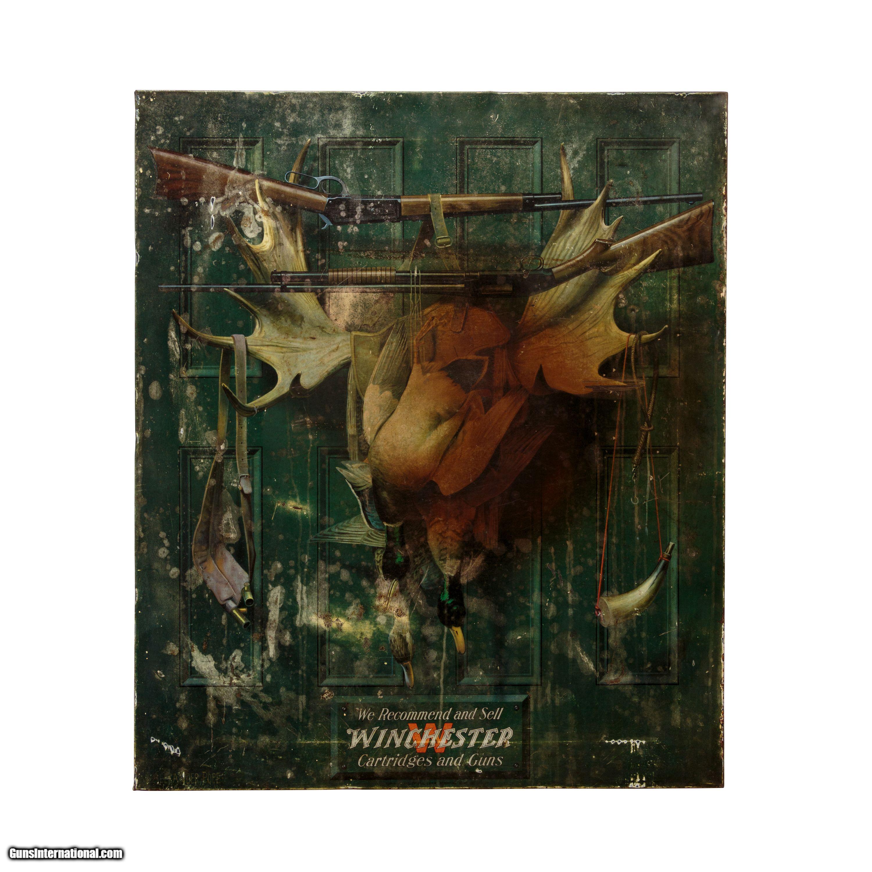 Description: Winchester dealer's tin advertising sign with moose rack, hanging mallards; model 12 and lever action. 30" x 36". Circa early 1900s. SOLD |
