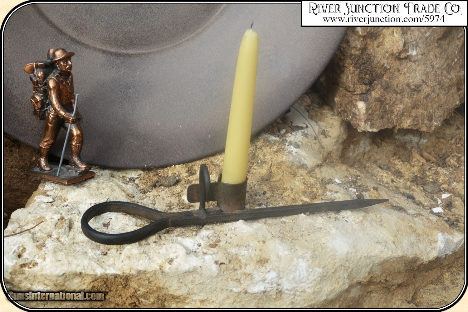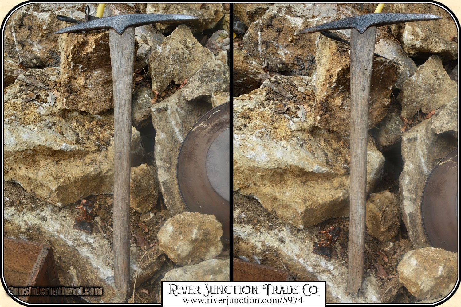 Description: Gold Prospectors Panning and Mining Display. Antique Grasselli Powder Co. Wooden crate. High Explosives Dynamite I.C.C.-14, 50 lb Wooden crate. This antique wooden box is in very good condition for its age. See pictures. All the lettering is all clear and readable. Look at the pictures for more interesting information on this crate. Sticking Tommy miners candle holder. This candle holder is used in may ways. Stuck or hung from a mine timber and even worn on the miners cap. Antique short pick. From the mid 1800s. Measures about 29” long overall, and the head is about 16.1/4” wide. Condition is as seen in photos showing, cracks in the wooden handle, rust on the head, and other wear. Due to the fairly primitive way the head was secured to the handle it is loose. Antique Wood Handle wide bladed shovel. I'm not sure of age, but based upon style I would guess some time in the mid to late 1800's. Overall length is just 37”. Blade is about 9” wide. Shovel is still pretty solid. Gold prospecting pan. Most important and not to be forgotten the pan. About 16”, with a nice rusty patina, but very good condition. Gold miners statue. His pack shows the shovel, pick, Gold pan and other needed utensils. Payment: Item, can be ordered on line with a credit card or paypal on our sight. Just Google (riverjunction) and type in the River Junction Trade Co. item number (5974) in the search box. Before you checkout you will see shipping cost and total. OR If you prefer: Pay by cash, postal money order, cashiers check, personal & business checks. We wait for checks to clear. We always answer questions and entertain offers. Have questions? Call me 563-880-4588. Jim SOLD |