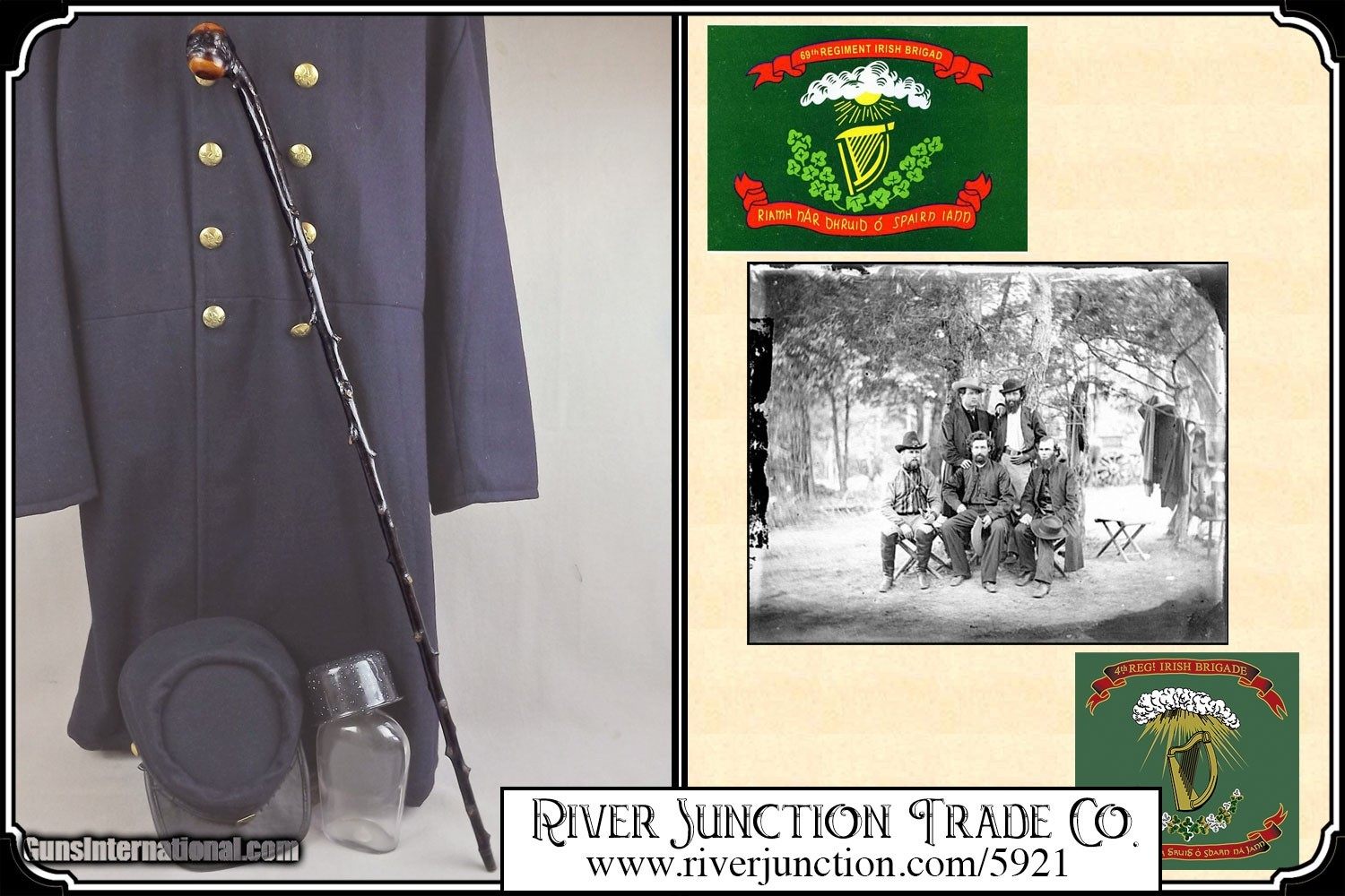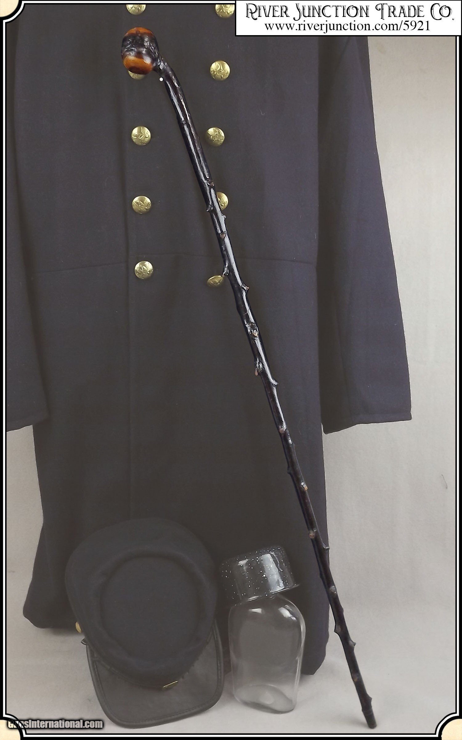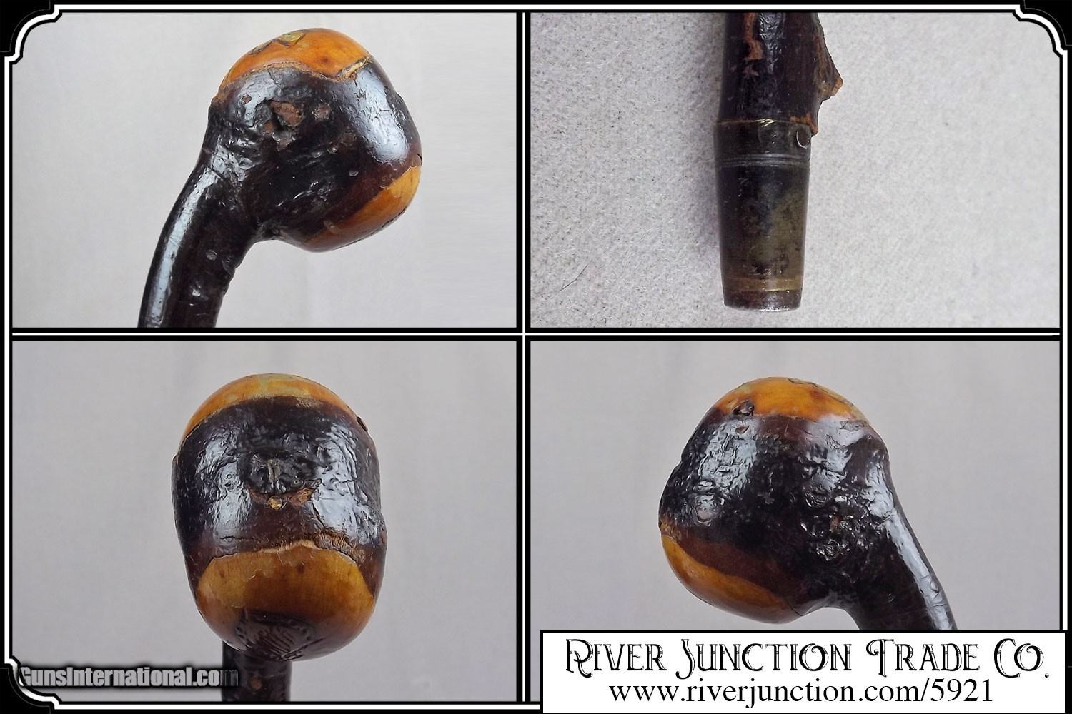 Description: This ANTIQUE FOLK ART cane is a beautiful example in that it is in very nice original antique condition. The hard thorns would serve well to fend off a over protective dog or also used as a defense in the boom towns of the old west and around rough river fronts of the era. The knob head is festooned with the famous IRISH SHAMROCK on its top and on the underside of the knob the IRISH HARP. This old and rare stick measures 35” and weighs less than 1/2 pound. The knob is 2” in diameter. Such items are much sought after by Civil War collectors due to the presents of the Shamrock and Harp symbols of the Irish brigade. This very sturdy cane has 31 hard thorns along the shaft. The cane is very solid with no breaks or cracking. It has a brass metal tip to keep the wood from wearing. The dark black coloring is caused by smoking the wood in the flew of a fireplace causing the wood to harden and darken. Payment: Item, can be ordered on line with a credit card or paypal on our sight. Just Google (riverjunction) and type in the River Junction Trade Co. item number (5921) in the search box. Before you checkout you will see shipping cost and total. OR If you prefer: Pay by cash, postal money order, cashiers check, personal & business checks. We wait for checks to clear. We always answer questions and entertain offers. Have questions? Call me 563-880-4588. Jim SOLD |