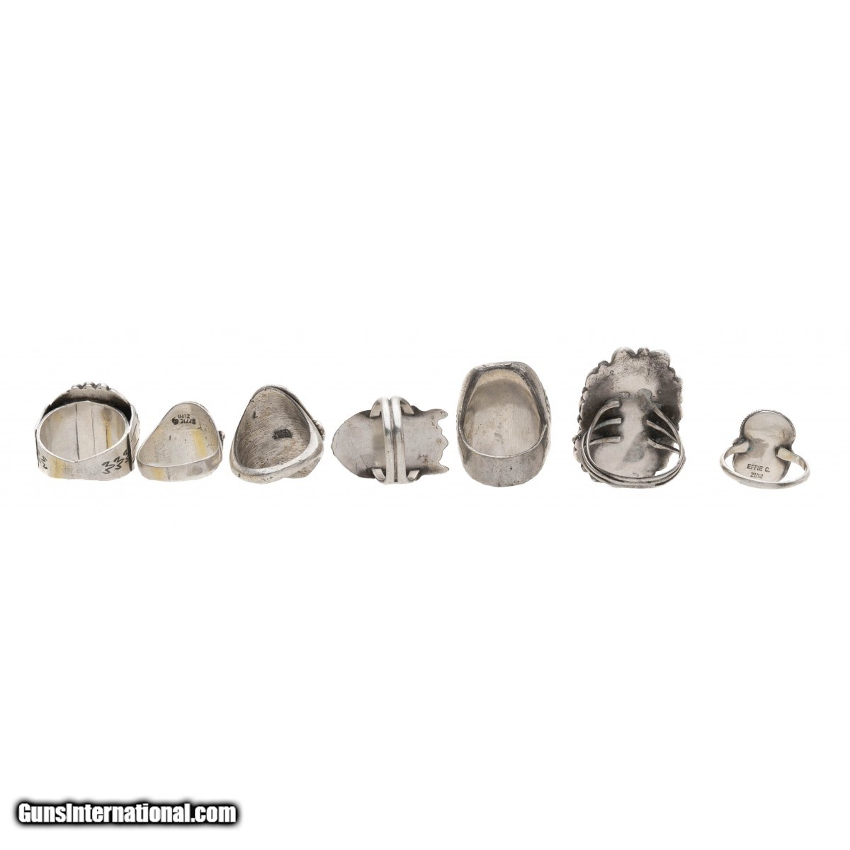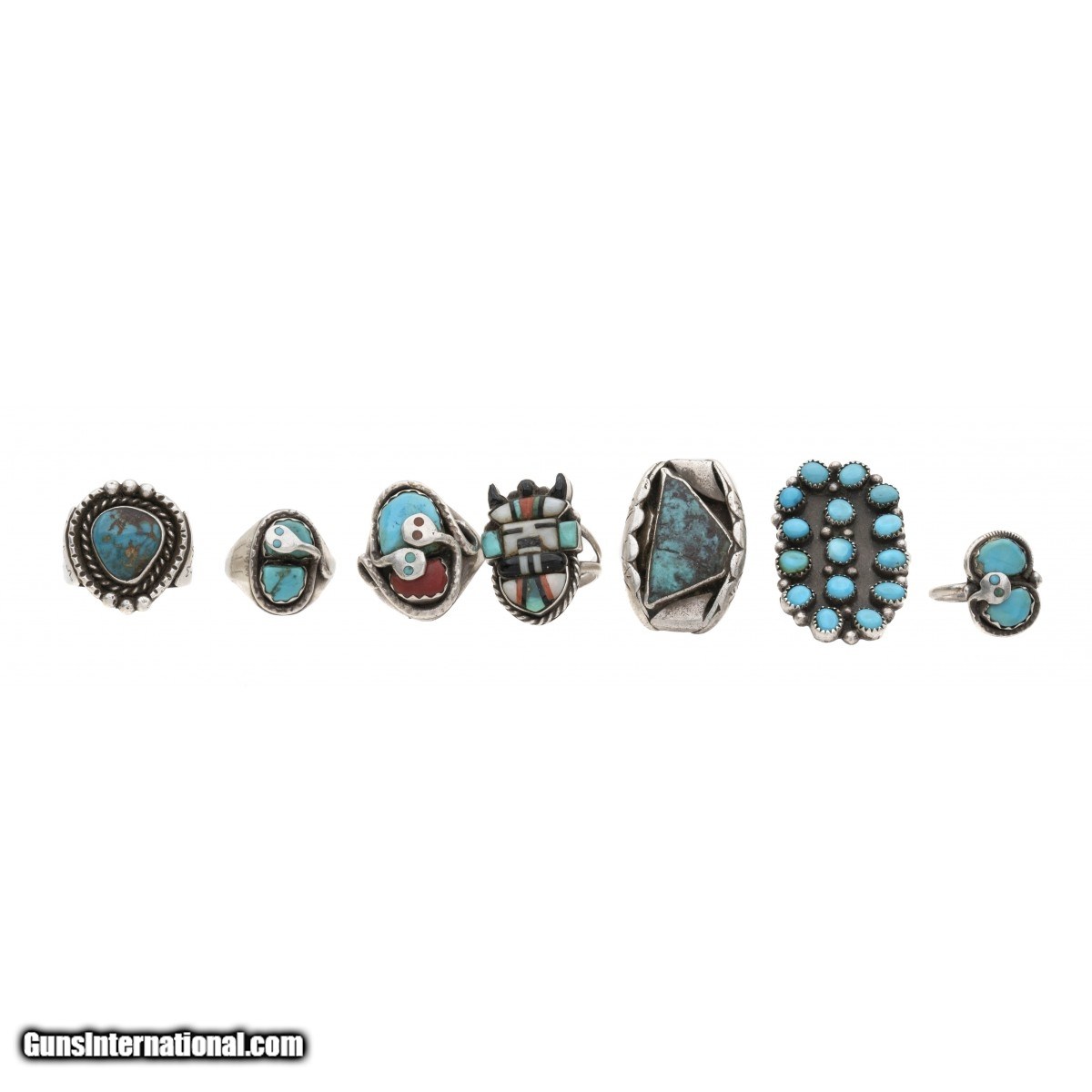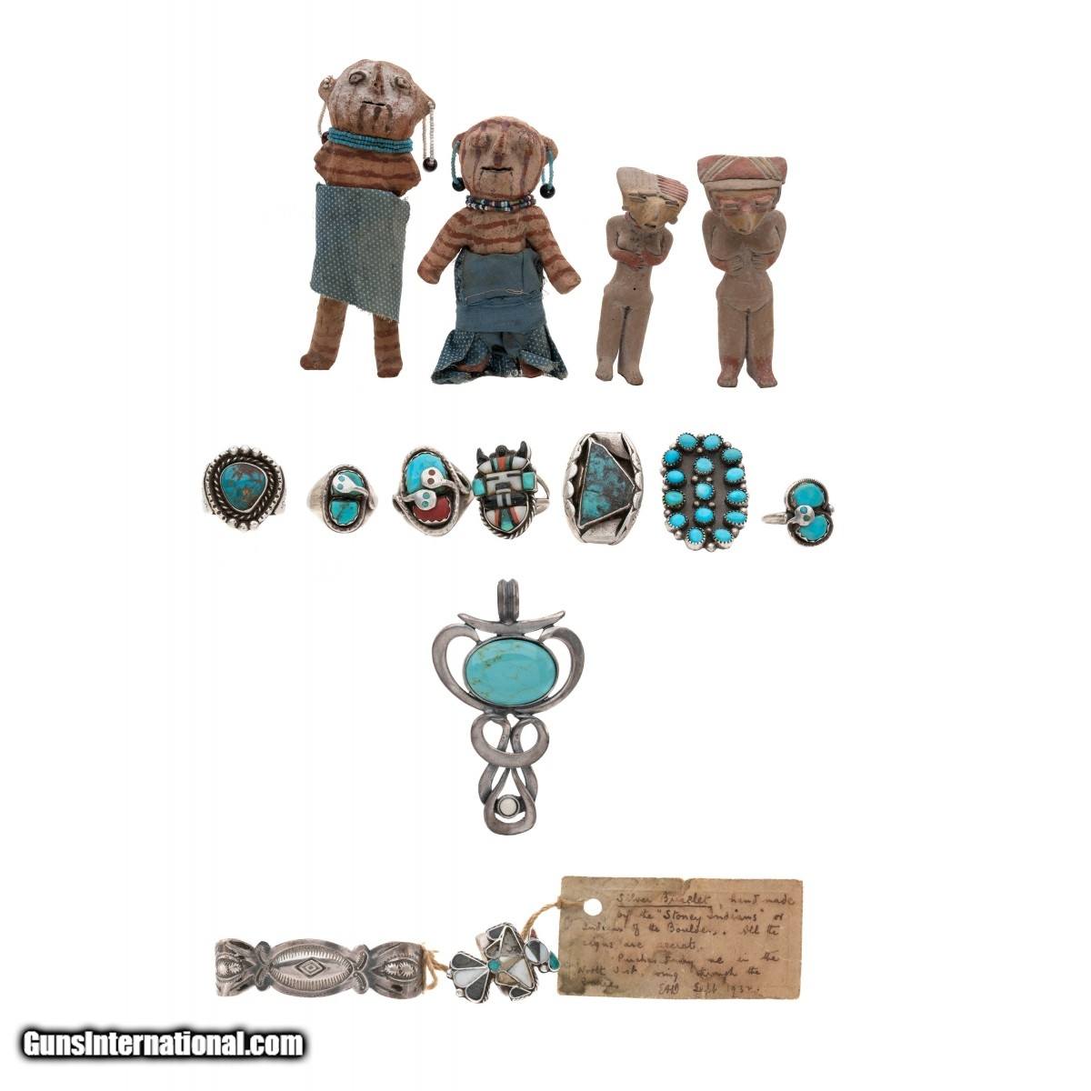 This collection contains 4 Southwestern Indian Pottery Figurines, 7 rings (several marked Zuni), a bracelet and ring attached together with an old tag dated 1934 which says stony Indians and a ring that says “Bagdad 1918" and one broach. There are also numerous cards identifying these pieces, but not attached to which piece.