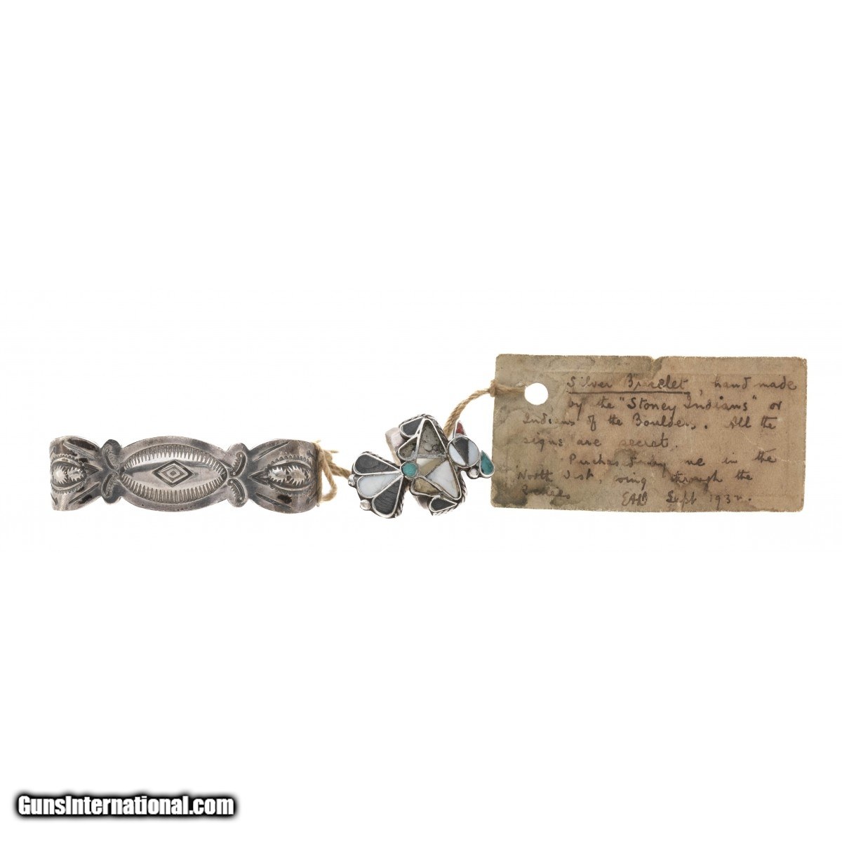 Description: " This collection contains 4 Southwestern Indian Pottery Figurines, 7 rings (several marked Zuni), a bracelet and ring attached together with an old tag dated 1934 which says stony Indians and a ring that says “Bagdad 1918" and one broach. There are also numerous cards identifying these pieces, but not attached to which piece. SOLD |