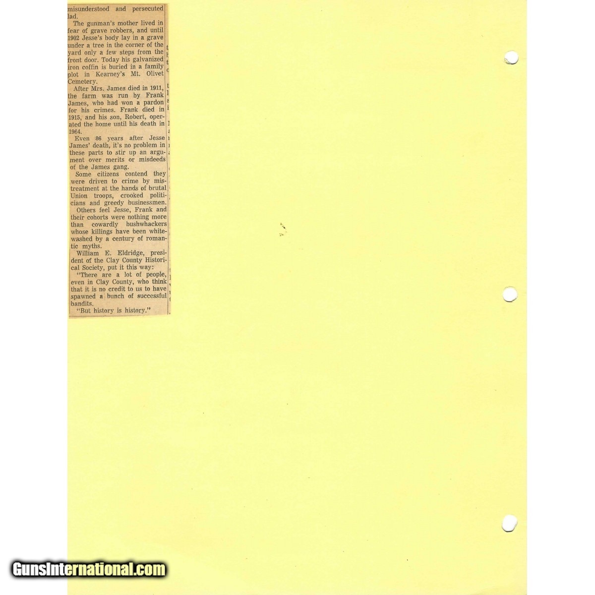 Newspaper clippings from the Observer Reporter Washington, PA dated October 16th 1968. The clippings are about restoring the Jesse James Home. This item / These items came from John Flood who was Wyatt and Sadie Earp’s personal Secretary and closest confidant. Mr. Flood even wrote a biography on Wyatt Earp that was never published. He was given and inherited numerous items from the Earp’s. Mr. Flood in turn passed the Earp collection on to John Gilchriese. Mr. Gilchriese owned and operated The Wyatt Earp Museum in Tombstone, AZ, where all of these items were displayed. These items were sold directly by Mr. Gilchriese to David Roberts along with Mr. Gilchriese’s notes on each item. Each item comes with a certificate of authenticity from Collectors Firearms.