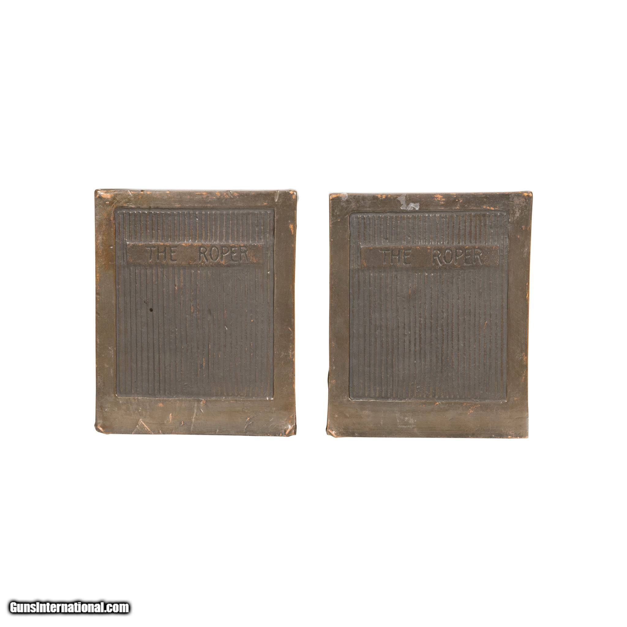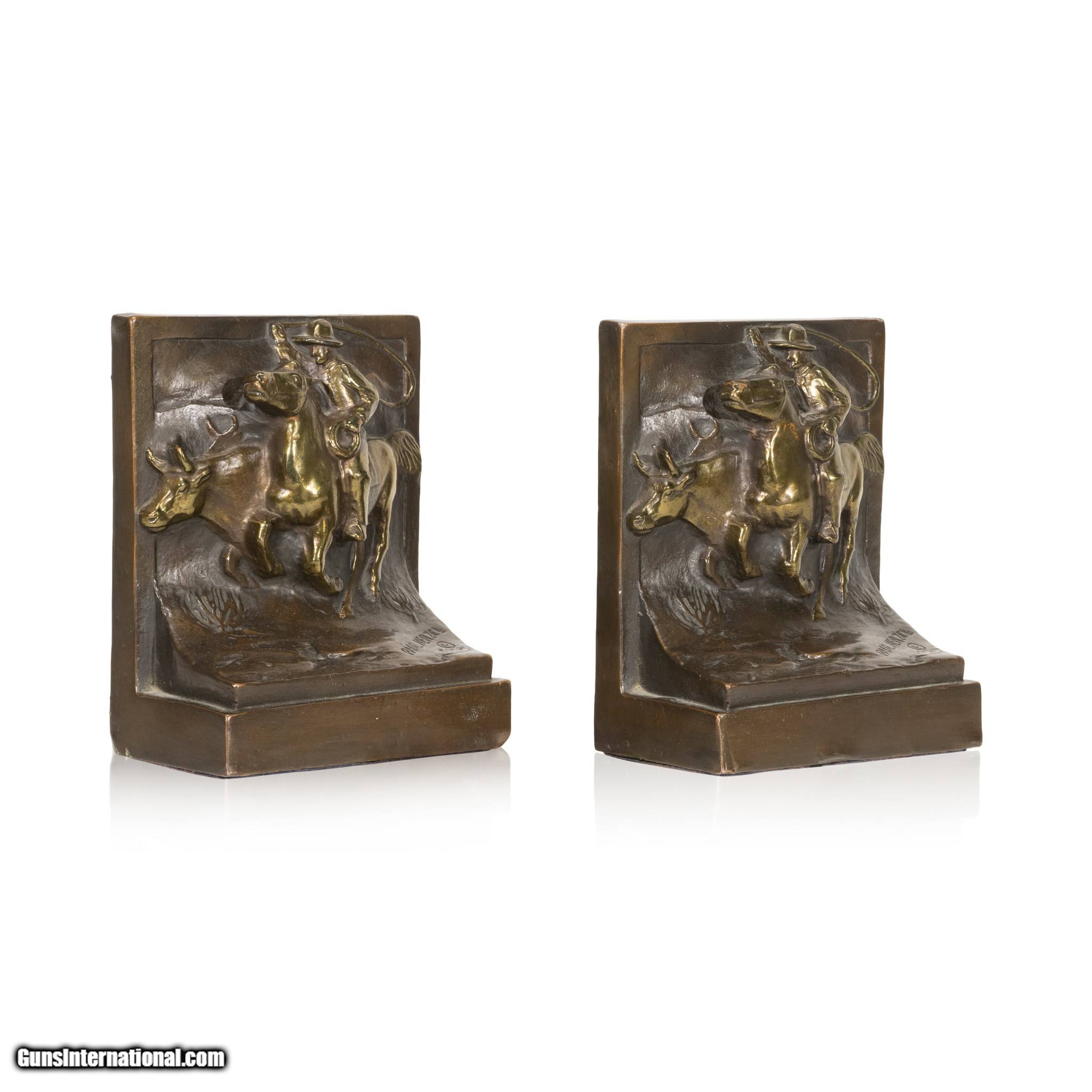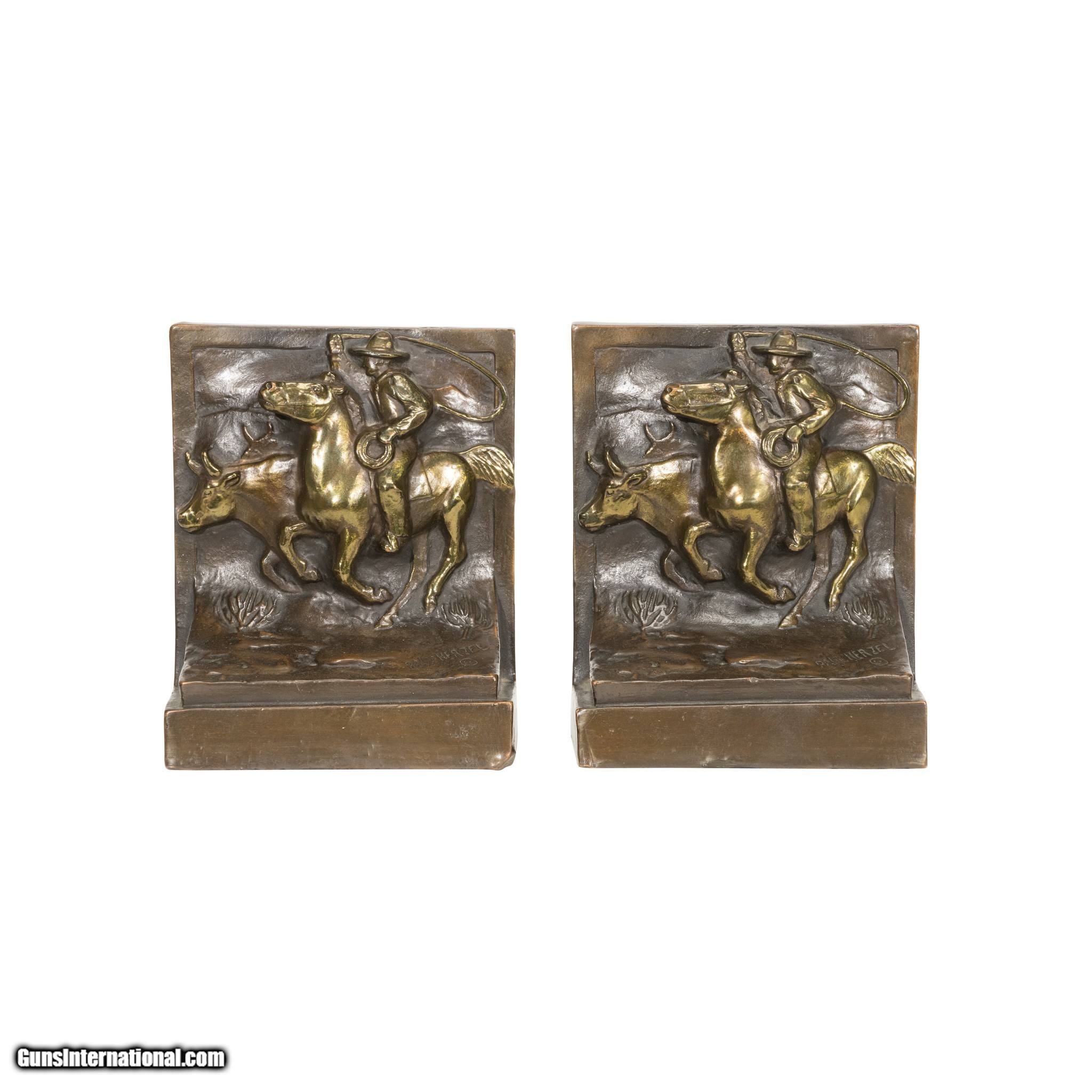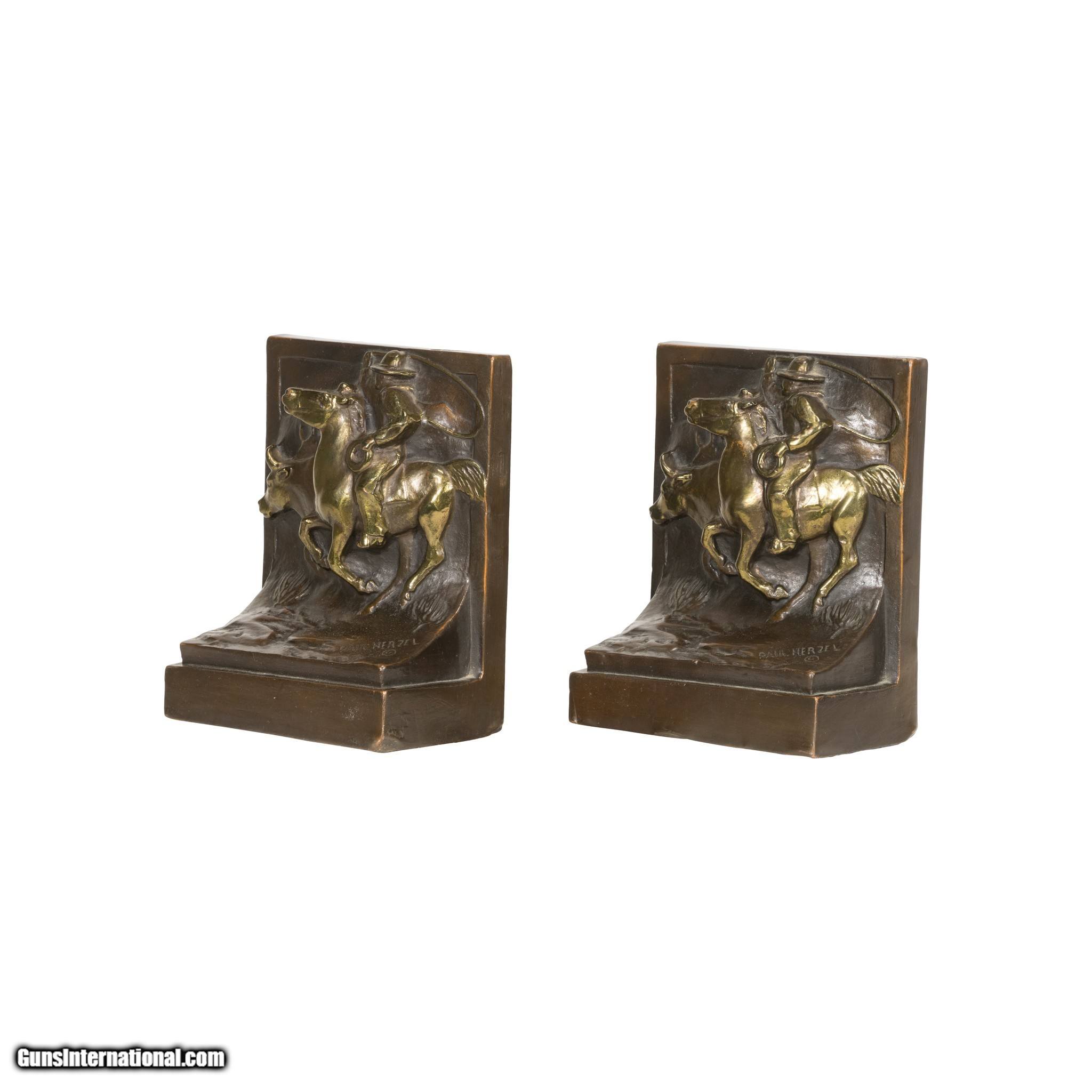 Description: (1876 - 1956) "The Roper" bookends by Paul Herzel. Bookends portray a sowboy on horseback roping a steer. Set of antique bookends that would be perfect for the Western or cowboy reader and bibliophile. Size: 5"W x 6"H x 2 1/2"D SOLD |