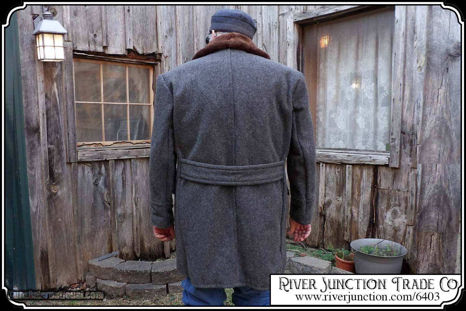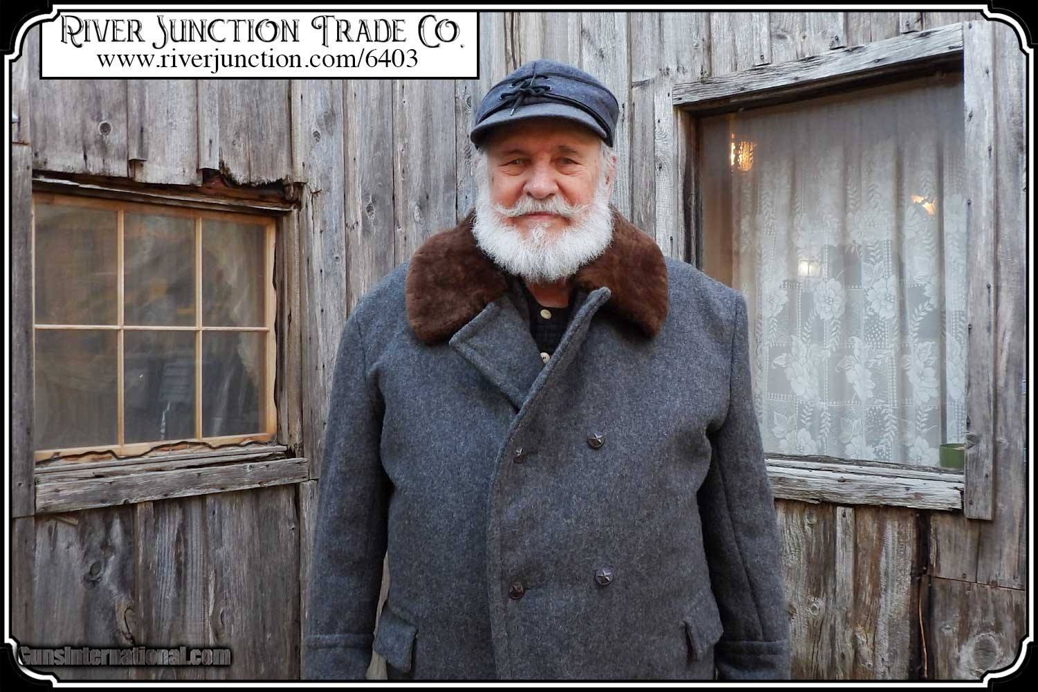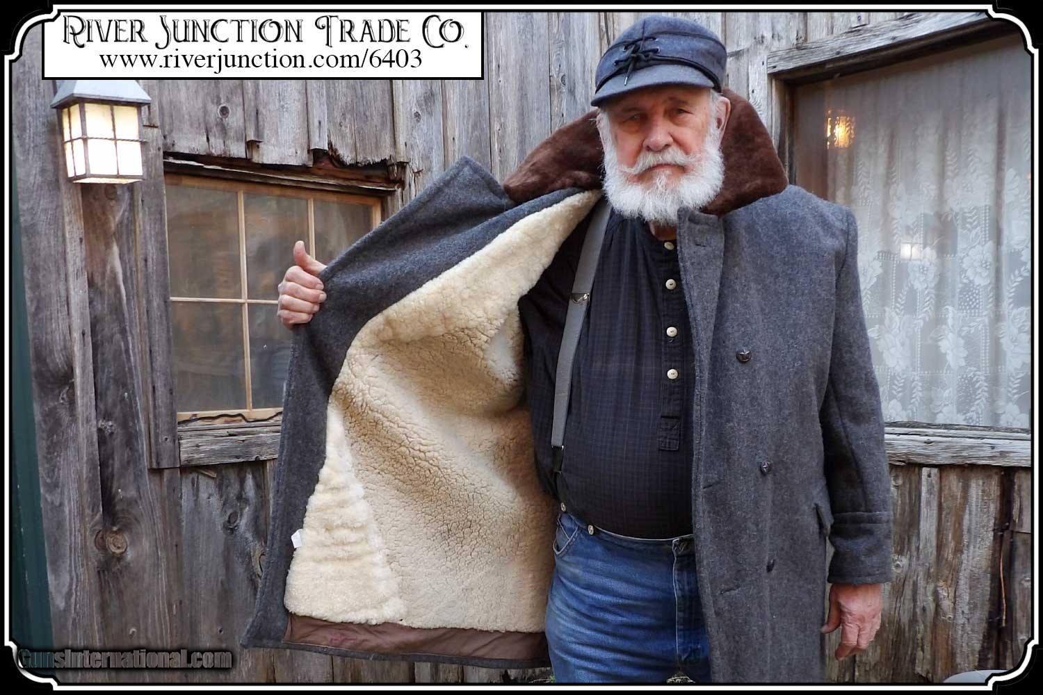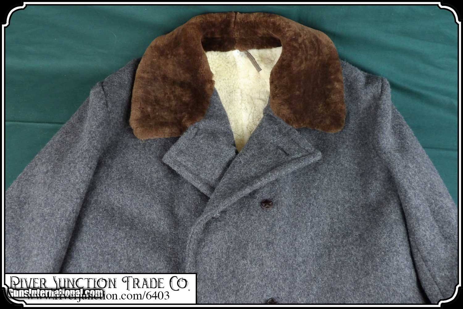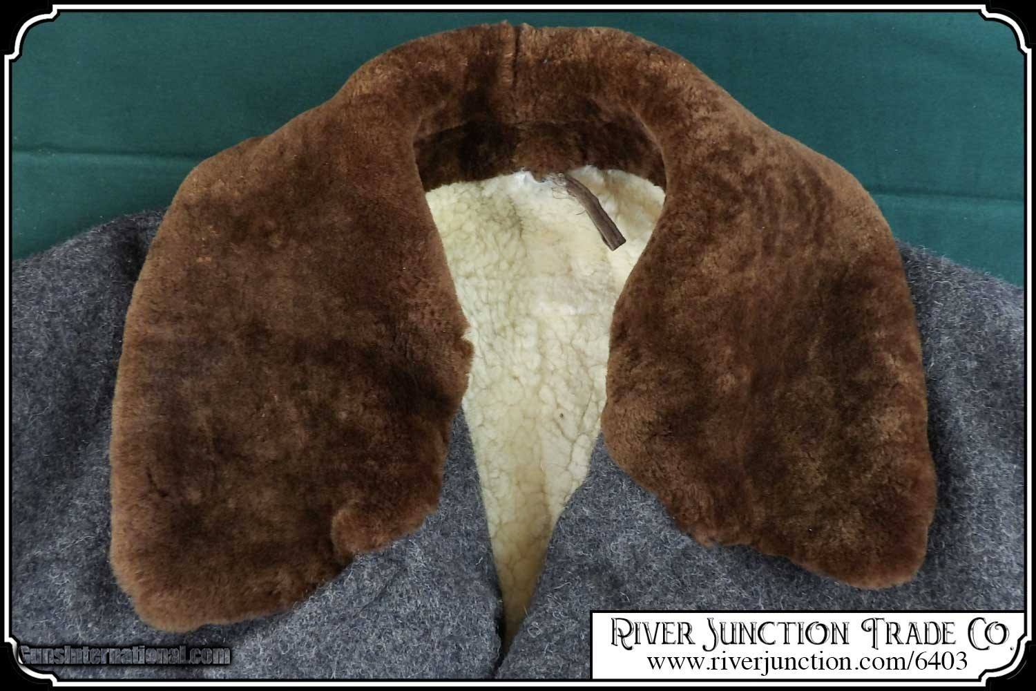 Description: The toughest "NORTH TO ALASKA" coat on earth, designed for hard use with comfort in winter and in the far north. This coat pattern is an authentic cut as seen in the Klondike gold rush and worn by the line rider of northern Montana. Similar in design to our wool Mackinaw but with sheep lining. The outer shell is made of 100 % wool, finished off with a dark brown mouton collar. This is a very warm, ruff n' tuff coat for hard-use. Just the thing for the well supplied gold rush adventurer. A true heirloom product that will be admired by all. Outer wool colors deep grey. Fits USA Sizes 48, 50 and 52 Payment: Item, can be ordered on line with a credit card or paypal on our sight. Just Google (riverjunction) and type in the River Junction Trade Co. item number (6403) in the search box. Before you checkout you will see shipping cost and total. OR If you prefer: Pay by cash, postal money order, cashiers check, personal & business checks. We wait for checks to clear. We always answer questions and entertain offers. Have questions? Call me 563-880-4588. Jim SOLD |